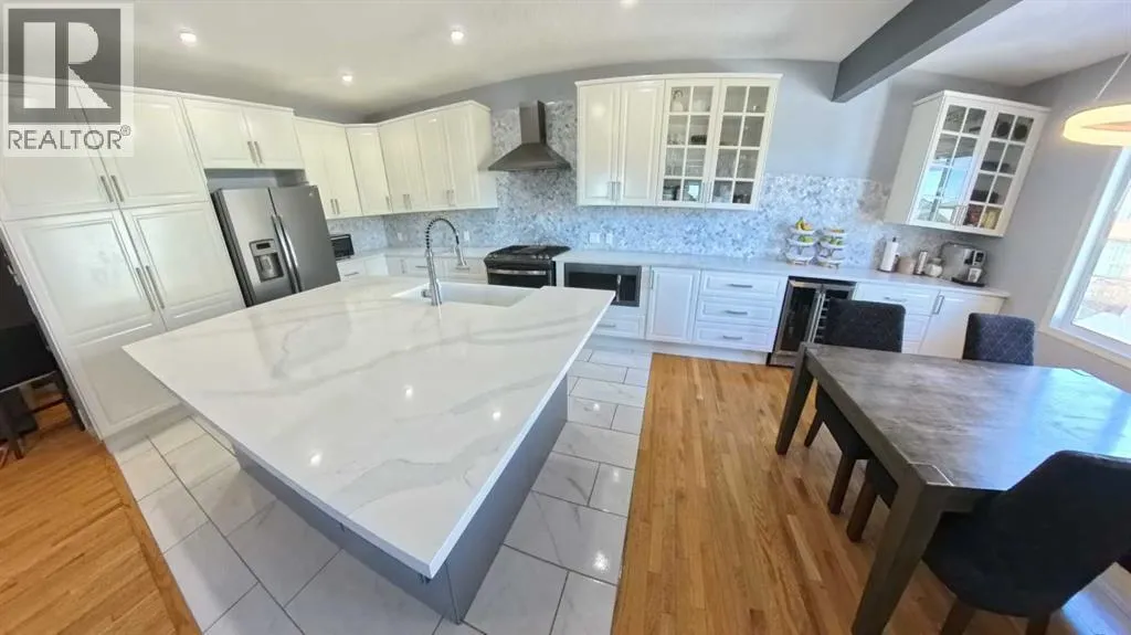 Spacious, move-in-ready family home offering 3,300+ sq ft of fully developed living space, perfectly positioned next to a green strip with only one neighbour, a rare combination of privacy, light, and open space. With 5 bedrooms plus a den, this home is built for family living, giving everyone room to spread out while keeping the layout practical and connected. At the center of it all is a true family-sized kitchen for people who love to cook and gather. Thoughtfully modernized and designed for high-traffic days, it features a huge breakfast bar and an extended countertop that easily handles big meals, baking projects, and hosting. Enjoy the convenience of a built-in wine fridge, plus a dedicated morning coffee area that keeps the daily routine organized and effortless. With generous prep space and an open, welcoming feel, this kitchen is made for everything from weeknight dinners to holiday entertaining. Comfort is covered year-round with air conditioning, and day-to-day convenience shines with hot water on demand. Storage is also a standout: the 2-car garage includes plenty of customized storage, and the utility room offers additional built-in organizationâperfect for keeping seasonal items, tools, sports gear, and household supplies neatly out of sight. Downstairs, the fully developed walkout basement adds bright, flexible living space with direct backyard accessâideal for a media room, play zone, teen hangout, guest area, or home gym. Step outside to enjoy your private outdoor setup, featuring a covered deck that extends your living and or storage space. Unwind year-round in the hot tub, and for pet owners, appreciate the practicality of a dedicated dog run. The zero-scaped yard keeps maintenance low, so you spend more time enjoying the home and less time on yard work. Location adds even more value: school buses for all grades stop just steps from the house, making mornings and after-school routines simple. With exceptional square footage, smart upgrades, priv acy beside the green strip, and family-first features throughout, this home delivers the space, comfort, and lifestyle youâve been looking for. (id:27476)