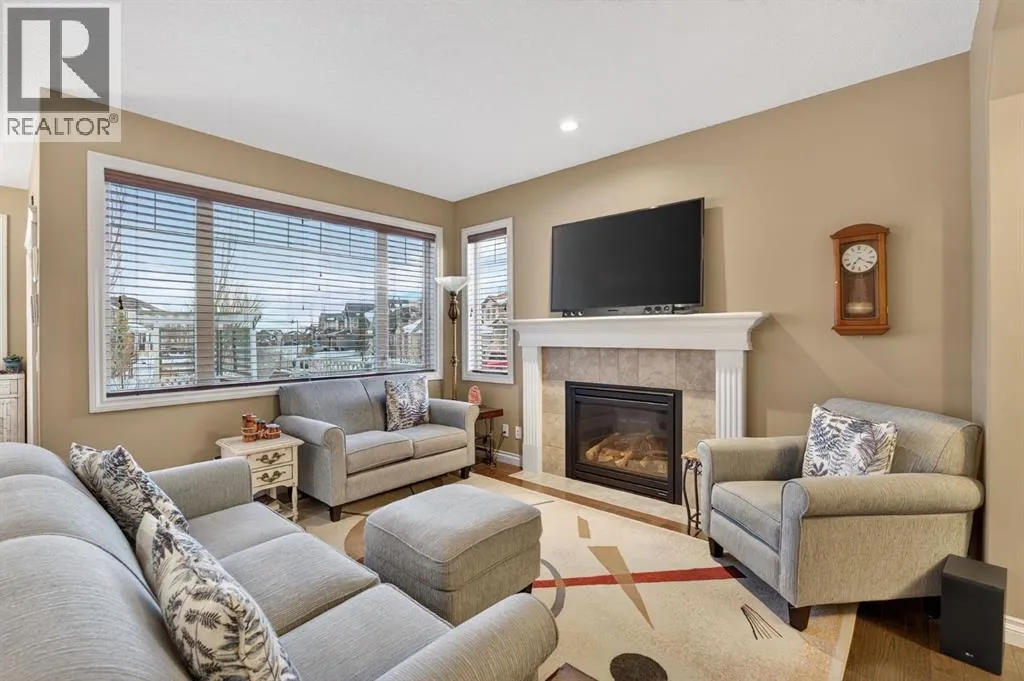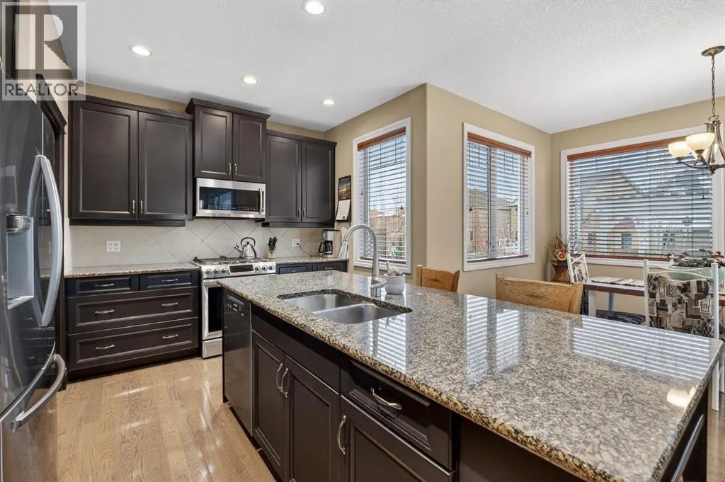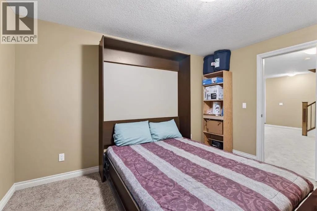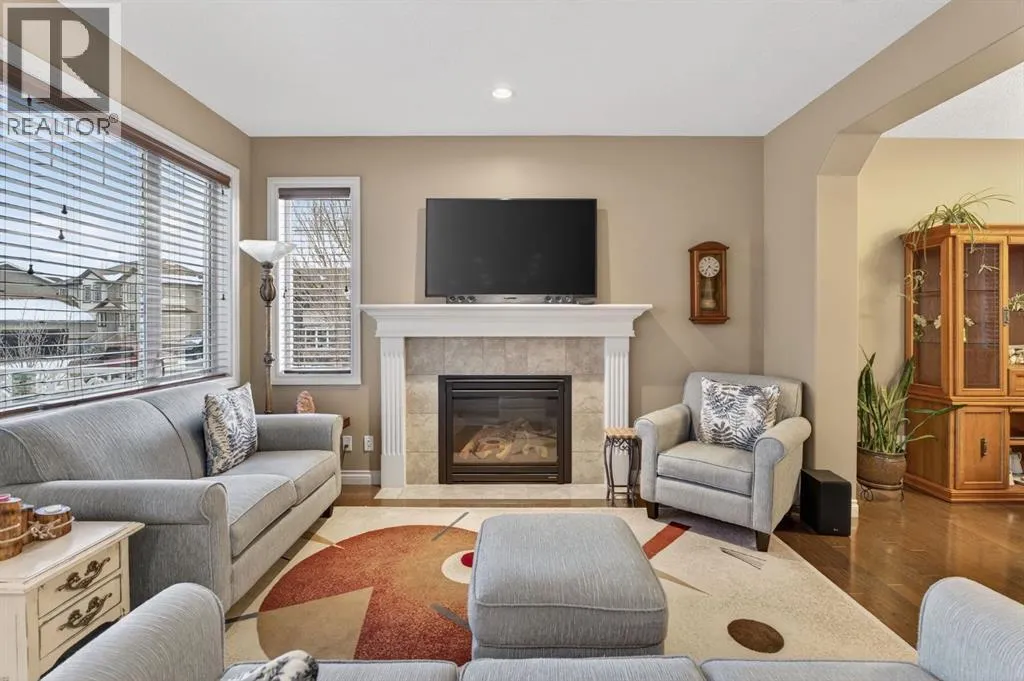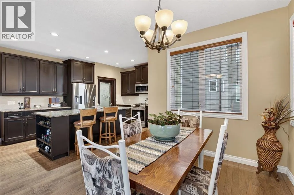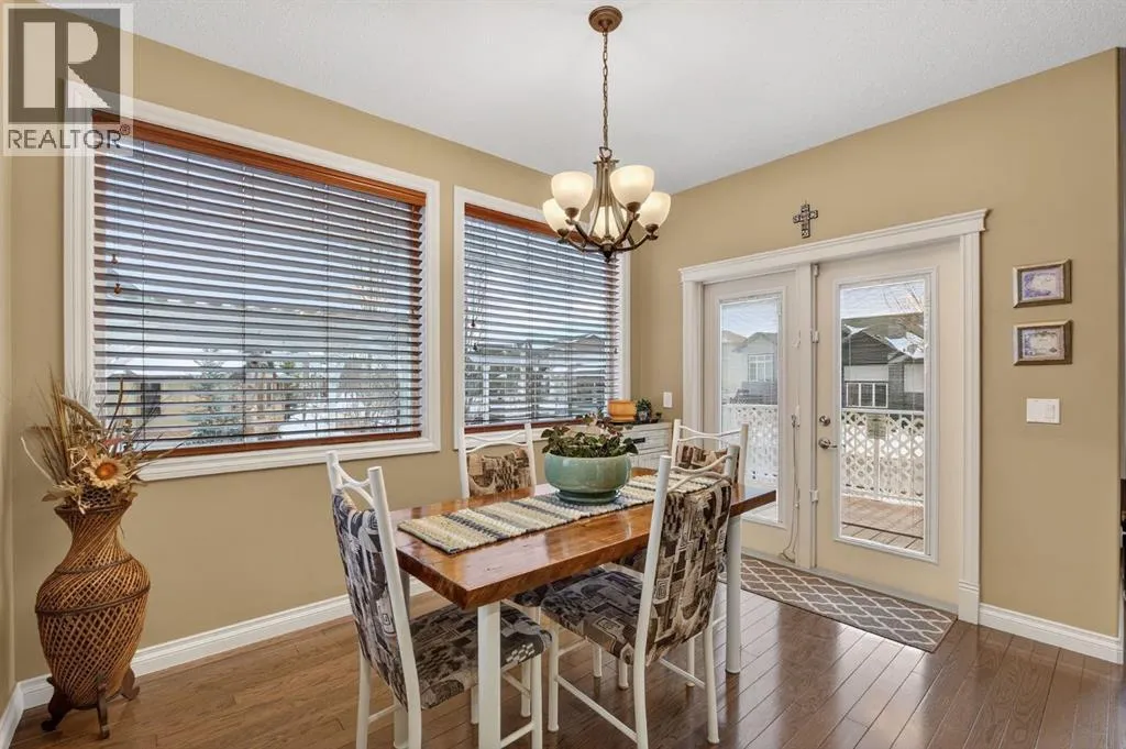 Welcome to this beautifully maintained two-storey home in the highly sought-after community of Air Ranch in Okotoks. Offering over 2,900 sq ft of developed and air conditioned living space on a desirable 7300+ sq ft corner lot . This spacious home is fully loaded with thoughtful upgrades, a functional layout, and a sunny south-facing backyard. It is perfectly designed for comfortable family living and entertaining. Step inside to a bright and inviting main floor featuring an open-concept design with large windows outfitted with Hunter Douglas window treatments that flood the space with beautiful natural light. The spacious living room is anchored by a cozy gas fireplace, creating the perfect place to unwind. The kitchen is both stylish and practical, complete with a large island, granite counter tops, an upgraded stainless steel appliance package including a gas stove, a generous sized walk-through pantry, and ample elegant cabinetry, seamlessly connecting to the breakfast nook and providing easy access to the backyard. A convenient mudroom adds everyday functionality with a storage bench . Upstairs, youâll find a generous bonus room outfitted with an inviting corner gas fireplace, making this an ideal place for a family hangout, media space, or playroom. There are three good sized bedrooms that offer beautiful mountain views. The primary suite provides a relaxing retreat with a spacious walk-in closet and a luxurious 5-piece ensuite featuring dual vanities, a soaking tub, and an elegant fully tiled shower and extra storage. A full 4-piece bathroom and convenient upper-level laundry that hosts front load washer and dryer and a convenient laundry sink that is accessible to the primary closet complete this floor. The builder designed and professionally developed basement expands your living space with a spacious recreation room featuring a custom wet bar, an additional bedroom with a murphy bed, and a 3-piece bathroom making it a great space for guests or extra livin g space. The outside of the home is a standout feature allowing you to enjoy the fully fenced south-facing backyard showcasing a spacious two-tiered deck with a gas line for BBQ, ideal for summer gatherings and family fun and a shed for convenient storage of yard tools. The extra wide driveway offers an abundance of additional parking options. The spacious double attached garage is ideal for the car enthusiast, hobbyist, or organized homeowner, featuring epoxy floors, heavy duty overhead storage, and a custom Proslat wall organization. Extra bonuses include a Kinetico water softener and vacuflo central vacuum system. This fabulous home is located close to walking paths, parks, and all the great amenities, this home offers the perfect balance of space, comfort, and location. Donât miss your chance to see this one today. (id:27476)