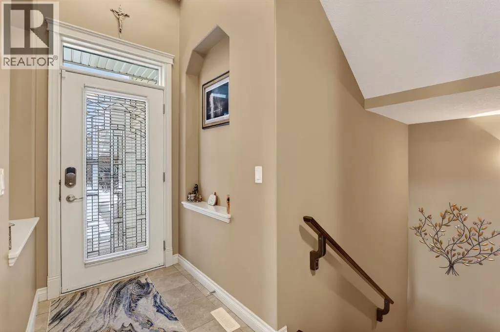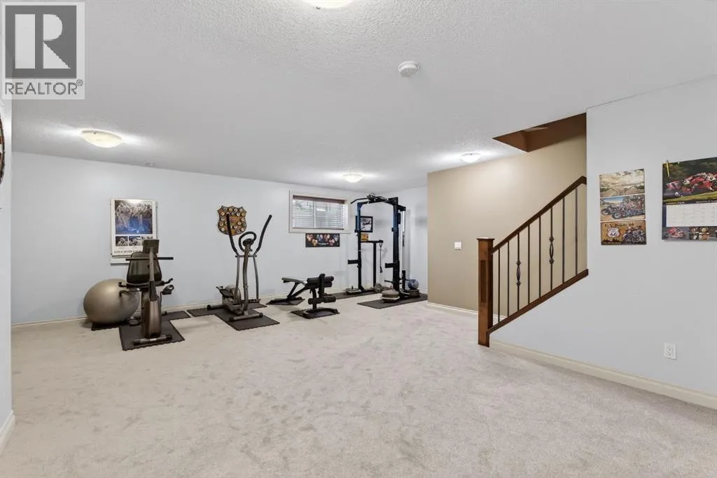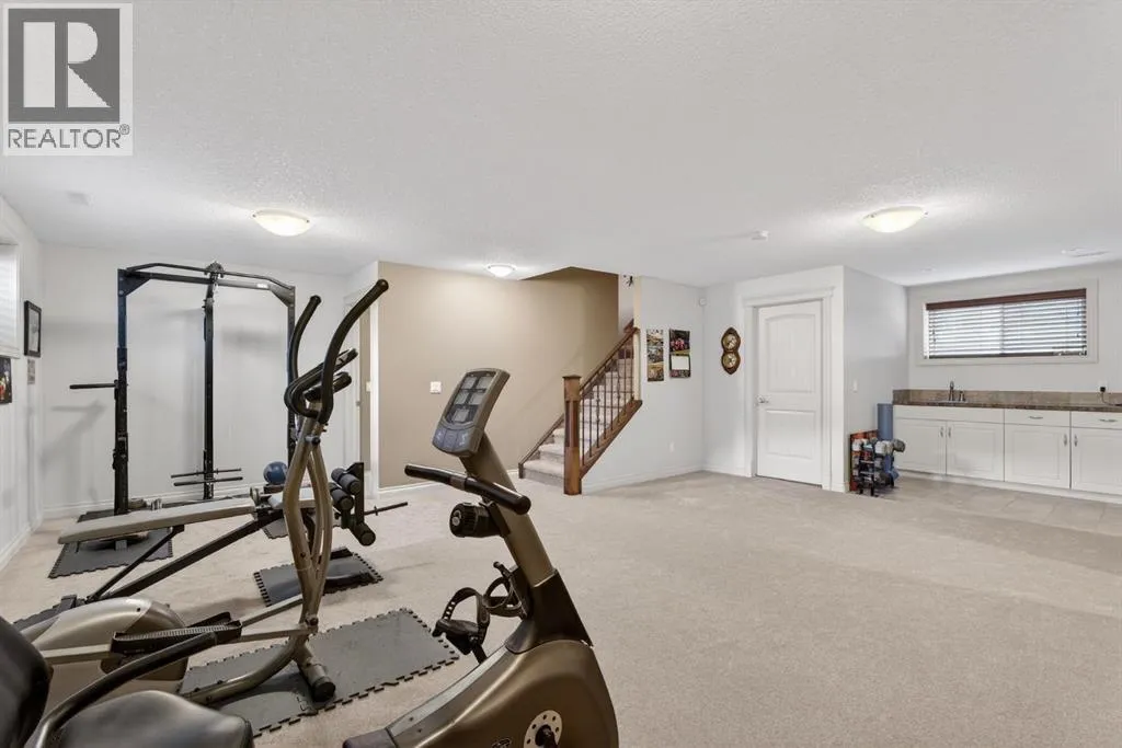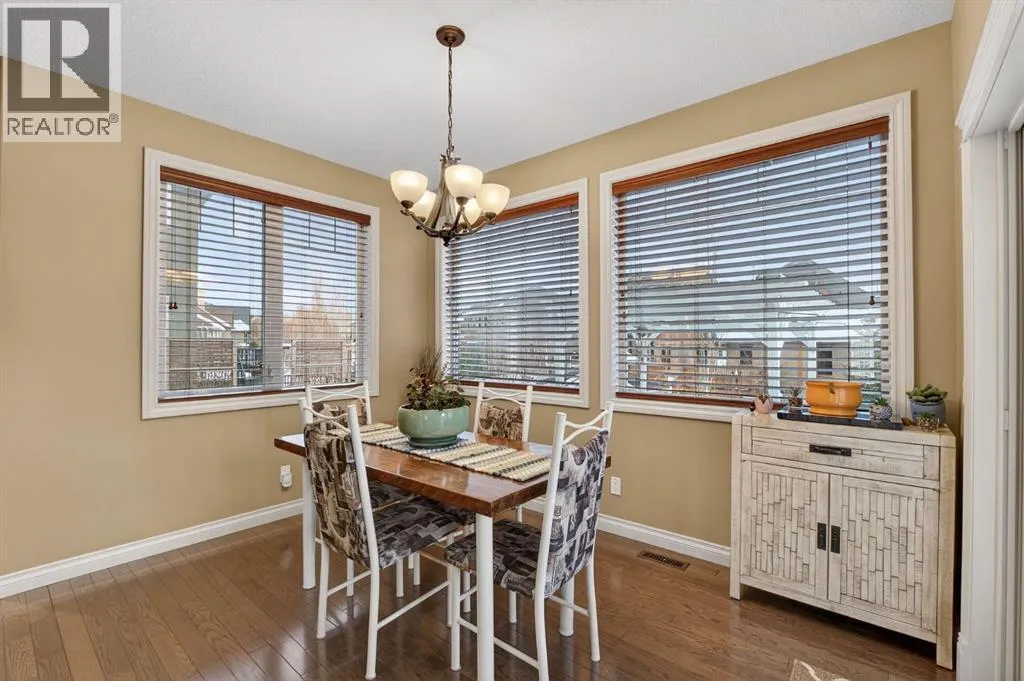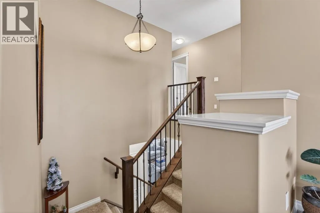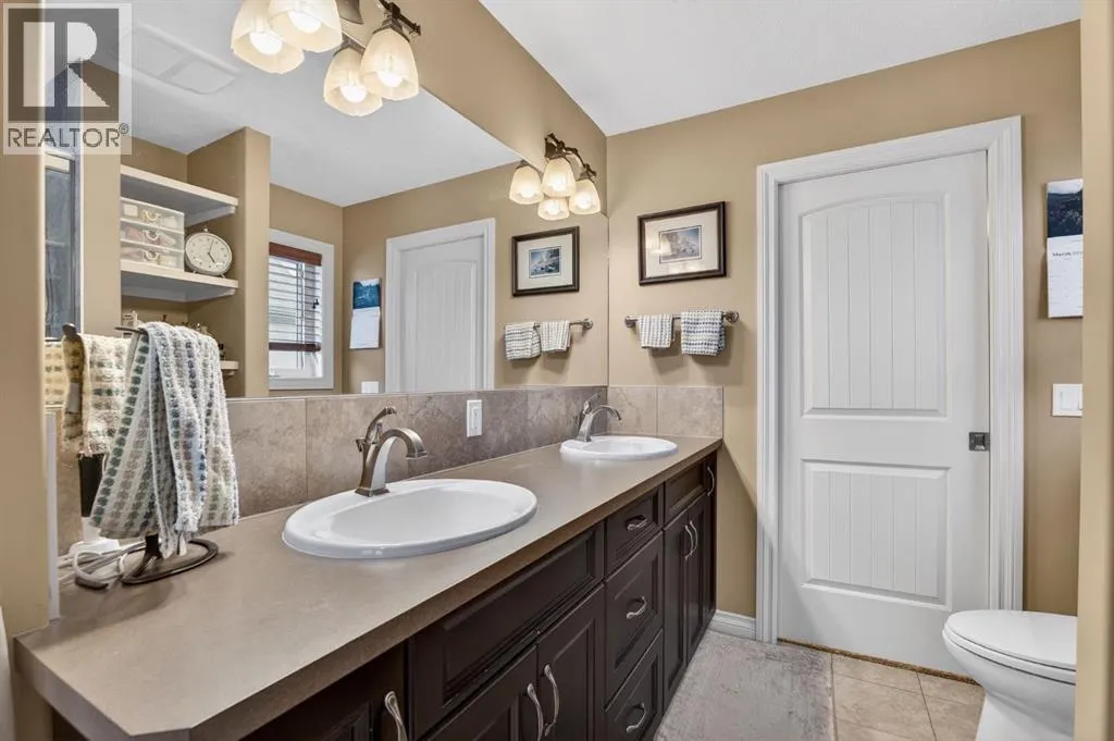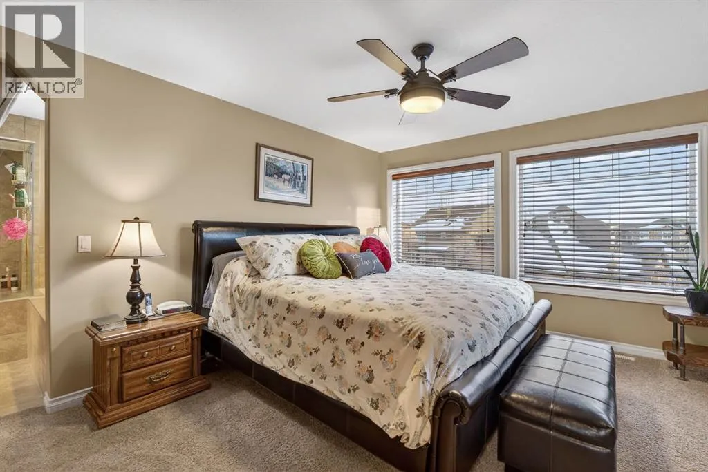 Welcome to this beautifully maintained two-storey home in the highly sought-after community of Air Ranch in Okotoks. Offering over 2,900 sq ft of developed and air conditioned living space on a desirable 7300+ sq ft corner lot . This spacious home is fully loaded with thoughtful upgrades, a functional layout, and a sunny south-facing backyard. It is perfectly designed for comfortable family living and entertaining. Step inside to a bright and inviting main floor featuring an open-concept design with large windows outfitted with Hunter Douglas window treatments that flood the space with beautiful natural light. The spacious living room is anchored by a cozy gas fireplace, creating the perfect place to unwind. The kitchen is both stylish and practical, complete with a large island, granite counter tops, an upgraded stainless steel appliance package including a gas stove, a generous sized walk-through pantry, and ample elegant cabinetry, seamlessly connecting to the breakfast nook and providing easy access to the backyard. A convenient mudroom adds everyday functionality with a storage bench . Upstairs, youâll find a generous bonus room outfitted with an inviting corner gas fireplace, making this an ideal place for a family hangout, media space, or playroom. There are three good sized bedrooms that offer beautiful mountain views. The primary suite provides a relaxing retreat with a spacious walk-in closet and a luxurious 5-piece ensuite featuring dual vanities, a soaking tub, and an elegant fully tiled shower and extra storage. A full 4-piece bathroom and convenient upper-level laundry that hosts front load washer and dryer and a convenient laundry sink that is accessible to the primary closet complete this floor. The builder designed and professionally developed basement expands your living space with a spacious recreation room featuring a custom wet bar, an additional bedroom with a murphy bed, and a 3-piece bathroom making it a great space for guests or extra livin g space. The outside of the home is a standout feature allowing you to enjoy the fully fenced south-facing backyard showcasing a spacious two-tiered deck with a gas line for BBQ, ideal for summer gatherings and family fun and a shed for convenient storage of yard tools. The extra wide driveway offers an abundance of additional parking options. The spacious double attached garage is ideal for the car enthusiast, hobbyist, or organized homeowner, featuring epoxy floors, heavy duty overhead storage, and a custom Proslat wall organization. Extra bonuses include a Kinetico water softener and vacuflo central vacuum system. This fabulous home is located close to walking paths, parks, and all the great amenities, this home offers the perfect balance of space, comfort, and location. Donât miss your chance to see this one today. (id:27476)