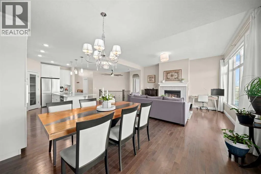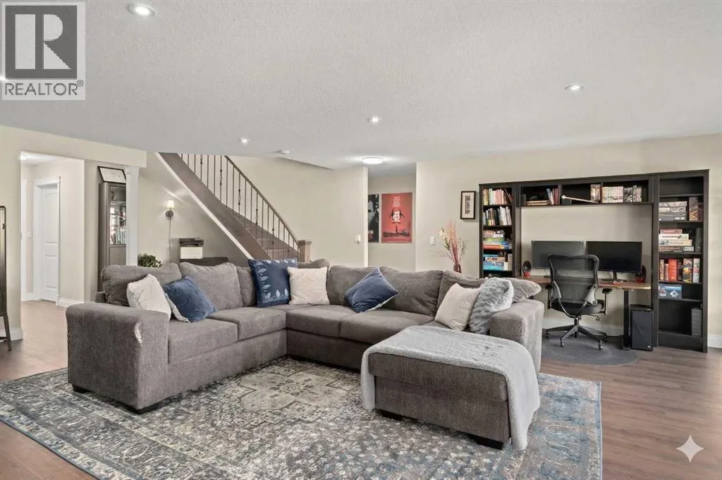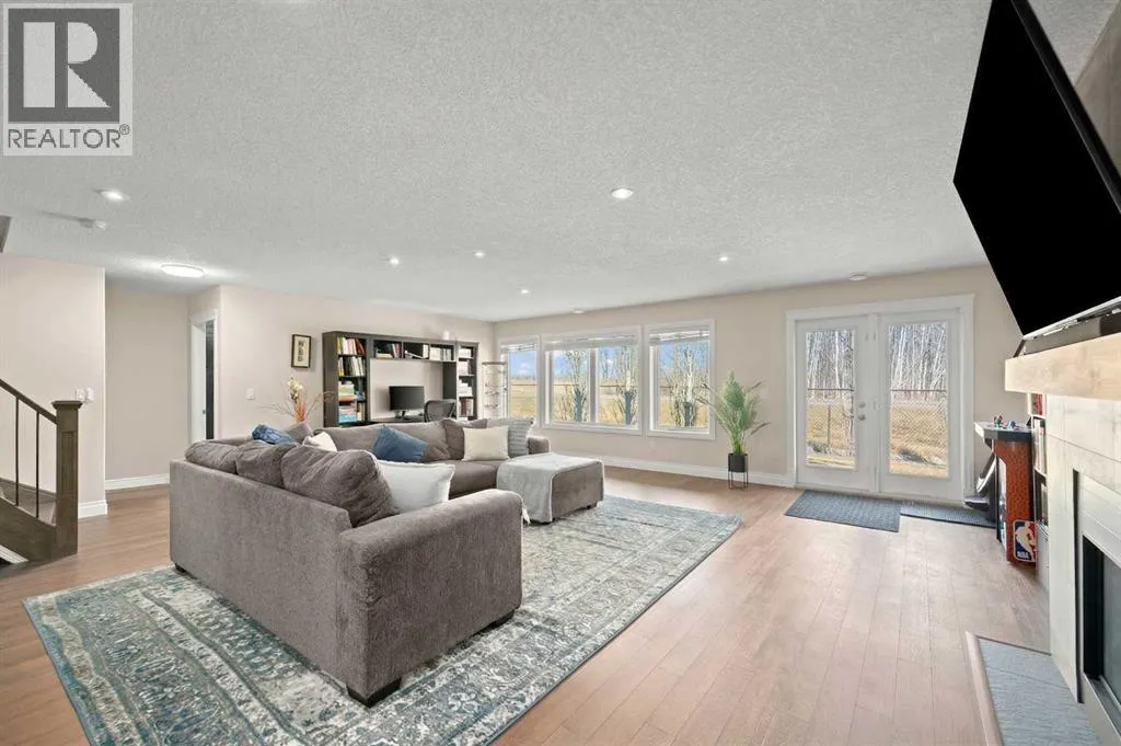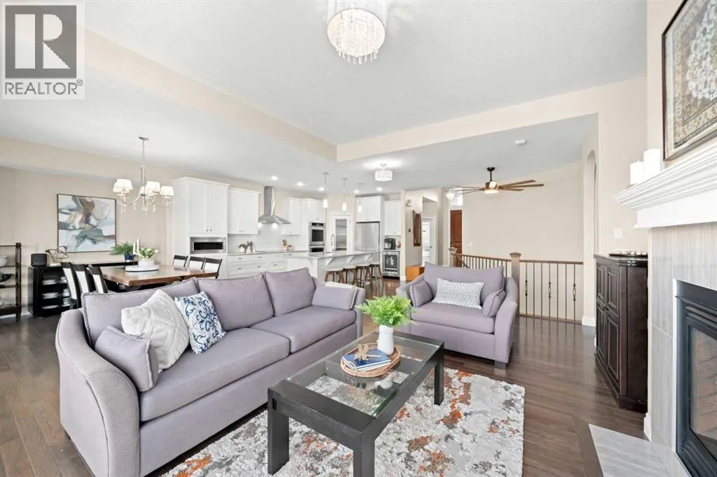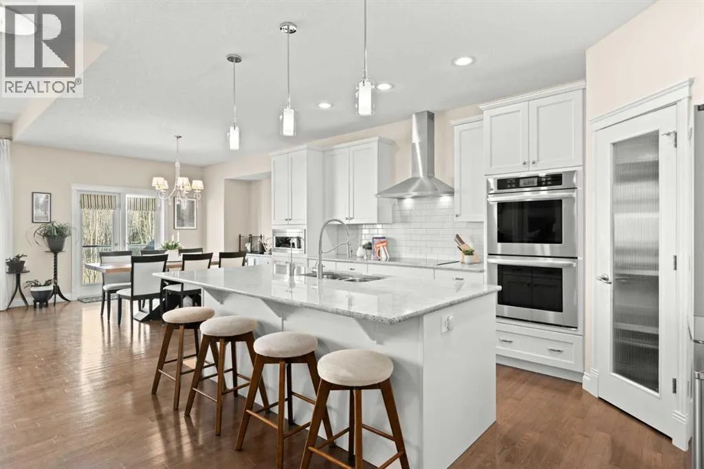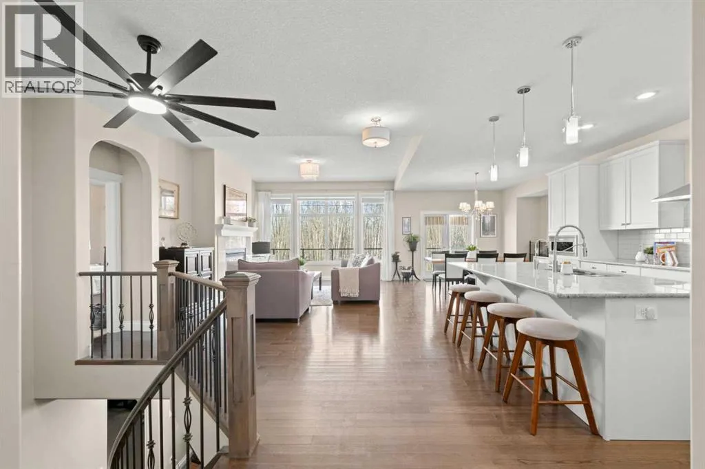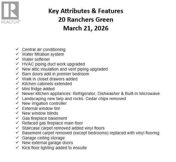 Welcome to a home that just feels right the moment you walk in.Tucked quietly into a cul de sac in Air Ranch, this beautifully maintained walkout bungalow offers a sense of ease and comfort that is felt in every space. From the warm hardwood floors underfoot to the natural light that fills the main living area, this home invites you to slow down and stay awhile.The kitchen naturally becomes the heart of the home, with a generous island where morning coffees turn into after school catch ups and evenings flow seamlessly into time with family and friends. Just beyond, the living space opens onto a full width upper deck, perfect for quiet mornings, summer evenings, and everything in between.And then there is the walkout level, a true extension of the home.With two spacious bedrooms, a full bathroom, and a large inviting rec room, it creates the perfect retreat for teens to call their own. Movie nights, study space, and friends coming and going with the ease of direct access to the backyard. The included Murphy bed adds flexibility for guests or a home office when needed.Step outside to a covered patio and a beautifully sized pie shaped lot where life flows effortlessly indoors and out. It is easy to imagine long summer evenings, kids moving freely, and quiet moments under the stars.This home also offers thoughtful upgrades that make everyday living that much better, including permanent exterior gemstone lighting that adds year round ambiance, air conditioning for warm summer days, irrigation to keep the yard looking its best, and a water softener for added comfort.An oversized garage provides plenty of room for vehicles, storage, or hobbies.Move in ready and designed for real life, this is a home where families grow, where teens have space to thrive, and where everyday moments feel just a little more special.Welcome to 20 Ranchers Green. (id:27476)