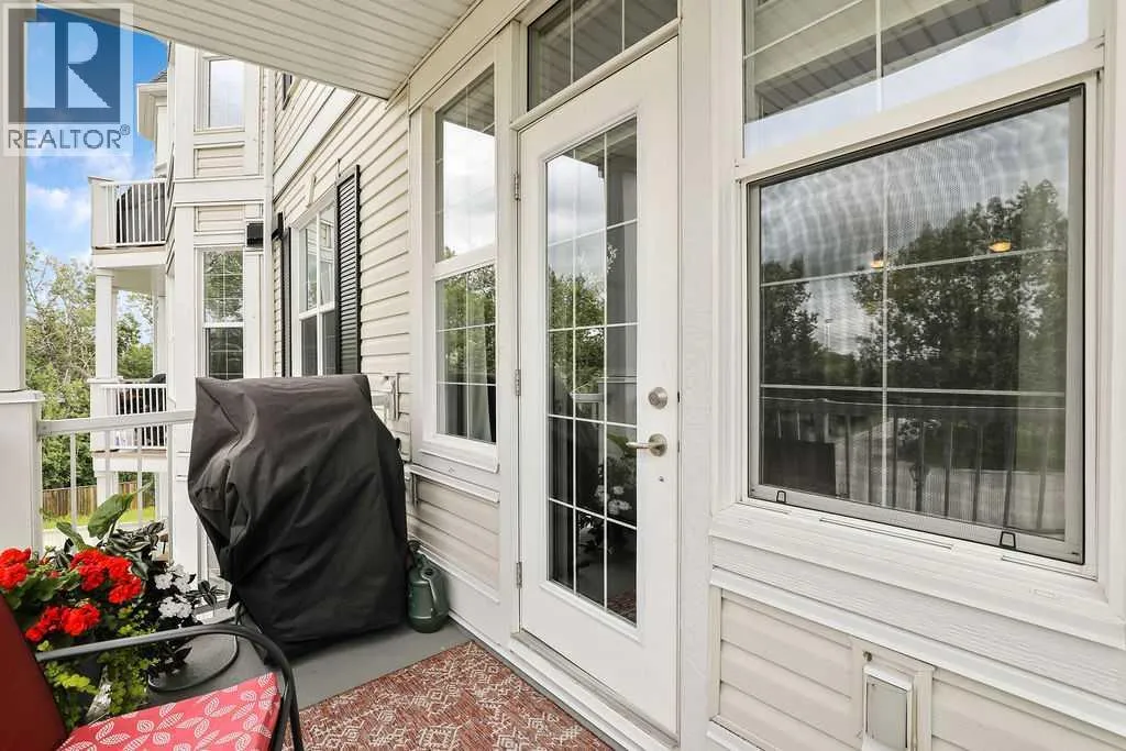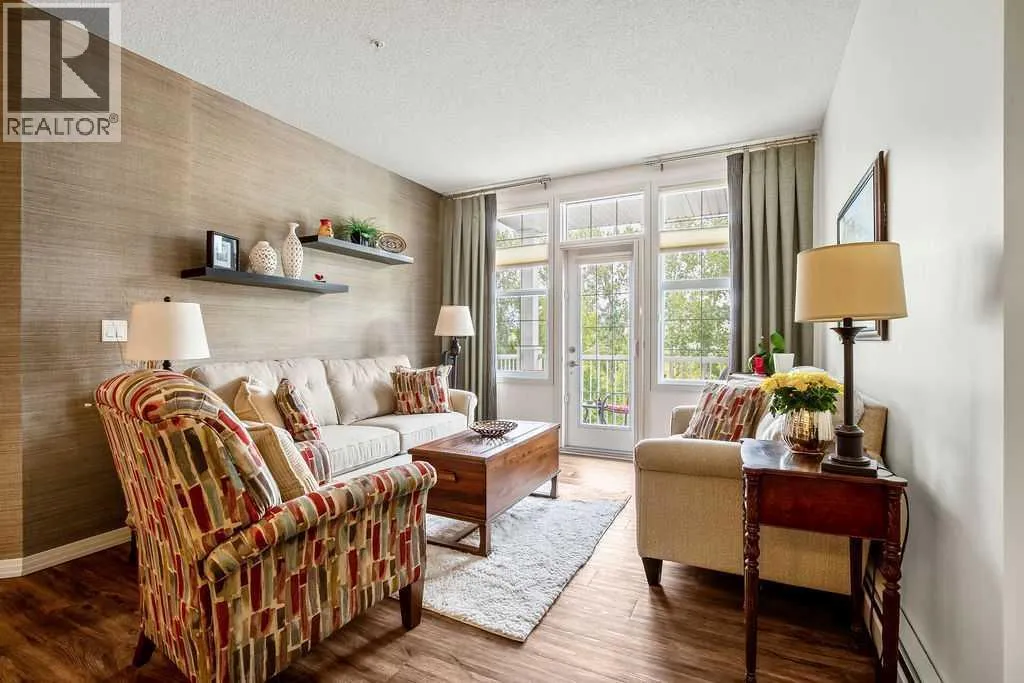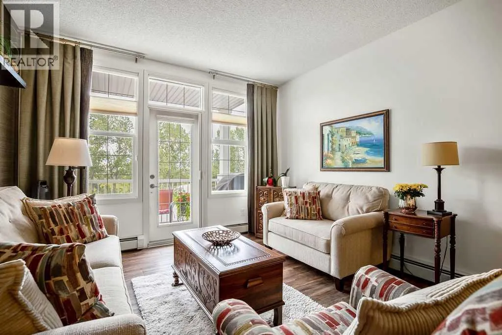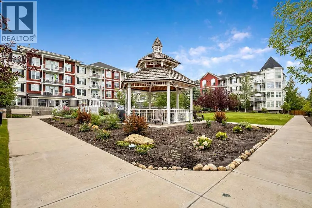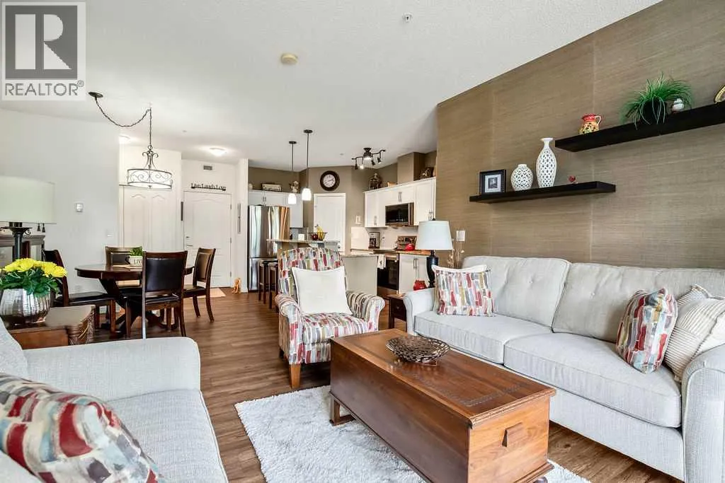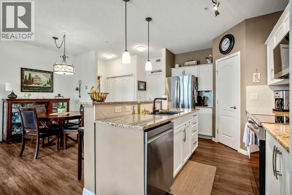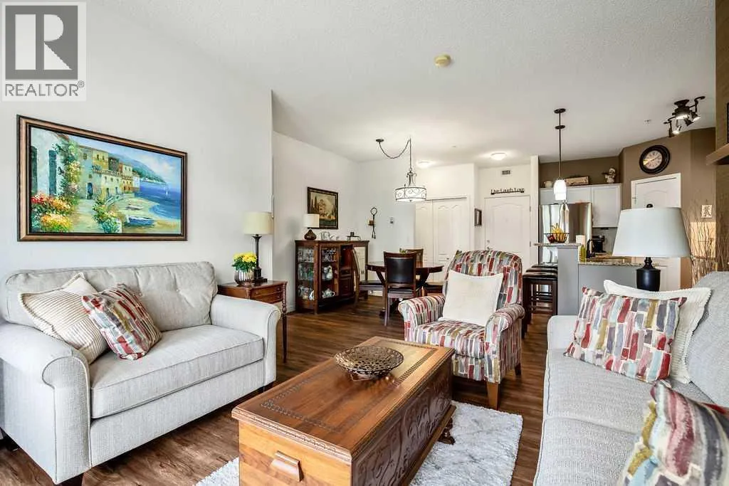 This is a lovely, immaculately maintained, 2 bedroom, 2 bath condo in the attractive Penncross condo building which is located next door to the Crystal Green Golf Course in the north side of Okotoks, convenient to all of Okotoks services, facilities & conveniences. The condo has lots of light filled rooms, a spacious feel with 9â ceilings, easy care luxury vinyl plank in the main great room, all the stainless steel kitchen appliances have been upgraded in the last year inviting cooks to enjoy the modern kitchen, while providing plenty of storage for your cooking needs. The master bedroom has a large walk through closet area and a private 3 piece ensuite. The second bedroom is currently used as a cozy den/office area with walk through storage to the 4 piece bath and laundry area. The balcony is a welcoming outdoor space to spend leisure time with a gas BBQ hook up in place. There is one underground titled, heated parking space with storage in front and 1 assigned parking stall above ground. The building features amenities of a welcoming foyer with comfortable seating, themed areas off the elevators â a putting green, library, sitting and games area to enjoy, as well as a large fitness room that leads to the fully landscaped, south facing courtyard. Living here also facilitates access to Crystal Shores Lake with beach house & lake access for additional activities (Lake HOA fees are included in the monthly condo fee). When you enter the front door you will appreciate the secure, quiet ambiance. This may be the one for you! (id:27476)