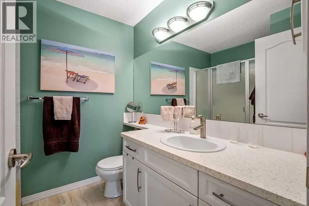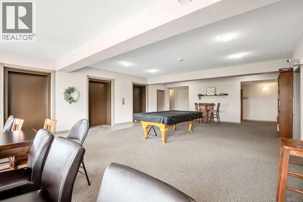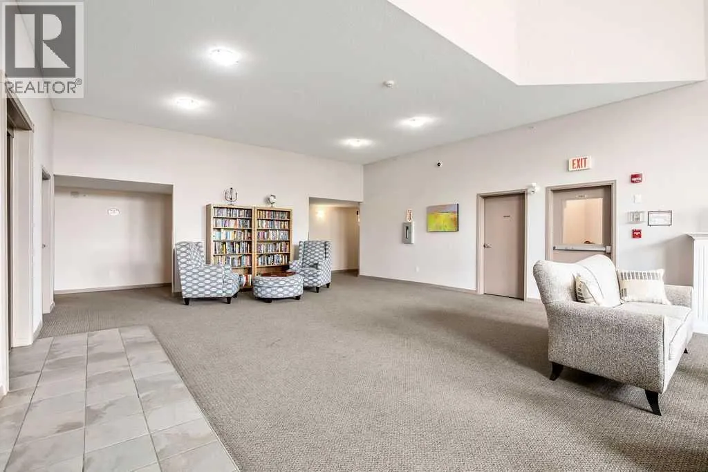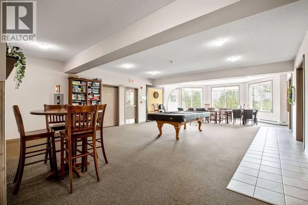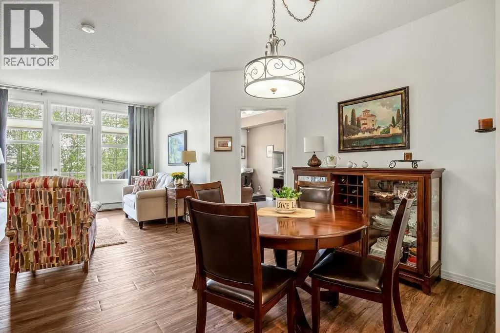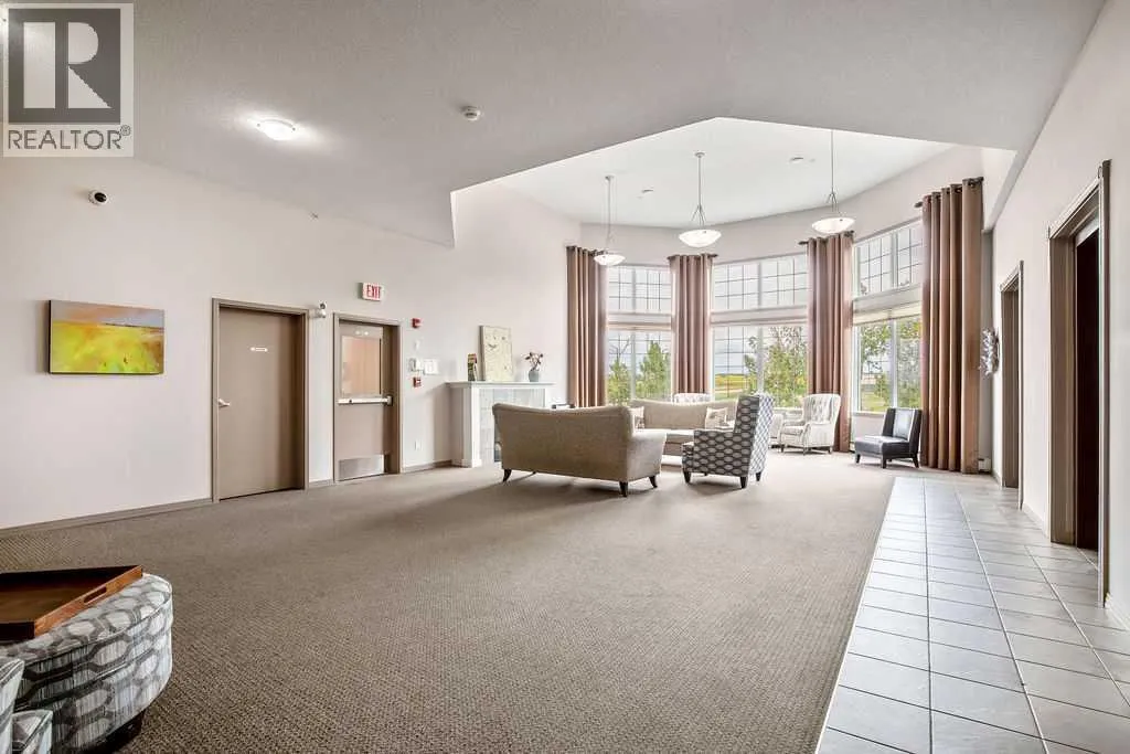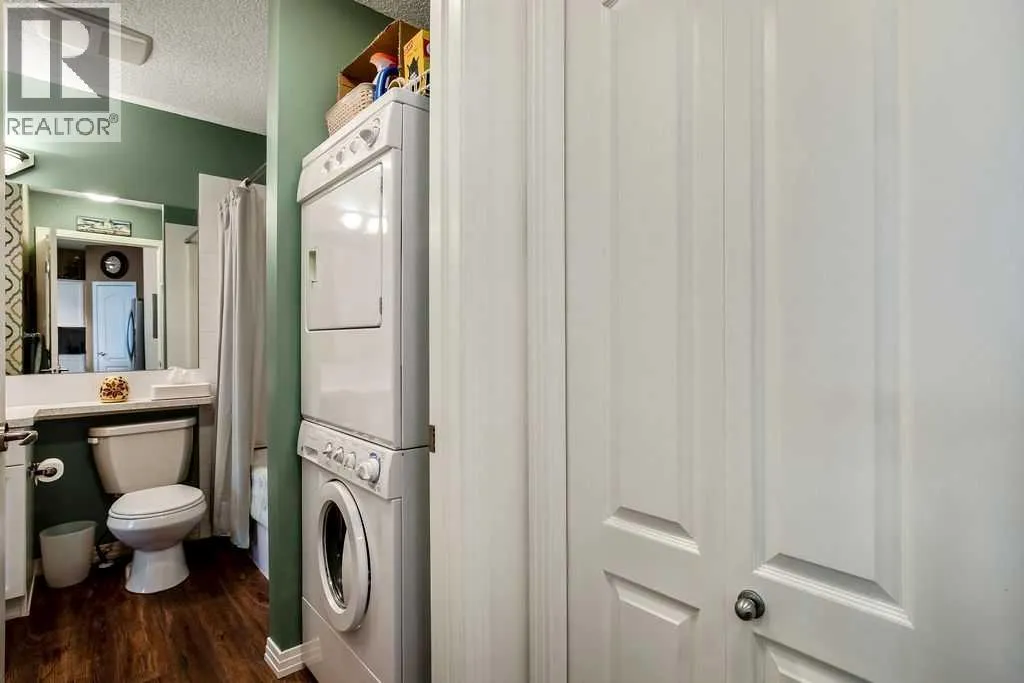 This is a lovely, immaculately maintained, 2 bedroom, 2 bath condo in the attractive Penncross condo building which is located next door to the Crystal Green Golf Course in the north side of Okotoks, convenient to all of Okotoks services, facilities & conveniences. The condo has lots of light filled rooms, a spacious feel with 9â ceilings, easy care luxury vinyl plank in the main great room, all the stainless steel kitchen appliances have been upgraded in the last year inviting cooks to enjoy the modern kitchen, while providing plenty of storage for your cooking needs. The master bedroom has a large walk through closet area and a private 3 piece ensuite. The second bedroom is currently used as a cozy den/office area with walk through storage to the 4 piece bath and laundry area. The balcony is a welcoming outdoor space to spend leisure time with a gas BBQ hook up in place. There is one underground titled, heated parking space with storage in front and 1 assigned parking stall above ground. The building features amenities of a welcoming foyer with comfortable seating, themed areas off the elevators â a putting green, library, sitting and games area to enjoy, as well as a large fitness room that leads to the fully landscaped, south facing courtyard. Living here also facilitates access to Crystal Shores Lake with beach house & lake access for additional activities (Lake HOA fees are included in the monthly condo fee). When you enter the front door you will appreciate the secure, quiet ambiance. This may be the one for you! (id:27476)