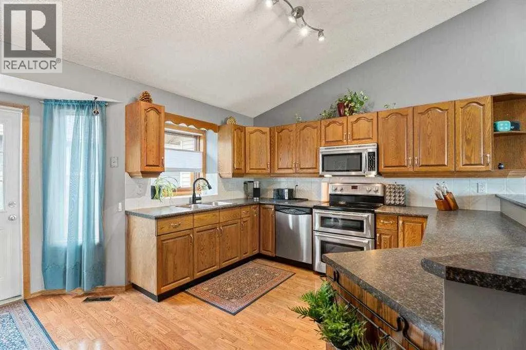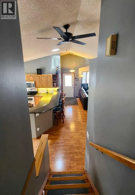 Spacious back-split layout is ideal for a large family or sharing with friends. Vaulted ceilings and open concept kitchen make entertaining and daily living effortless. The upper level includes, a primary bedroom, with en-suite, and two additional bedrooms, which offer privacy from the living area. Lower level has a beautiful wood fireplace, fourth bedroom, bath and opens directly to the deck and sunny south yard. Fourth level is finished with a flex space and web bar. With 4 levels and over 1,800 sq ft of living space on the 3 above grade levels, this home offers privacy and space for a large family or room mates. Located in desirable Downey Ridge, steps from the schools, community center and all services. (id:27476)