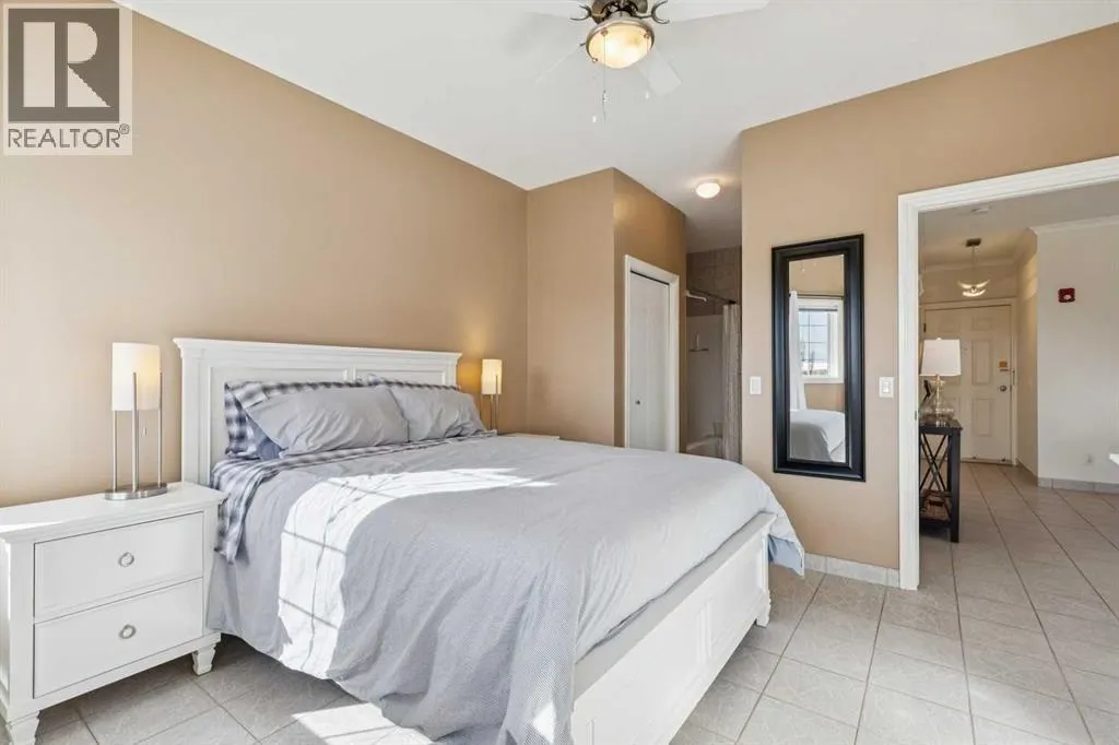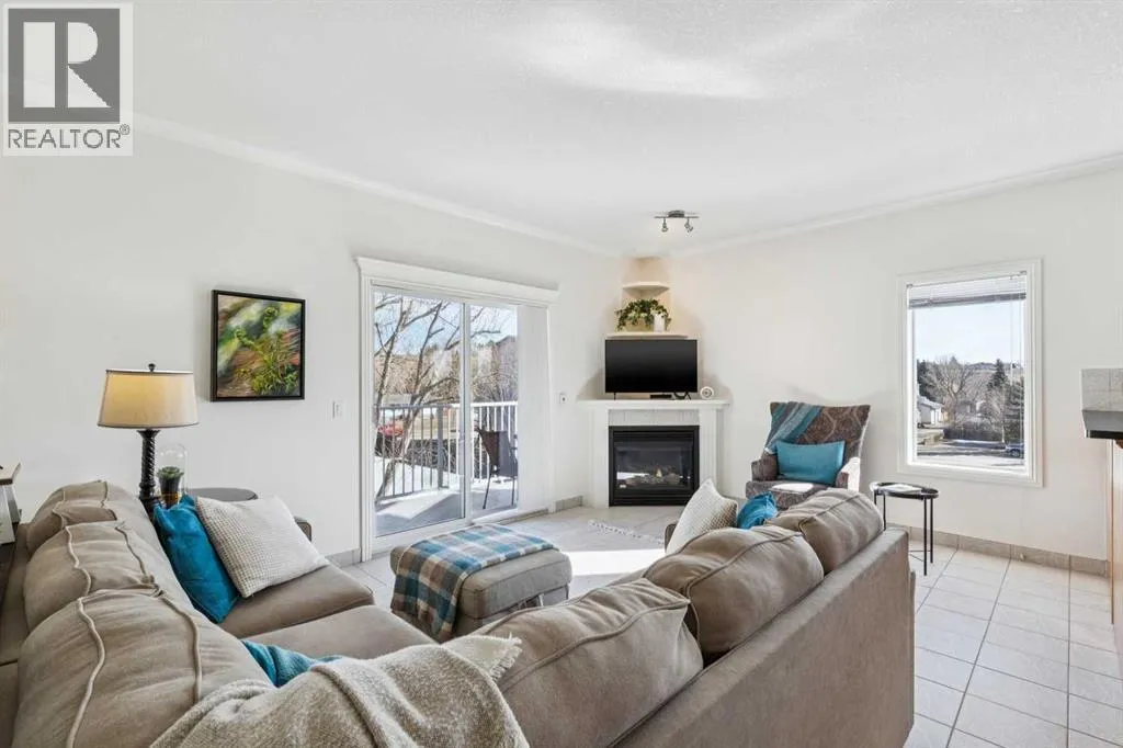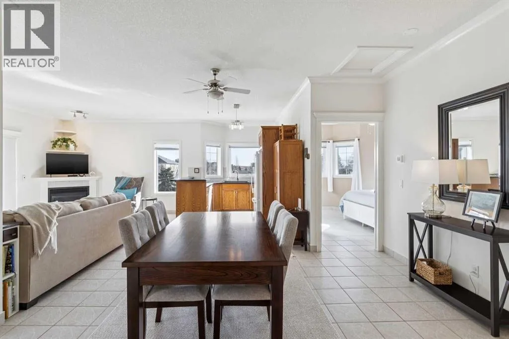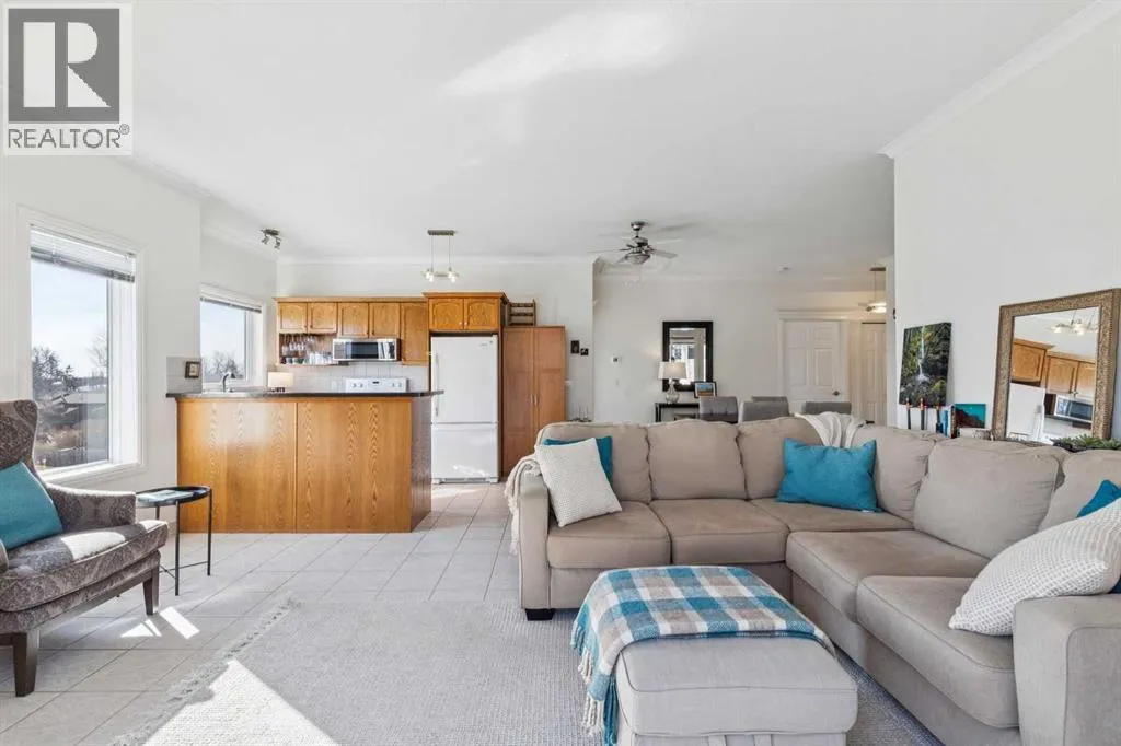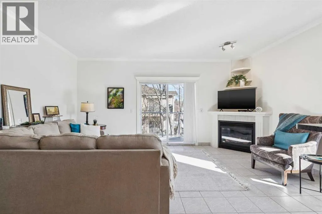 Welcome to this beautifully maintained 2-bedroom, 2-bathroom top-floor corner unit, offering one of the largest floor plans in the building. This bright and inviting home features 9-foot ceilings, elegant crown and cornice mouldings, and a cozy corner fireplace that anchors the living space. The thoughtful layout is complemented by durable tile flooring throughout, making it both stylish and highly functional. Enjoy year-round comfort with in-floor heating, and step outside to your spacious private deck overlooking a mature, treed green space. A perfect spot to relax or entertain. The building itself is exceptionally well cared for and self-managed, offering peace of mind and pride of ownership throughout. Additional features include: Elevator access, oversized doorways for enhanced accessibility, covered rear parking, on-site visitor parking, and a large on-site secured storage unit. Located just steps from historic downtown, youâll love being close to schools, local coffee shops, boutique shopping, and scenic river pathways. Immaculate, move-in ready, and offering incredible value, this is one you donât want to miss. (id:27476)