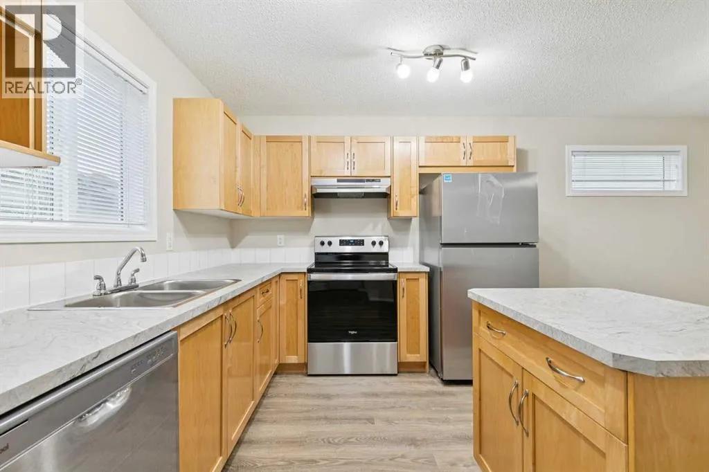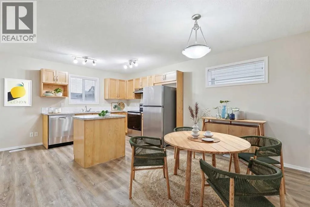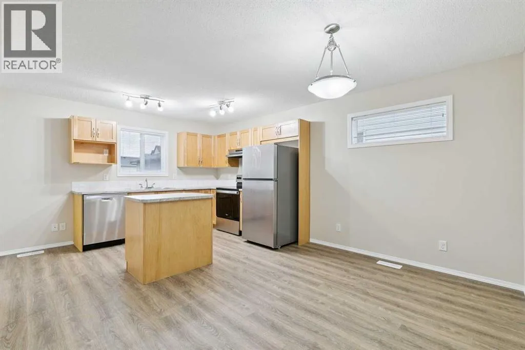 Looking for a detached home in Okotoks under $500,000? This updated 3-bedroom property offers 1,266 sq ft of functional living space and is move-in ready with new flooring throughout, fresh paint, and all new appliances. The main floor is bright and practical, featuring vinyl plank flooring, a comfortable living area, and a well-laid-out kitchen with ample counter space, a central island, and stainless steel appliances, open to a generous dining area. A built-in workstation adds flexibility for day-to-day use. Upstairs includes three good-sized bedrooms, including a primary with a walk-in closet, along with a 4-piece bathroom with updated flooring. The fully fenced south-facing backyard offers usable outdoor space and a parking pad for two vehicles, while the unfinished basement provides room for future development. (id:27476)