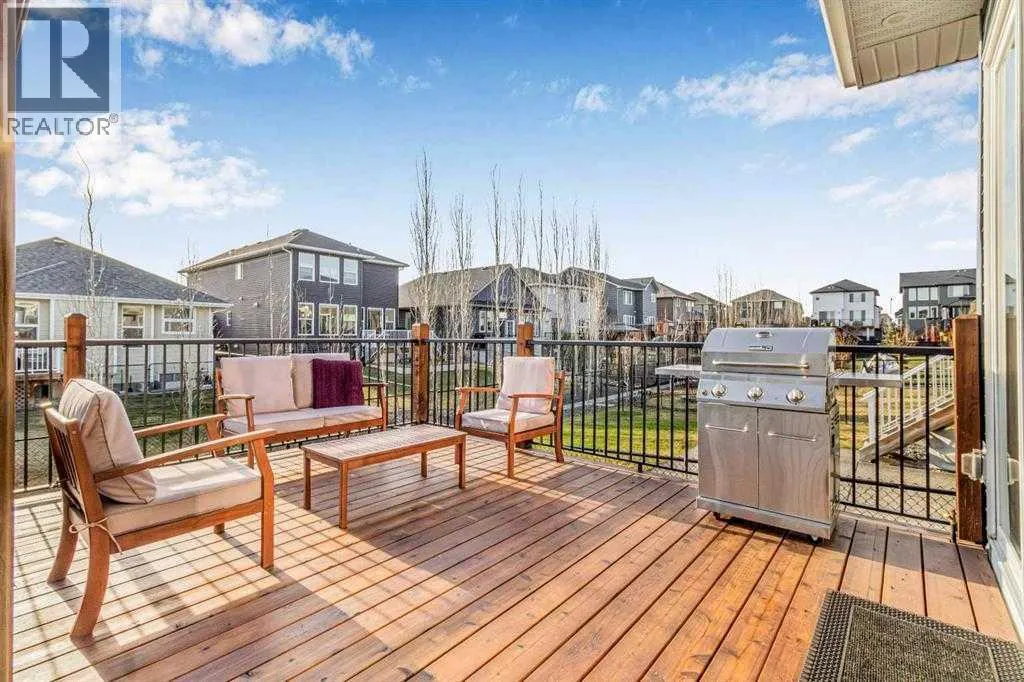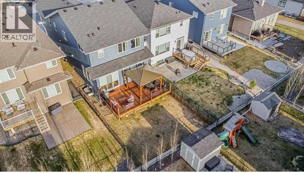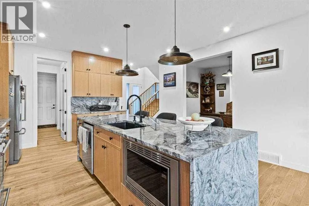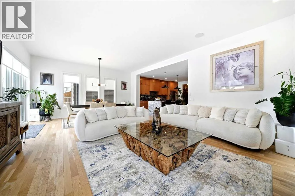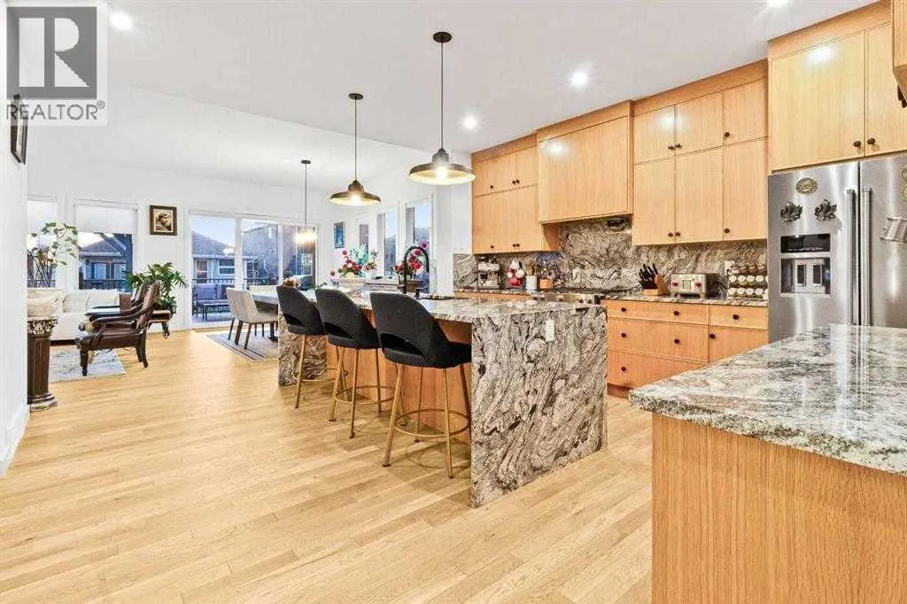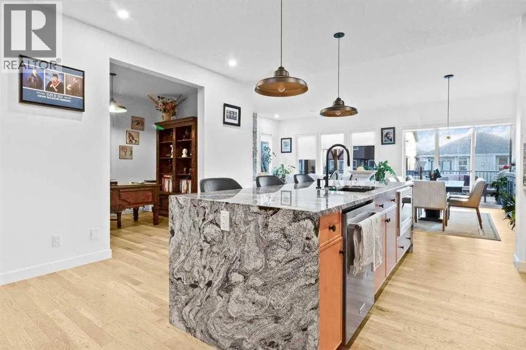 Welcome to this exceptional, fully upgraded home in the heart of beautiful Okotoksâoffering quality construction and opulent features. Designed with both style and function in mind. Upon entry, this home makes an immediate impression with its soaring vaulted entry and 9â ceilings spanning all three levels, including the basement. The rear living and dining areas elevate the experience even further with impressive 10â ceilings and expansive windows that flood the space with natural light, creating an open and inviting atmosphere.The chef-inspired kitchen is a true showpiece, featuring premium KitchenAid appliances, a Hansgrohe faucet, rift-cut white oak cabinetry with stacked uppers, a custom hood fan, and striking Viscount White granite waterfall countertops. A matching granite backsplash and custom fireplace surround tie the space together with a sophisticated finish.Thoughtful upgrades continue throughout, including 8â interior doors on the main and upper floors, triple-pane casement windows, an oversized 8â patio door, and sleek black spindle railings. Mirage white oak hardwood floors extend through the main level and staircase, adding warmth and timeless elegance. The home is illuminated by designer Kuzco lighting, backed by the 5-year Alberta New Home Warranty, while roller blinds throughout provide both privacy and style.Upstairs, youâll find four generously sized bedrooms, a central bonus room, and the convenience of upper-floor laundry. The primary suite offers a private retreat with dual walk-in closets and plenty of space to unwind. The ensuite and bathrooms throughout the home are beautifully finished with fully tiled showers, a freestanding tub, high-end Toto and Moen fixtures, and full-height mirrors that enhance the sense of space.The lower level is partially developed with a completed 4-piece bathroom and a fifth bedroom, while over 700 sq. ft. remains for your personal visionâcomplete with a wet bar rough-in, ideal for a future media room, rec reation space, or home gym.Additional highlights include built-in ceiling speakers in the living room, Lutron Caseta smart lighting controls, and a double attached garage for year-round comfort and convenience. Step outside to enjoy the expansive custom-built 18â x 26â cedar deckâperfect for relaxing or entertaining on warm summer evenings.This is a rare opportunity to own a meticulously upgraded, move-in-ready home in one of Okotoksâ most desirable settingsâwithout the delays of building from scratch. (id:27476)