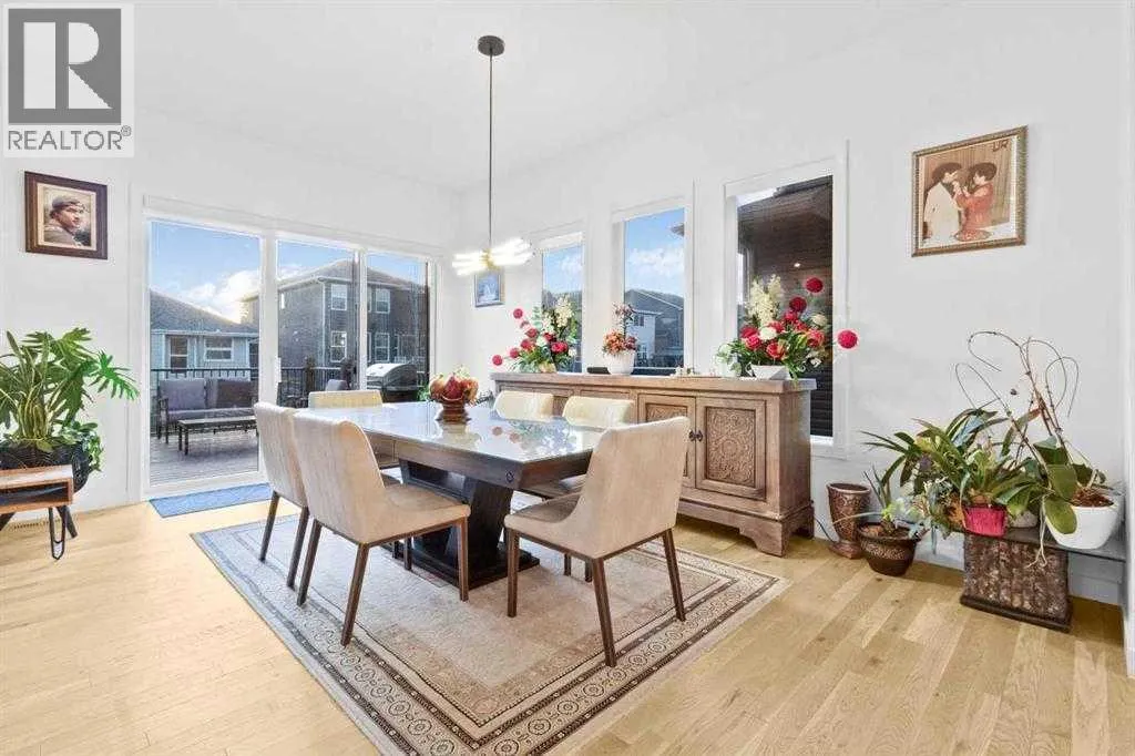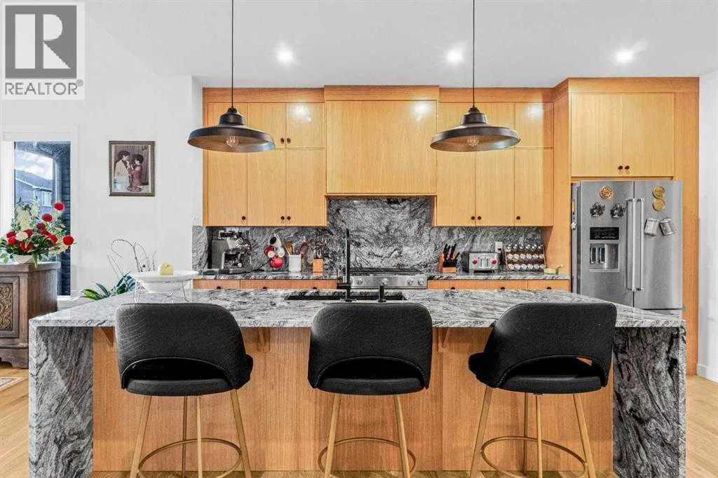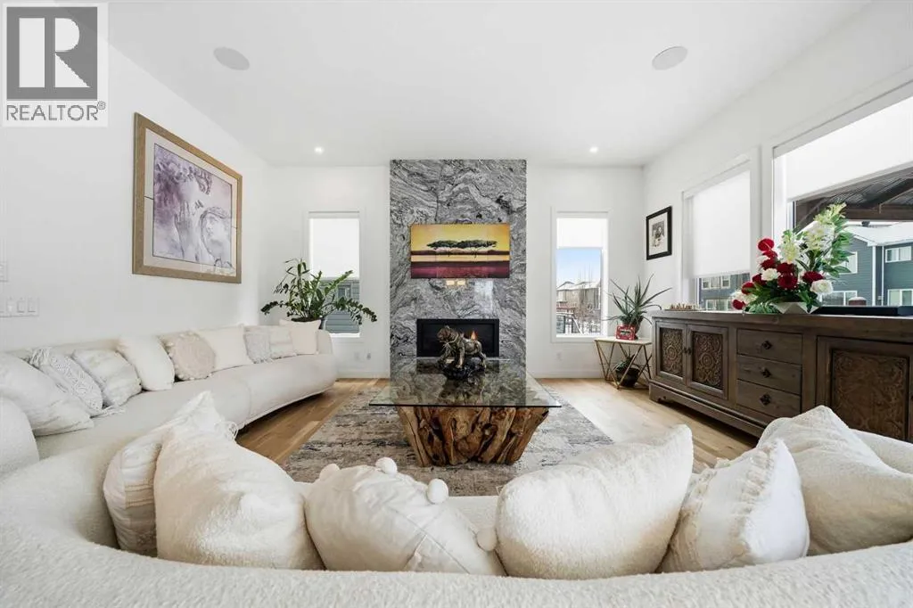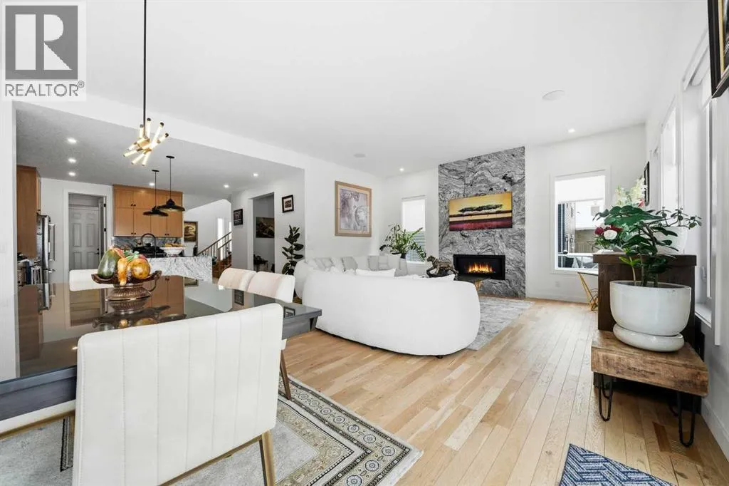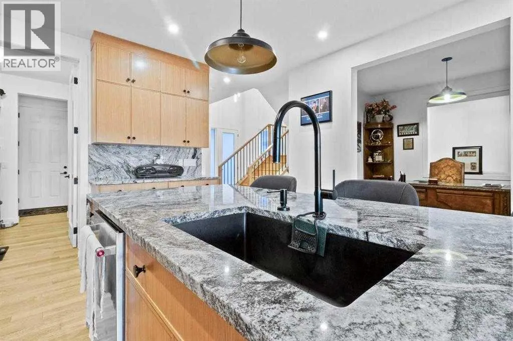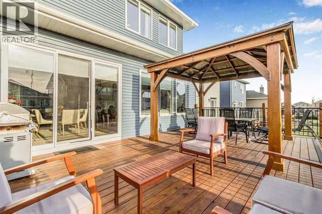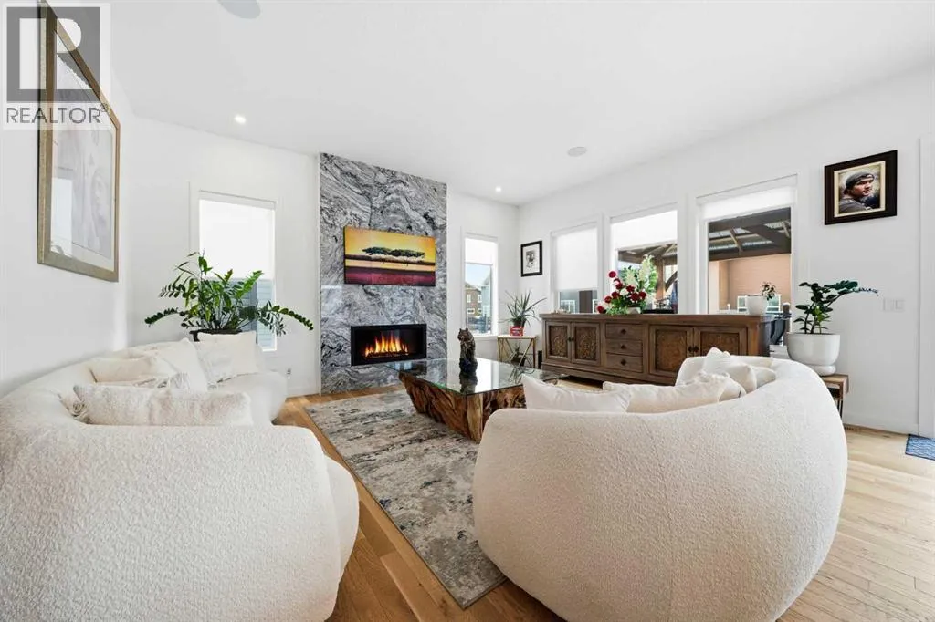 Welcome to this exceptional, fully upgraded home in the heart of beautiful Okotoksâoffering quality construction and opulent features. Designed with both style and function in mind. Upon entry, this home makes an immediate impression with its soaring vaulted entry and 9â ceilings spanning all three levels, including the basement. The rear living and dining areas elevate the experience even further with impressive 10â ceilings and expansive windows that flood the space with natural light, creating an open and inviting atmosphere.The chef-inspired kitchen is a true showpiece, featuring premium KitchenAid appliances, a Hansgrohe faucet, rift-cut white oak cabinetry with stacked uppers, a custom hood fan, and striking Viscount White granite waterfall countertops. A matching granite backsplash and custom fireplace surround tie the space together with a sophisticated finish.Thoughtful upgrades continue throughout, including 8â interior doors on the main and upper floors, triple-pane casement windows, an oversized 8â patio door, and sleek black spindle railings. Mirage white oak hardwood floors extend through the main level and staircase, adding warmth and timeless elegance. The home is illuminated by designer Kuzco lighting, backed by the 5-year Alberta New Home Warranty, while roller blinds throughout provide both privacy and style.Upstairs, youâll find four generously sized bedrooms, a central bonus room, and the convenience of upper-floor laundry. The primary suite offers a private retreat with dual walk-in closets and plenty of space to unwind. The ensuite and bathrooms throughout the home are beautifully finished with fully tiled showers, a freestanding tub, high-end Toto and Moen fixtures, and full-height mirrors that enhance the sense of space.The lower level is partially developed with a completed 4-piece bathroom and a fifth bedroom, while over 700 sq. ft. remains for your personal visionâcomplete with a wet bar rough-in, ideal for a future media room, rec reation space, or home gym.Additional highlights include built-in ceiling speakers in the living room, Lutron Caseta smart lighting controls, and a double attached garage for year-round comfort and convenience. Step outside to enjoy the expansive custom-built 18â x 26â cedar deckâperfect for relaxing or entertaining on warm summer evenings.This is a rare opportunity to own a meticulously upgraded, move-in-ready home in one of Okotoksâ most desirable settingsâwithout the delays of building from scratch. (id:27476)