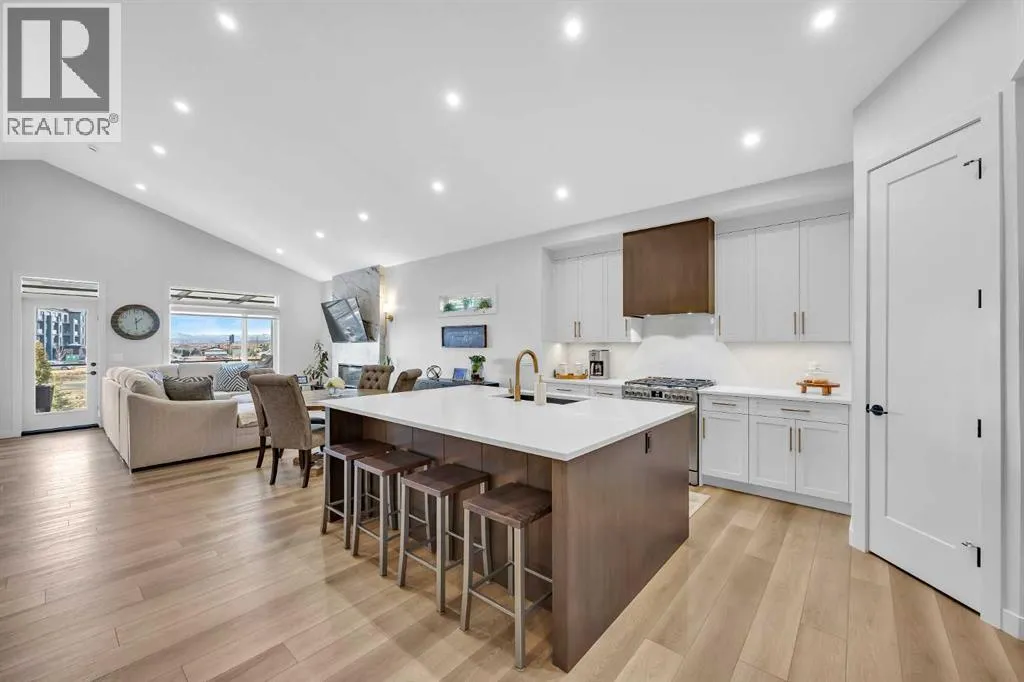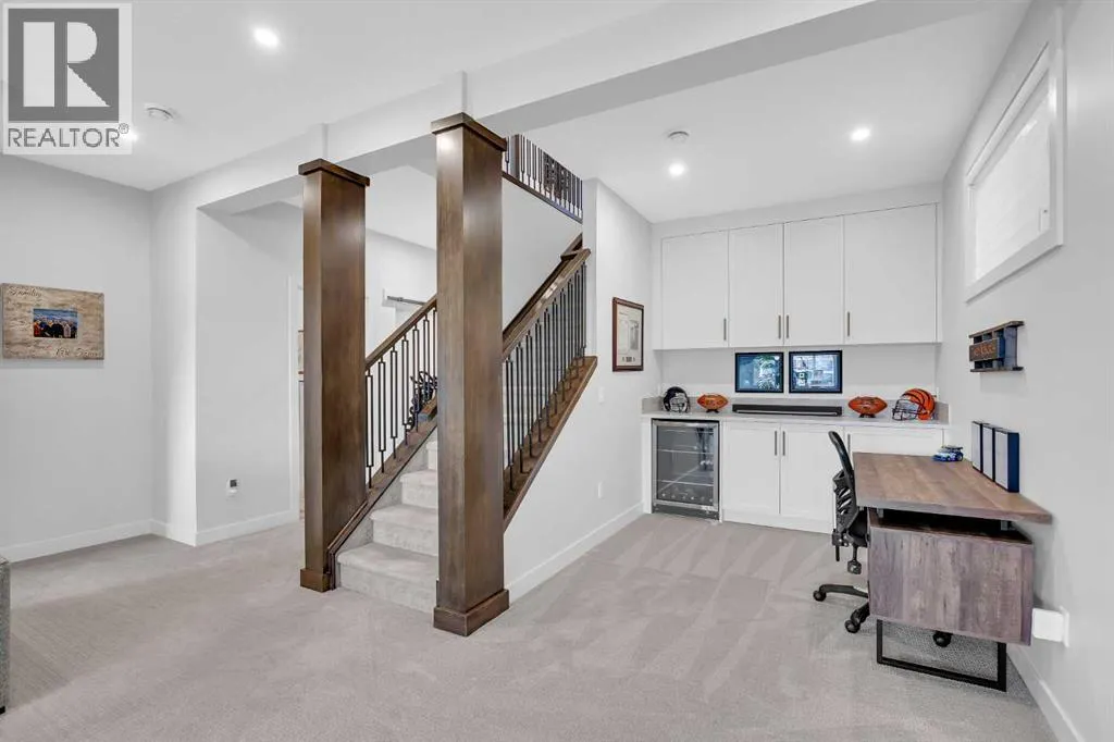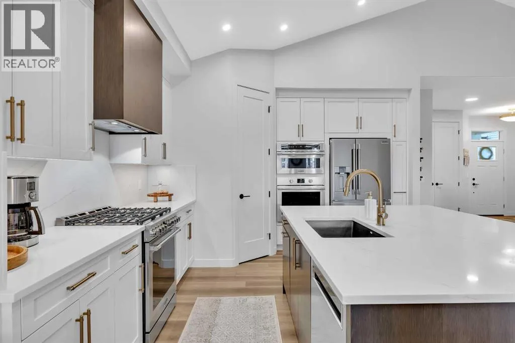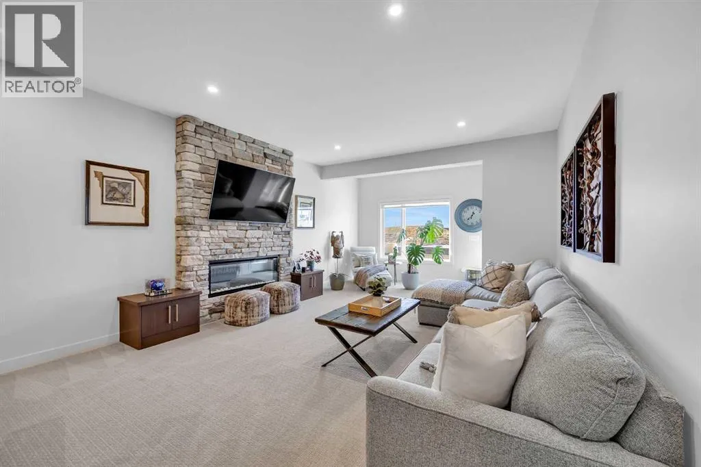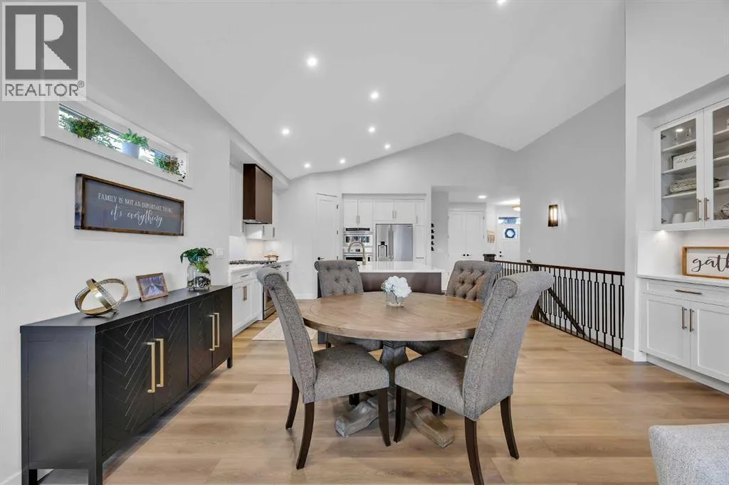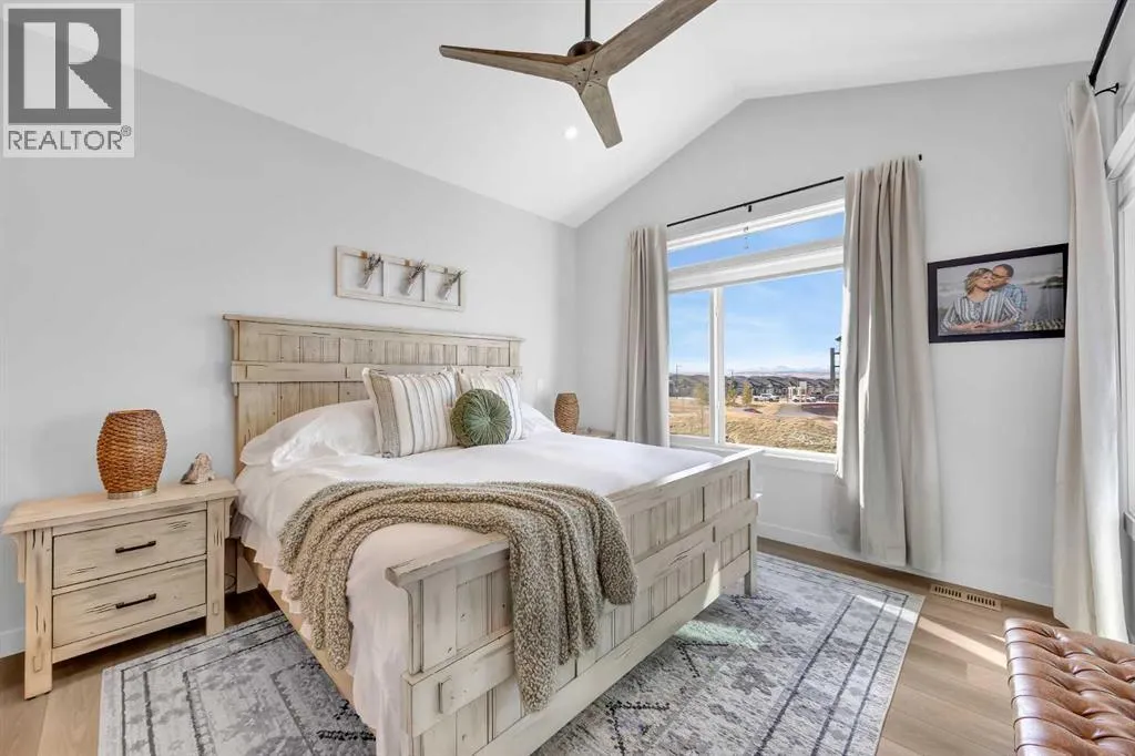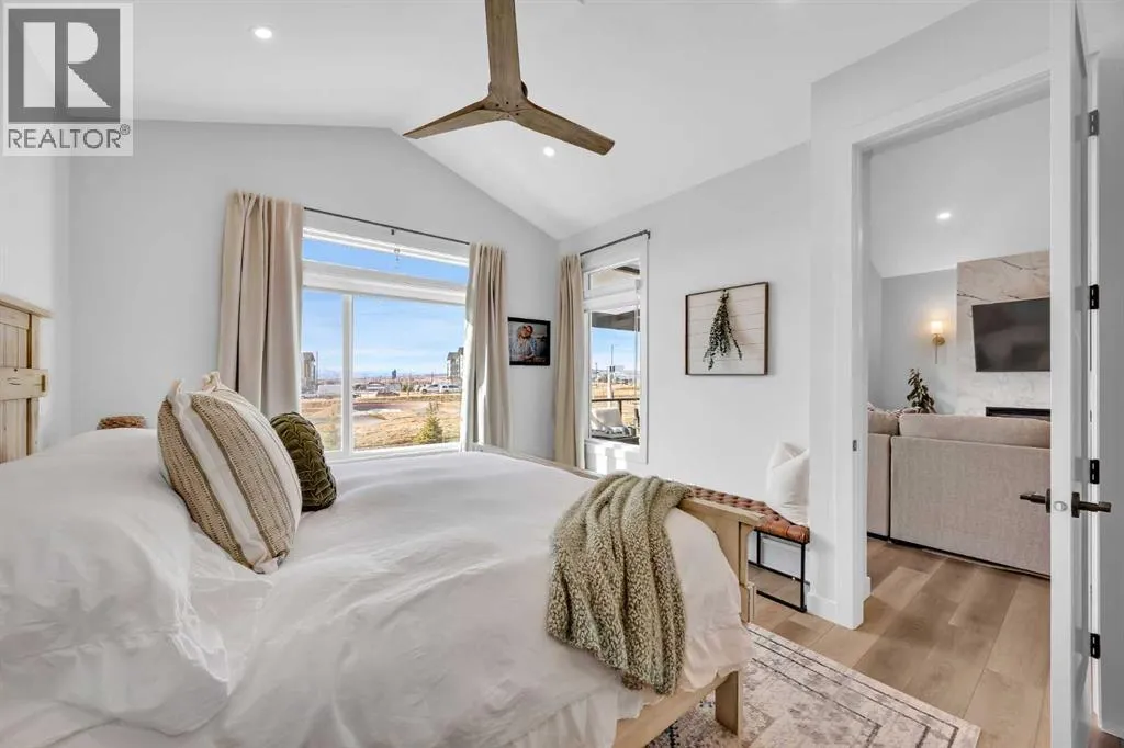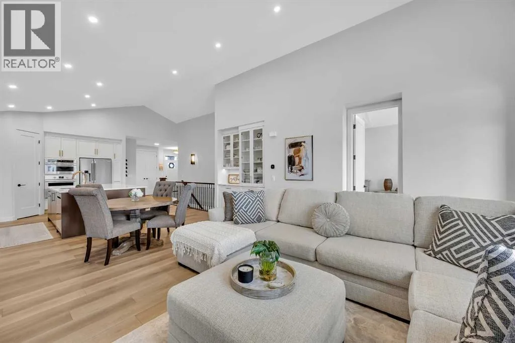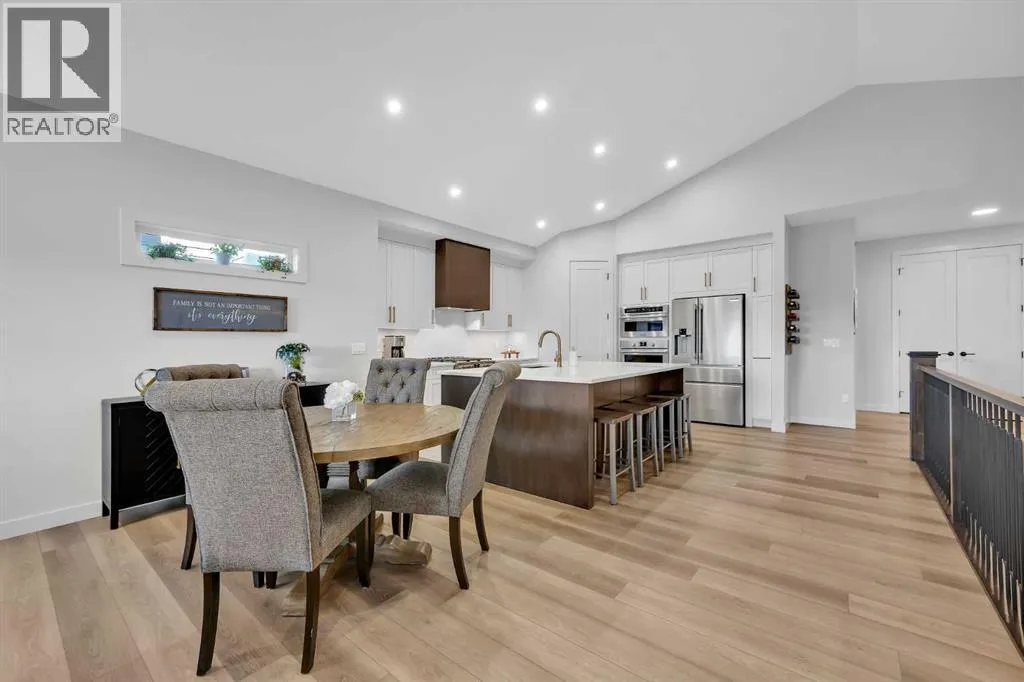Welcome to this stunning walkout bungalow in Wedderburn, Okotoks, offering over 2,500 square feet of developed living space, mountain views, and a layout designed for both everyday living and entertaining. Featuring three bedrooms, two and a half bathrooms, a main floor den, a dedicated gym, and a fully finished walkout basement with a built-in dry bar, this home presents a rare opportunity to own a highly upgraded bungalow in one of Okotoksâ most desirable and growing communities. The main level is defined by soaring vaulted ceilings and expansive windows that fill the home with natural light. At the center of the space is an oversized chef-inspired kitchen designed to impress, complete with quartz countertops, a large island, full height cabinetry, a walk-in pantry, upgraded built-in appliances, and a custom hood fan. A built-in hutch adds both function and character, while the open concept layout connects seamlessly to the dining and living areas. The great room is anchored by a sleek linear fireplace and opens directly onto the main floor deck, creating an ideal setting for indoor-outdoor living and entertaining. The primary suite is thoughtfully positioned for privacy and offers a spacious walk-in closet and a beautifully finished ensuite featuring dual vanities, a soaker tub, and a fully tiled shower. A main floor den provides flexibility for a home office, study, or quiet retreat. The mudroom and laundry area are well designed with built-in cabinetry, quartz counters, and excellent storage, and connect directly to the double attached garage for everyday convenience. The fully finished walkout basement extends the living space with two generously sized bedrooms, a full bathroom, a dedicated gym, and a large recreation area with a second fireplace and built-in dry bar. Step outside to the lower patio and enjoy the seamless connection to the outdoors that walkout living provides. Located in Wedderburn, Okotoks, this home offers access to pathways, parks, and nea rby amenities, with convenient access to Calgary. This is a rare opportunity to own a move-in ready walkout bungalow with elevated finishes, functional design, and exceptional living space. (id:27476)