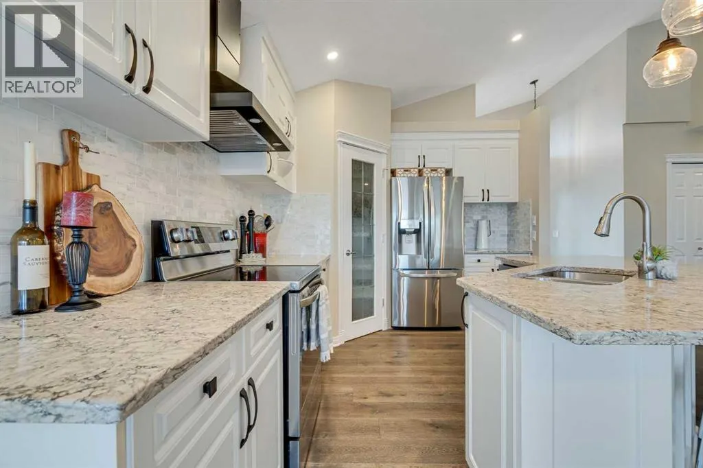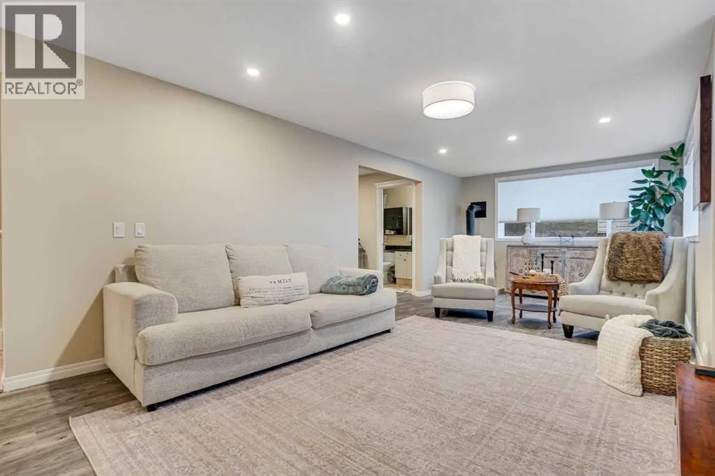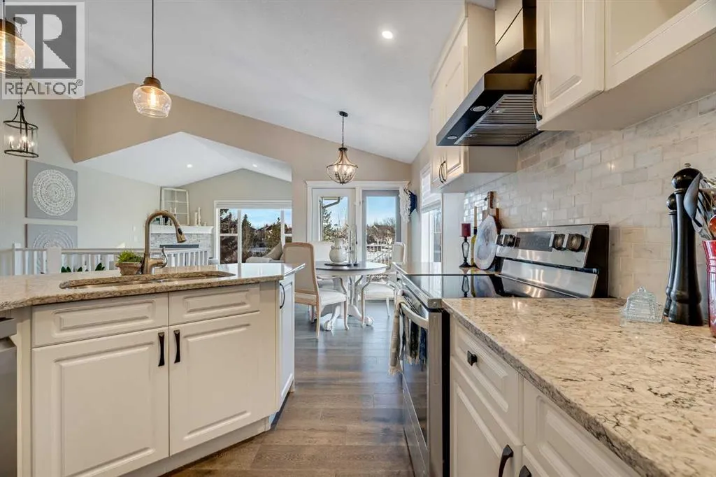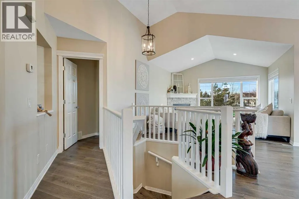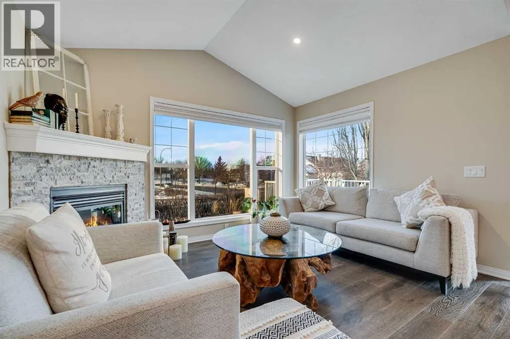 Welcome to 701 Cimarron Close, a beautifully upgraded corner-lot home backing onto scenic walking paths and environmental reserveâoffering privacy, space, and a lifestyle thatâs hard to beat. With 3 bedrooms, 2.5 bathrooms, and over 2,400 sq. ft. of developed living space, this home is thoughtfully designed for comfort and functionality. The main floor features 1 bedroom plus a den, perfect for a home office or guest space, highlighted by large windows, white cabinetry, quartz countertops, and newer stainless steel appliances. Quality upgrades are evident throughout, creating a bright and welcoming atmosphere. The fully finished walk-up basement boasts a massive family room, two additional bedrooms, a second fireplace, and plenty of storage, making it ideal for entertaining, relaxing, or accommodating family and guests. Enjoy outdoor living in the low-maintenance backyard with stamped concrete, mature trees, and well-established garden bedsâall backing onto tranquil green space. Additional highlights include two fireplaces, a 22-foot-deep garage with radiant heater, garage heater, and a 2-year-old hot water tank. Located within walking distance to schools and amenities, this impeccably landscaped home combines convenience, privacy, and pride of ownership in one exceptional package. (id:27476)