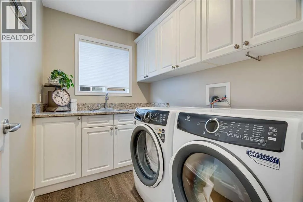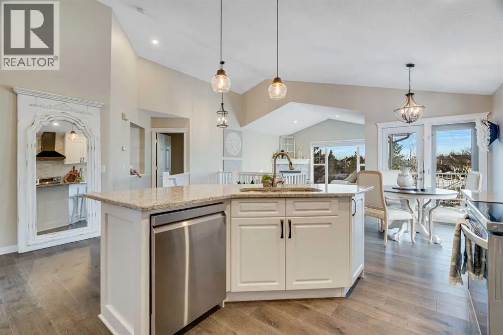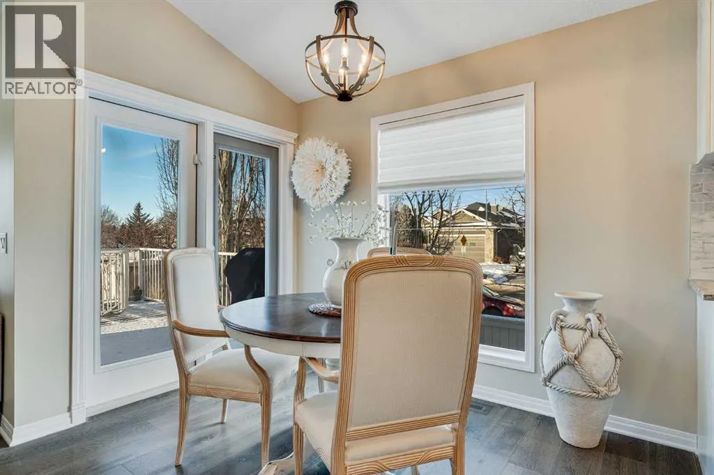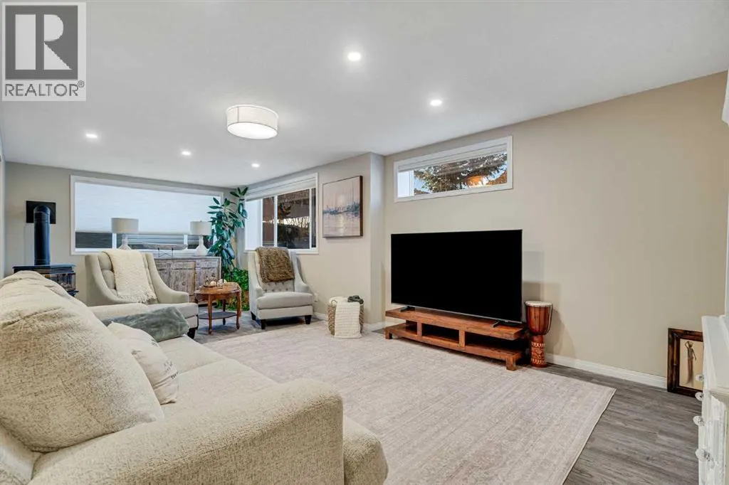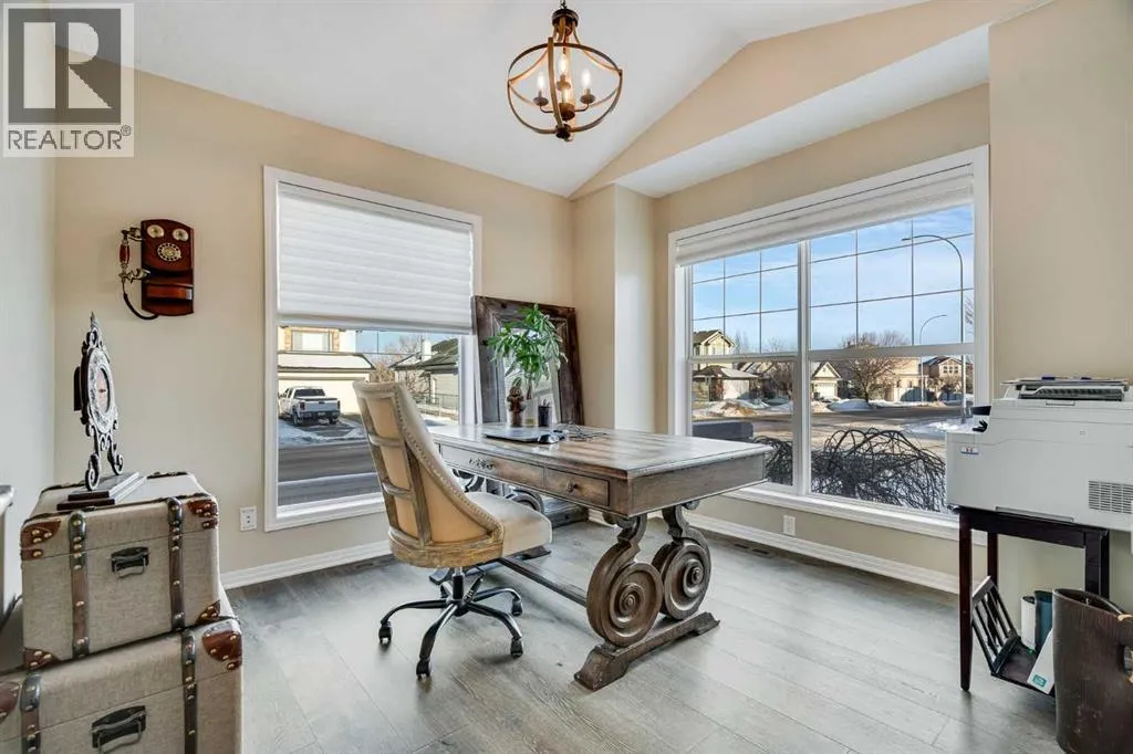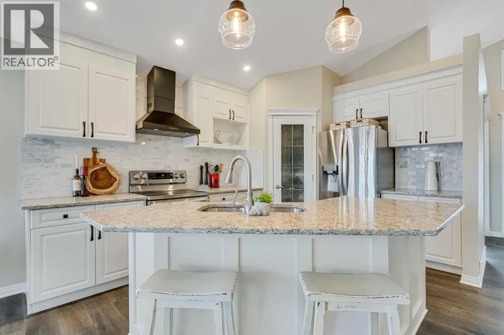 Welcome to 701 Cimarron Close, a beautifully upgraded corner-lot home backing onto scenic walking paths and environmental reserveâoffering privacy, space, and a lifestyle thatâs hard to beat. With 3 bedrooms, 2.5 bathrooms, and over 2,400 sq. ft. of developed living space, this home is thoughtfully designed for comfort and functionality. The main floor features 1 bedroom plus a den, perfect for a home office or guest space, highlighted by large windows, white cabinetry, quartz countertops, and newer stainless steel appliances. Quality upgrades are evident throughout, creating a bright and welcoming atmosphere. The fully finished walk-up basement boasts a massive family room, two additional bedrooms, a second fireplace, and plenty of storage, making it ideal for entertaining, relaxing, or accommodating family and guests. Enjoy outdoor living in the low-maintenance backyard with stamped concrete, mature trees, and well-established garden bedsâall backing onto tranquil green space. Additional highlights include two fireplaces, a 22-foot-deep garage with radiant heater, garage heater, and a 2-year-old hot water tank. Located within walking distance to schools and amenities, this impeccably landscaped home combines convenience, privacy, and pride of ownership in one exceptional package. (id:27476)