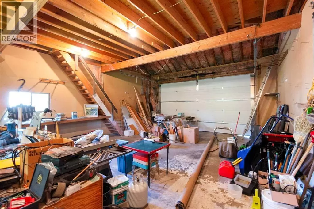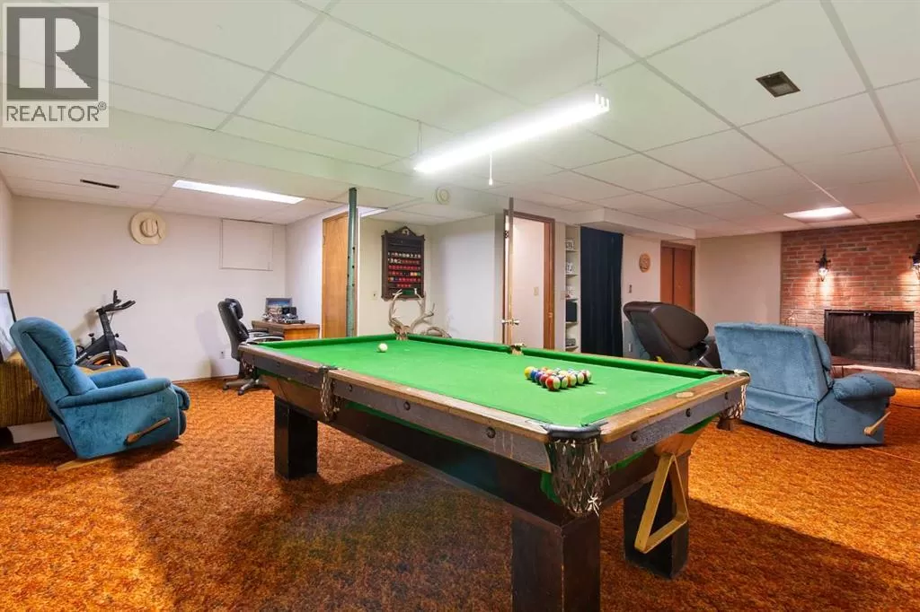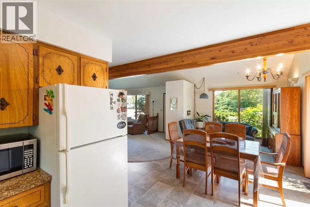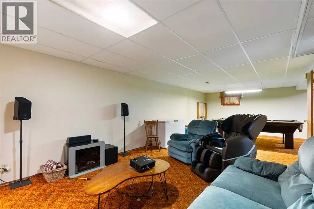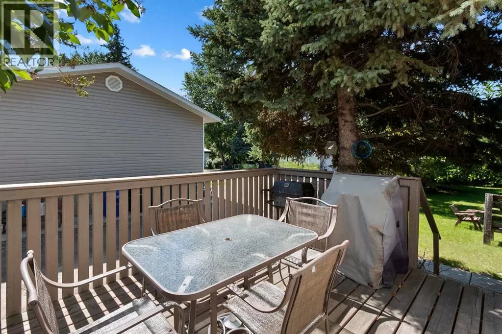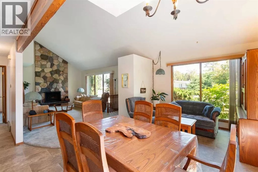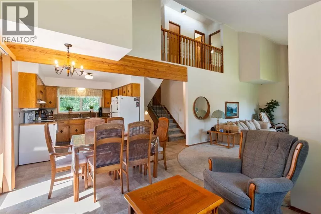 Welcome to this warm and inviting 1.5-storey home offering 1,263 sq. ft. of well-designed living space in a highly desirable part of townâjust a short walk to the Elementary and Middle Schools. The main level features a spacious living room with a cozy wood-burning fireplace, a large dining room with direct access to the back deck, a well-appointed kitchen, a convenient two-piece bathroom, and a main-floor bedroomâideal for guests or a home office. Upstairs, you'll find a generously sized primary bedroom, a full four-piece bathroom, and a third comfortable bedroom with plenty of natural light. The fully finished basement expands your living space with an oversized recreation room (pool table included!), abundant storage options, and a dedicated utility/laundry room. Outside, enjoy a beautifully landscaped and partially fenced backyard that backs onto a 30-foot walkway/utility right-of-way, providing added privacy and space. The detached garage includes a loft areaâperfect for storage or a workshop. (id:27476)