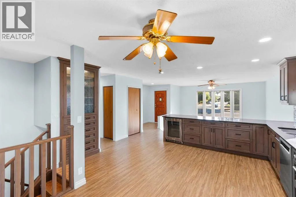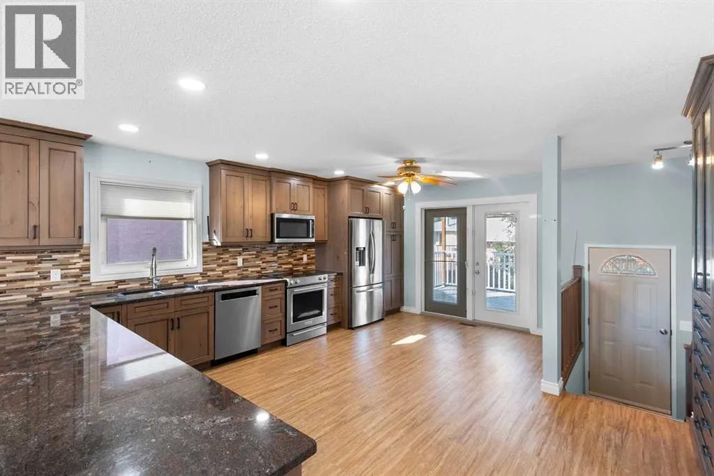 Welcome to this well maintained 4-bedroom, 3-bathroom home, offering 1,212 sq. ft. of comfortable living space in a sought-after family neighborhoodâjust minutes from schools, parks, and shopping. The main level features a spacious sunken living room perfect for relaxing or entertaining, a bright and functional kitchen with an oversized island, granite countertops, and newer stainless-steel appliances and direct access to a large covered deck. This level also includes two generously sized bedrooms and a 4-piece bathroom. The primary bedroom offers added privacy with a 3-piece ensuite. Downstairs, you'll find a large recreation room, an additional bedroom, a den or office space, a 4-piece bathroom, and a bonus roomâideal for a gym, playroom, or extra storage. The large laundry room and ample storage throughout the lower level add to the home's functionality. The front and backyard are beautifully landscaped, creating great curb appeal and a private backyard oasis. A single detached garage sits at the rear of the property for convenient parking or additional storage. This move in ready home offers space, versatility, and a prime locationâperfect for families or anyone looking to settle into a welcoming neighborhood. (id:27476)