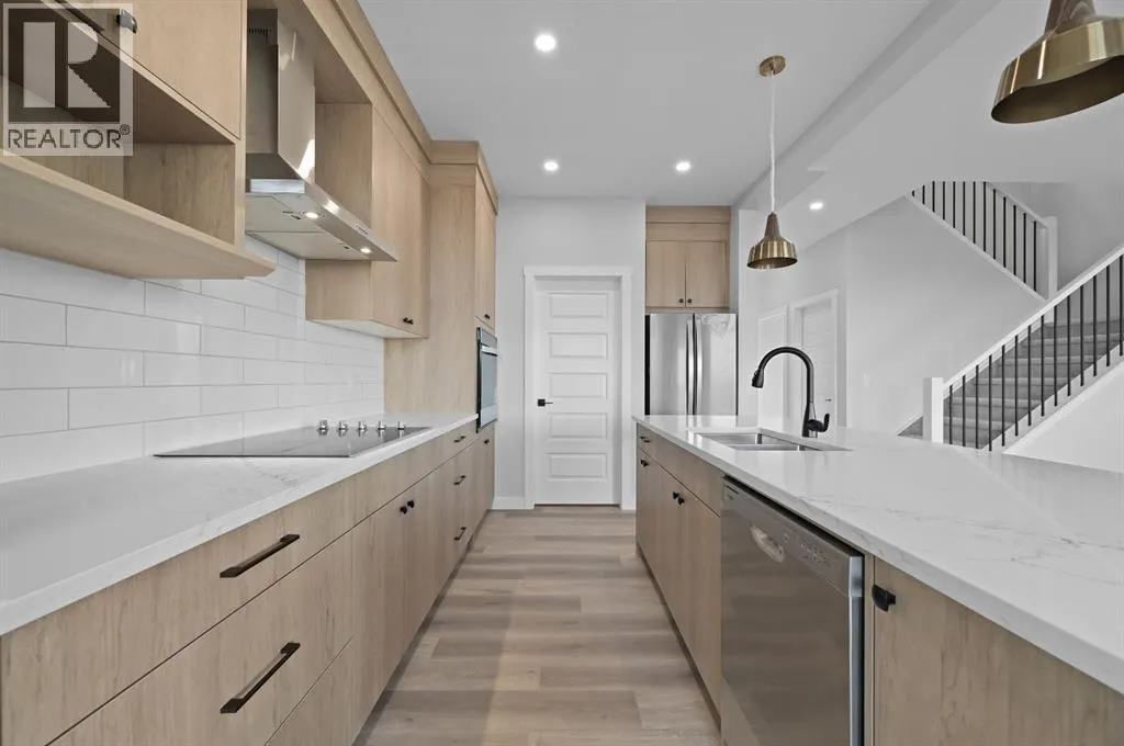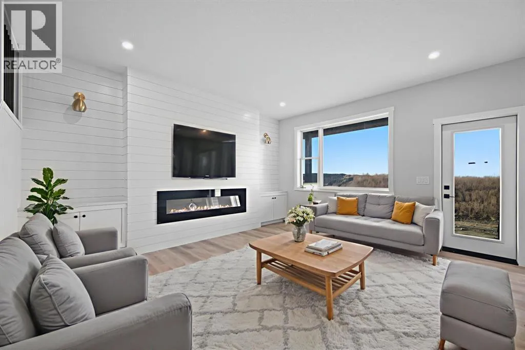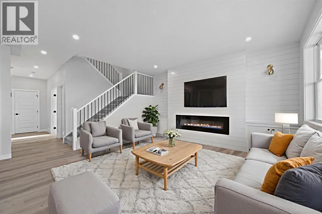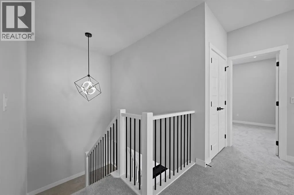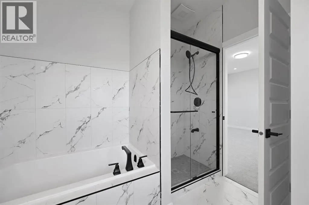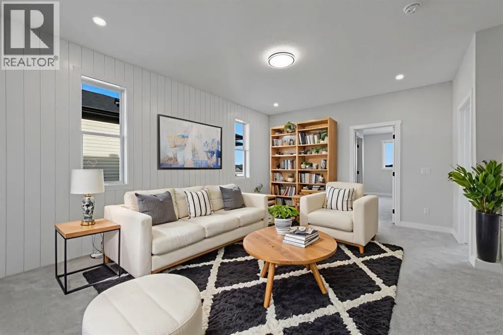 Welcome to this stunning 3-bedroom plus den, 2.5-bathroom home designed with style, comfort, and versatility in mind. From its neutral tones to its high-end finishes, every detail reflects modern craftsmanship and thoughtful design.Step inside to an inviting open-concept main floor featuring luxury vinyl plank flooring and an impressive white wood-accented wall in the family room, complete with a large remote-controlled electric fireplace and built-in speakers. The chefâs kitchen showcases white quartz countertops, elegant white tile backsplash, and contemporary cabinetry â a perfect blend of simplicity and sophistication. A bright dining area with a modern LED chandelier adds a touch of glamour, while the den with double doors provides the perfect space for a home office or guest bedroom.Upstairs, an extra-wide staircase leads to the spacious bonus room â ideal for movie nights or relaxing evenings â featuring another elegant white accent wall. The primary suite is a true retreat, boasting large windows, a generous walk-in closet, and a luxurious 5-piece ensuite with dual sinks, a soaker tub, and a striking white-and-black tiled shower. Two additional bedrooms offer ample space and natural light, complemented by soft, plush carpeting and a convenient upper-level laundry room.The home also offers a side entrance with income potential, and the basement includes rough-ins to easily add two more bedrooms in the future. Thoughtful touches like black Moen fixtures throughout elevate the homeâs luxurious feel. The triple attached garage comes equipped with gas and electrical hookups, ready for heat â perfect for Alberta winters.This home truly balances modern beauty, smart design, and functional living â ready for your family to move in and enjoy. (id:27476)