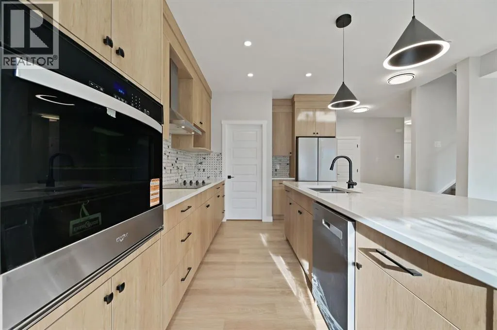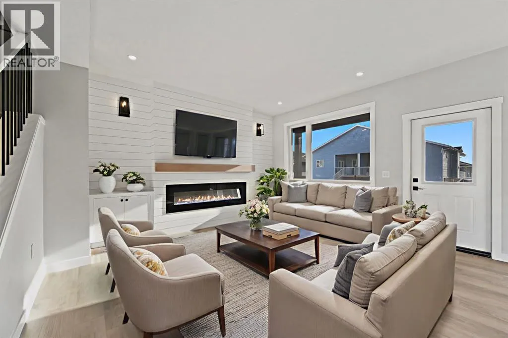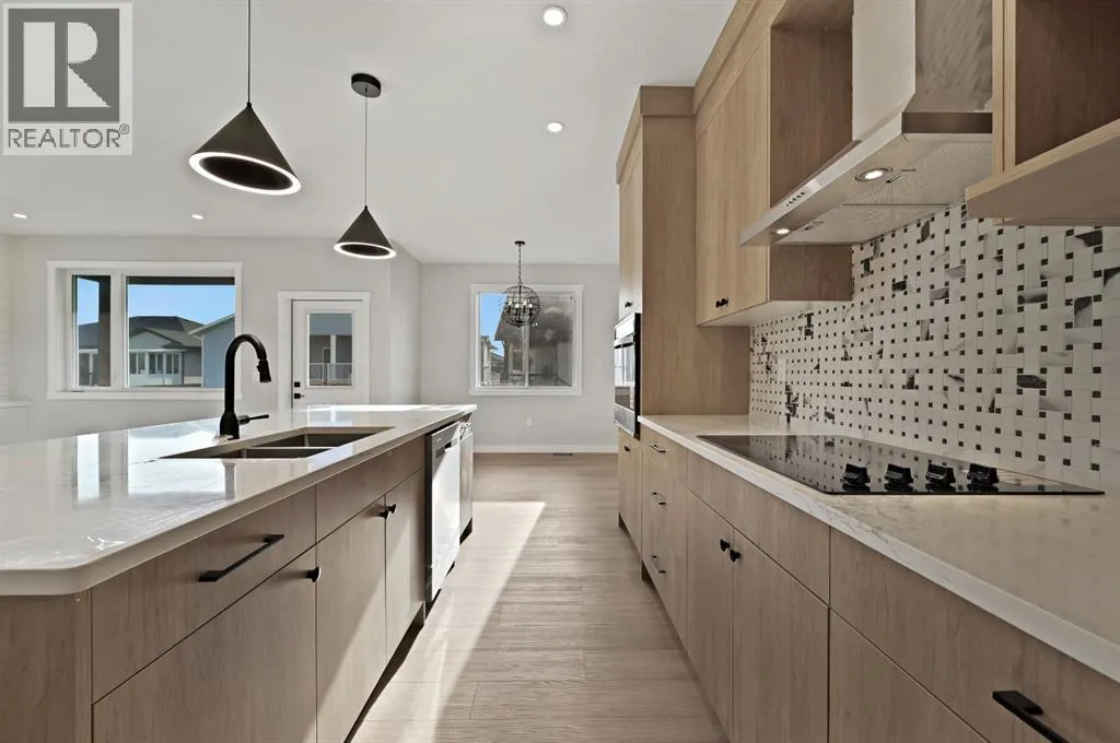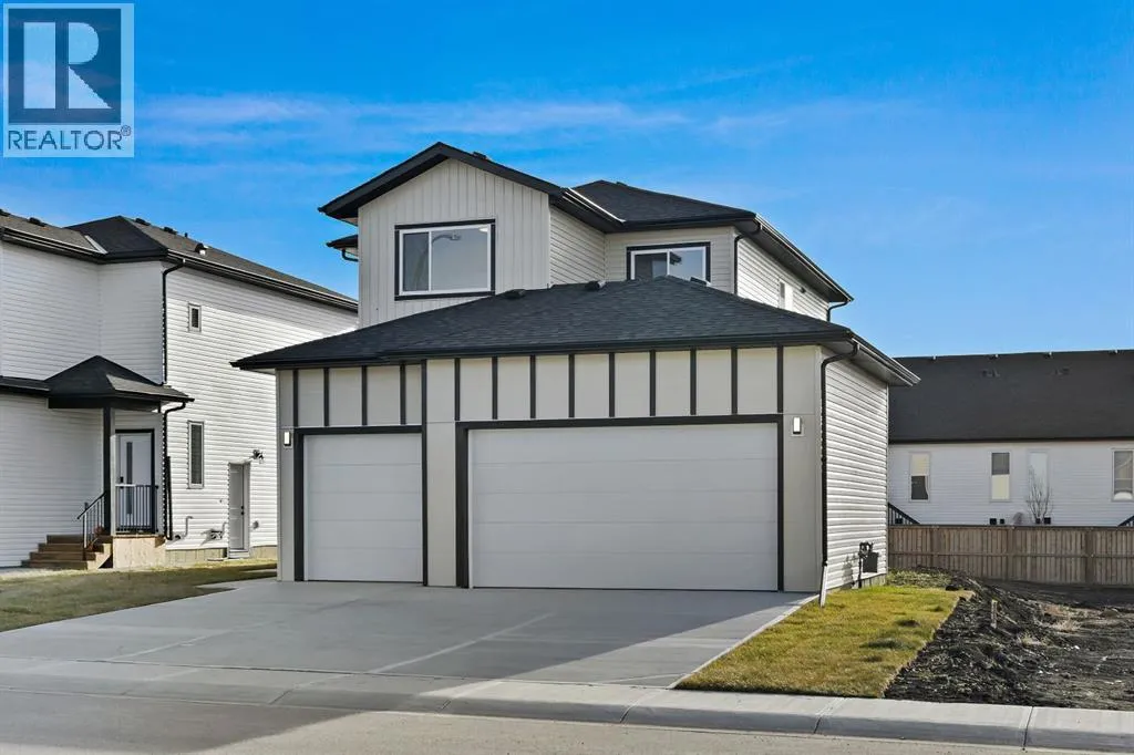 Discover this stunning 2025-built home that perfectly blends contemporary design with everyday functionality. Featuring a triple attached garage with 220V power, this property is ideal for todayâs modern lifestyle.Step inside to an open-concept main floor showcasing a chef-inspired kitchen complete with a large island, quartz countertops, built-in wall oven, electric cooktop, stylish range hood, and a convenient walk-through pantry. The dining area is illuminated by an elegant LED chandelier and flows seamlessly into the spacious living room, highlighted by a white feature wall and designer-style electric fireplace â perfect for entertaining or relaxing.The main floor is finished with sleek black Moen fixtures, LED lighting throughout, and a chic half bath. Upstairs, enjoy a bright bonus room and three spacious bedrooms, including a luxurious primary suite with a 4-piece ensuite. The additional full bath features Jack & Jill sinks and quartz counters, making it ideal for families. Convenient upper-level laundry adds to the thoughtful layout.A separate side entrance leads to a basement with rough-ins for future development â offering great income potential or flexibility for expansion. Outdoors, enjoy the covered back deck with a natural gas BBQ line, perfect for year-round entertaining.This move-in ready home in the vibrant community of Olds combines style, comfort, and opportunity. Donât miss your chance to make it yours! (id:27476)