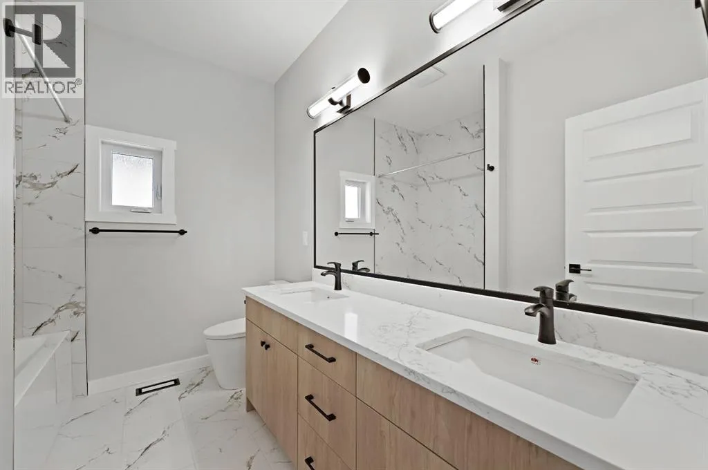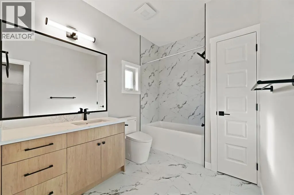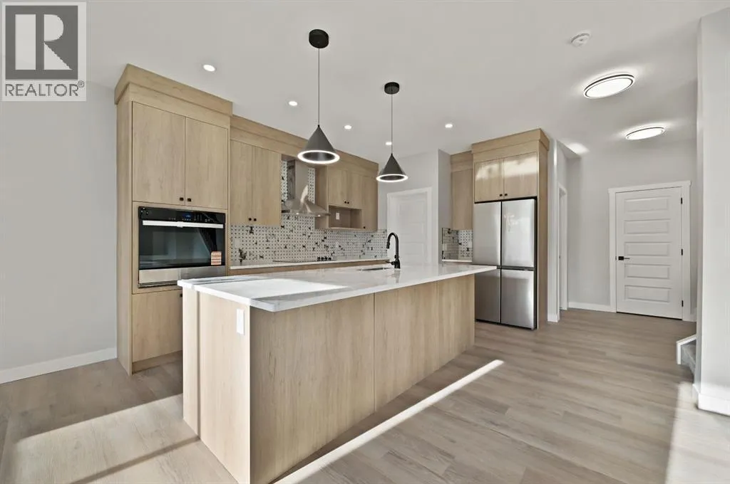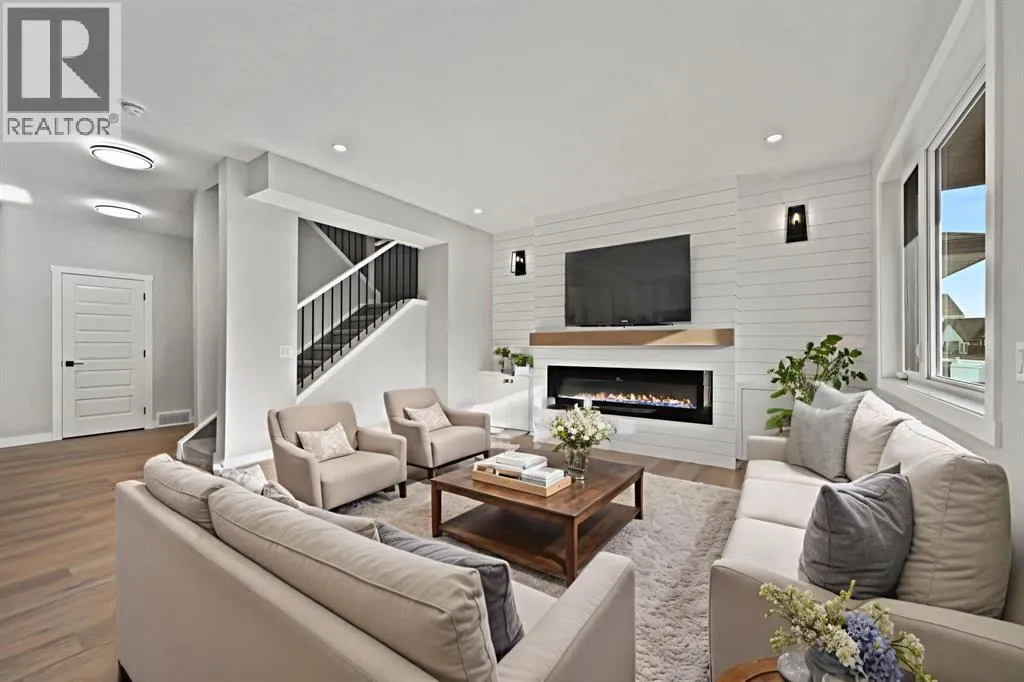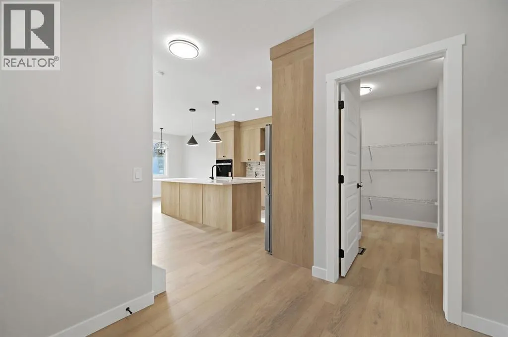 Discover this stunning 2025-built home that perfectly blends contemporary design with everyday functionality. Featuring a triple attached garage with 220V power, this property is ideal for todayâs modern lifestyle.Step inside to an open-concept main floor showcasing a chef-inspired kitchen complete with a large island, quartz countertops, built-in wall oven, electric cooktop, stylish range hood, and a convenient walk-through pantry. The dining area is illuminated by an elegant LED chandelier and flows seamlessly into the spacious living room, highlighted by a white feature wall and designer-style electric fireplace â perfect for entertaining or relaxing.The main floor is finished with sleek black Moen fixtures, LED lighting throughout, and a chic half bath. Upstairs, enjoy a bright bonus room and three spacious bedrooms, including a luxurious primary suite with a 4-piece ensuite. The additional full bath features Jack & Jill sinks and quartz counters, making it ideal for families. Convenient upper-level laundry adds to the thoughtful layout.A separate side entrance leads to a basement with rough-ins for future development â offering great income potential or flexibility for expansion. Outdoors, enjoy the covered back deck with a natural gas BBQ line, perfect for year-round entertaining.This move-in ready home in the vibrant community of Olds combines style, comfort, and opportunity. Donât miss your chance to make it yours! (id:27476)