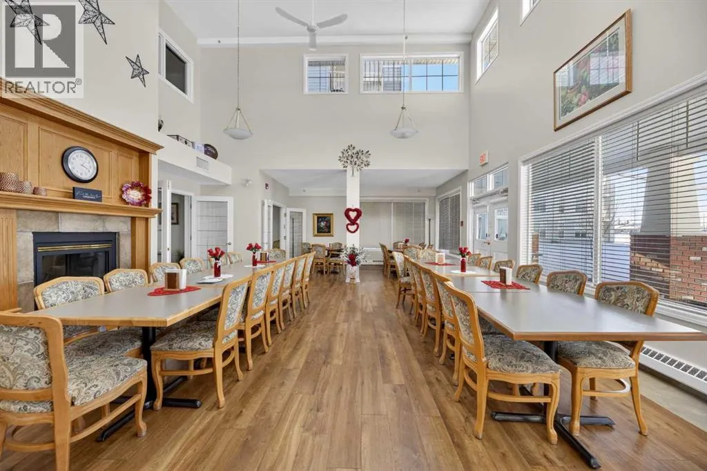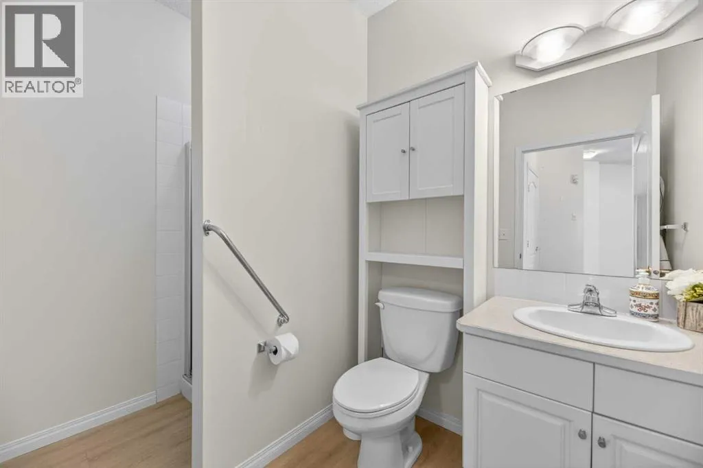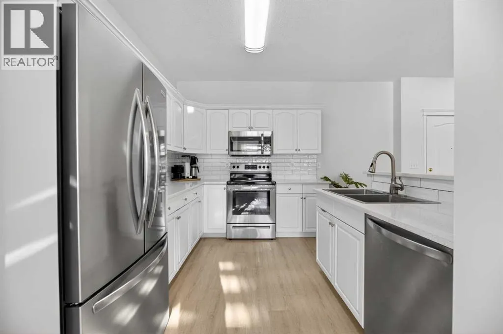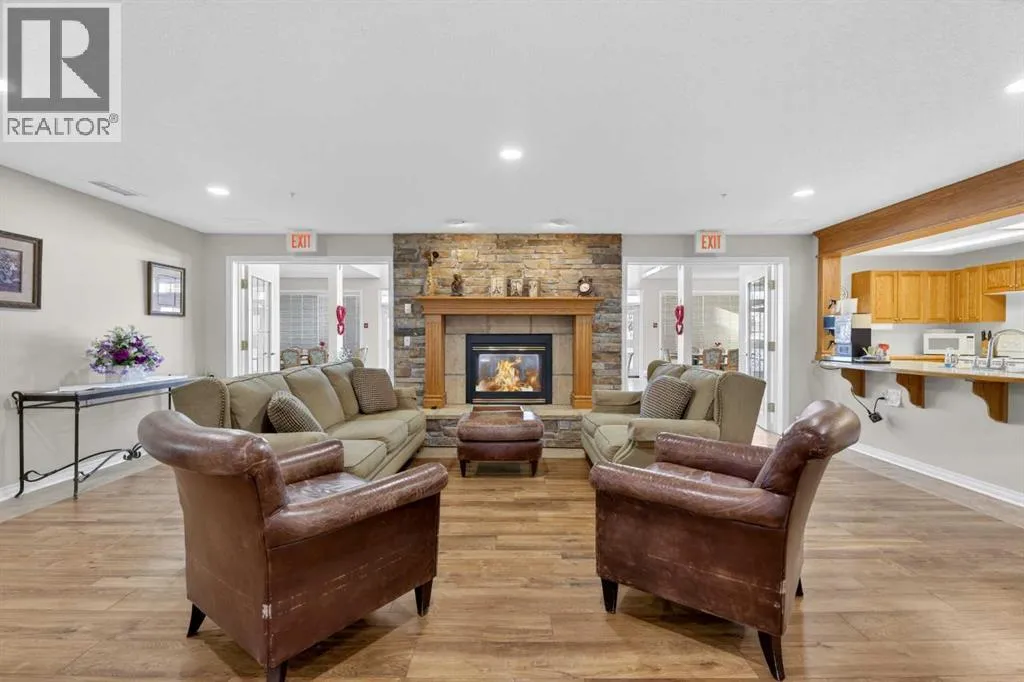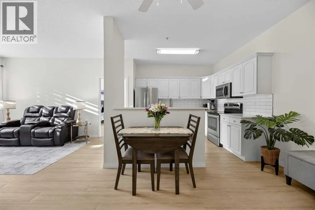 UPDATED, BRIGHT, MOVE-IN READY AND SURE TO IMPRESS LEGACY VILLAGE condo located in the HEART of Olds! Your tastefully updated & IMMACULATE second storey 2 BED + 2 BATH home with covered 9x7 balcony overlooking the west gardens/greenspace is the PRIME location in this sought-after and prestigious 55+ FRIENDLY & well-managed complex. Your new home also comes w/ ONE outdoor parking stall just steps from the front entrance. The 55+ complex has absolutely ALL of the LUXURY AMENITIES you would require including an owners' lounge with fireplace, a kitchen facility, dining room (seats 50), shuffleboard, billiards, workshop, well-equipped fitness room, puzzle/games room, library room, hair salon, and laundry facility for the bigger loads, etc... PLUS, you have access to TWO rental guest suites for only $65.00 per night when family or friends come to visit. As you enter your BRIGHT, warm and inviting condo you are greeted by a nice sized entrance with mirrored closet...your OPEN LAYOUT features the kitchen off to the side which is open to the living & dining areas that separate the bedrooms - absolute perfect set up for entertaining family & friends! Your LARGE primary bedroom retreat features a spa-like en suite w/ large walk-in tub & shower combo and extra storage cabinets. You will also love the storage your walk-in closet provides. Your second bedroom (or office) is the perfect size, and is located across from the main 3-piece bath. Enjoy the convenience of a generous sized laundry room w/ built-in cabinets, and full sized washer & dryer. The luxurious updates throughout your new home include NEW paint throughout, luxury vinyl plank, carpet, stainless steel appliances, quartz kitchen countertops, modern white subway tile back splash, beautiful spa-like washroom updates, baseboards, updated lighting, designer window coverings, outdoor sun shade on balcony, etc......YOUR NEW HOME LITERALLY HAS IT ALL! Sit back and relax whilst enjoying a nice drink on your covered bal cony that overlooks the beautiful garden area. This complex is ADULT LIFESTYLE at its absolute FINEST! Feel like being social? Each night the complex offers different social activities such as bingo, movie night, crib/cards, happy hour, etc.... Feel like going out? You are minutes away from all of the conveniences that family-friendly Olds has to offer --- grocery stores, clothing shops, restaurants, Olds College, historic theater, and all emergency services (Olds Hospital, etc.). Quick access to Highway 2, and Calgary airport is only 60 mins away! Don't miss out on the opportunity to wake up to the warmth and aesthetic pleasures of Legacy Village -- it feels like being on VACATION every single day! NOTE; CONDO FEES INCLUDE ALL UTILITIES -- PLUS CABLE!! Your unit also comes with it's own assigned storage locker! Enjoy a safe and quiet environment in your very well kept & well-managed complex-- not many units come available in this complex. You will LOVE this JEWEL OF A HOME! (id:27476)