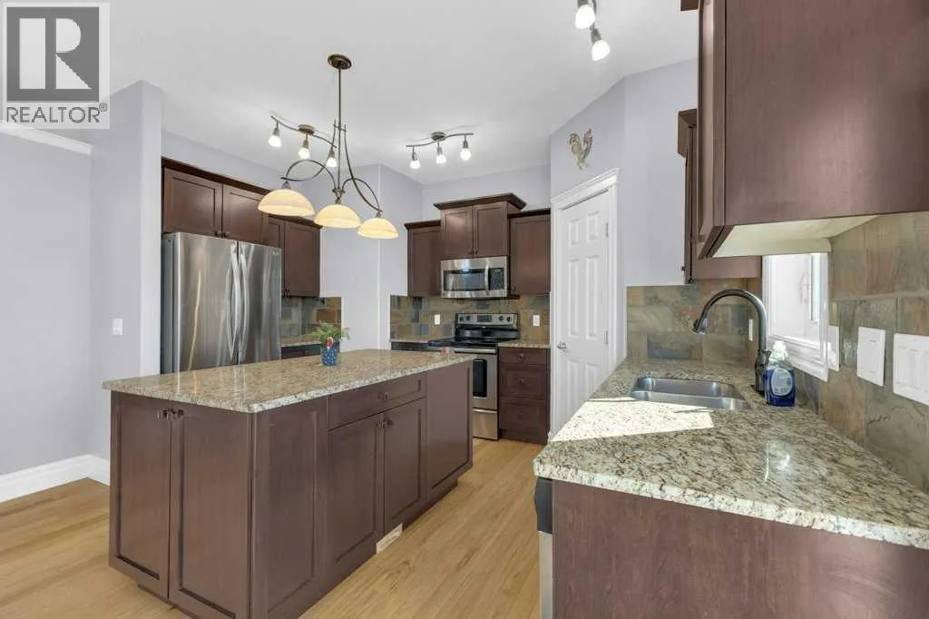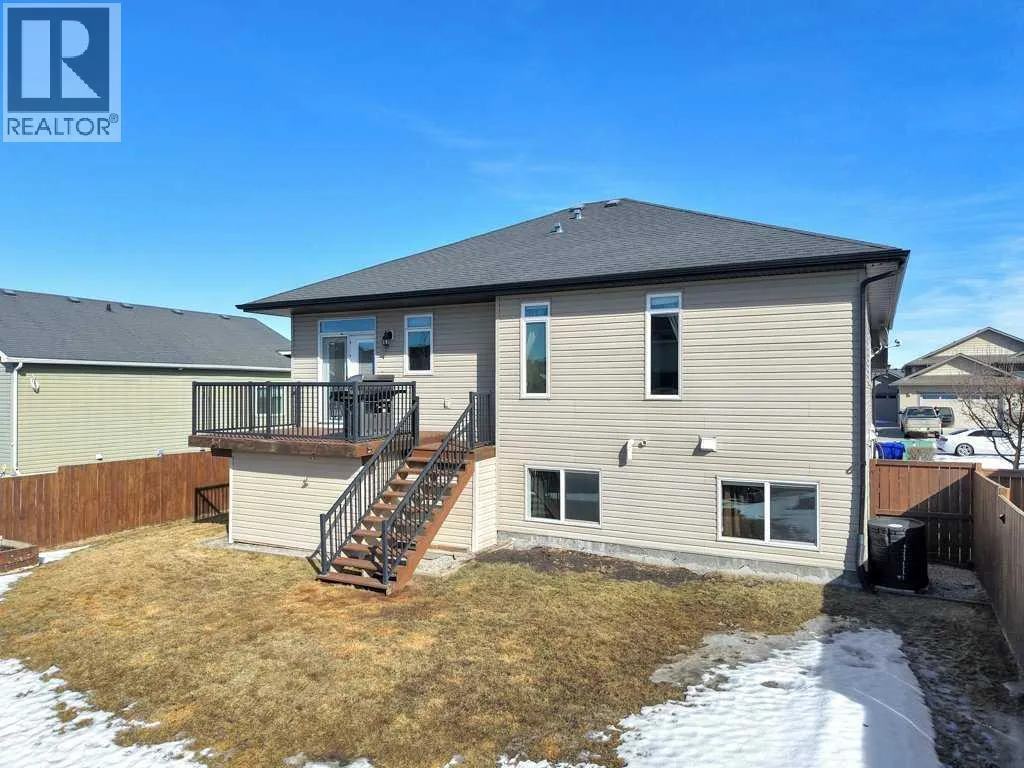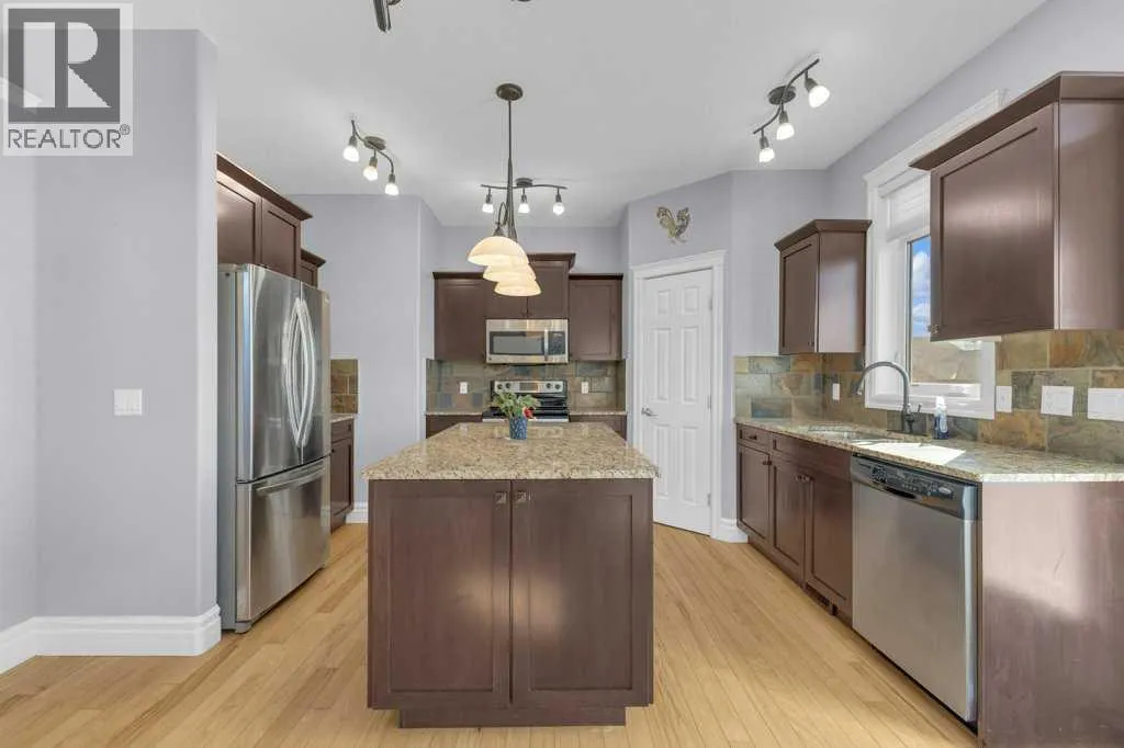 Welcome to this immaculately kept bi-level home offering over 2,600 sq. ft. of finished living space, featuring 5 bedrooms plus a flex/bonus room that could be used as an office, toy room, den or potential 6th bedroom. Ideally situated on a quiet cul de sac in the established community of The Vistas in Olds, this property is just steps from numerous walking trails, parks and the hospital. The bright, open concept main level showcases hardwood flooring throughout the principal living areas and a stunning kitchen complete with stainless steel appliances, granite countertops, a large island and a convenient corner pantry. The dining area provides direct access to a west facing deck with BBQ gas line, overlooking a fully landscaped and fully fenced yard that includes a fire pit, under-deck storage, and an 8â x 12â shed. The inviting living room features a natural gas fireplace with slate accents, creating a warm and welcoming focal point. The primary bedroom offers a walk in closet and private 3 pce ensuite, while two additional bedrooms and a full bathroom complete the main level. Brand new carpet has just been installed throughout the home, enhancing its fresh, turn key appeal. The fully developed lower level offers excellent additional living space with a spacious family room, flex room, two more bedrooms, a full bathroom, in floor heating, on demand hot water, and a dedicated separate laundry room. Further highlights include an extra wide driveway, insulated garage, furnace replaced in 2023, updated feature wall, fresh interior paint, and enhanced under deck storage. This well presented property offers an excellent blend of space, thoughtful updates, and a convenient location close to everyday amenities. Sellers are also providing a $9,000 decorating bonus to the buyer upon successful completion. Book your private showing today and discover the value this home has to offer. (id:27476)
