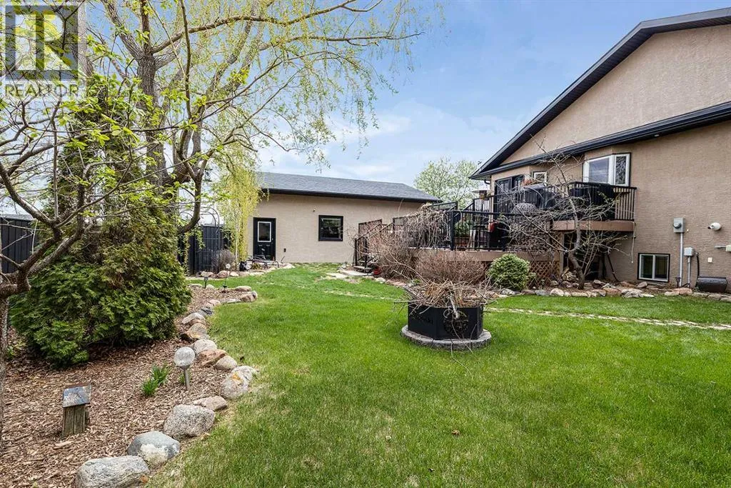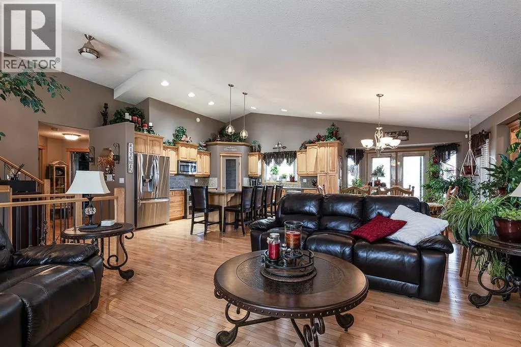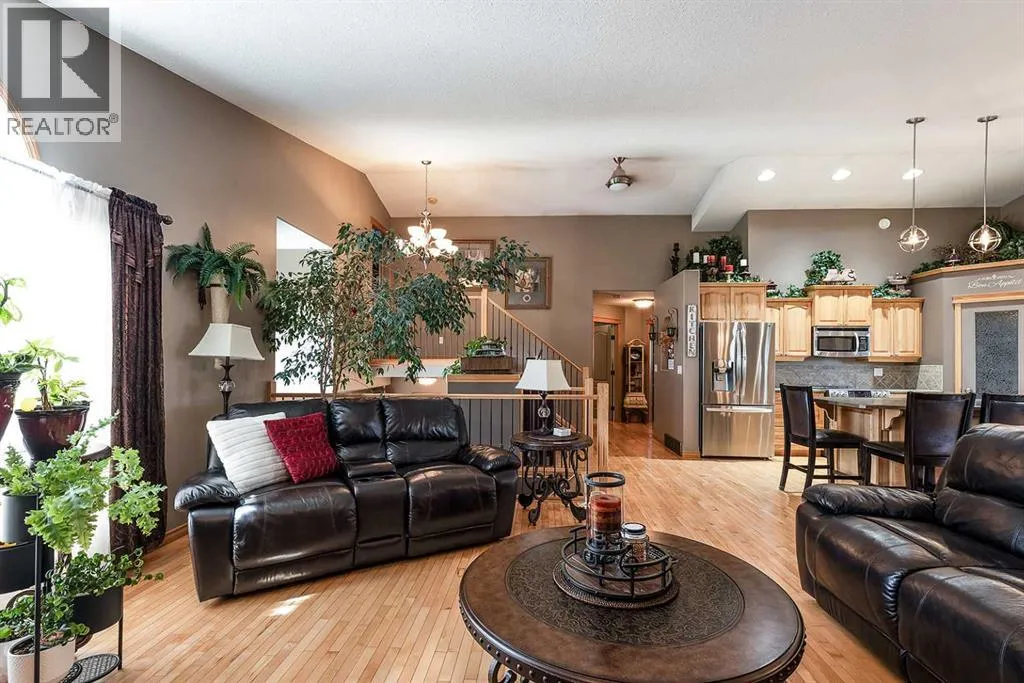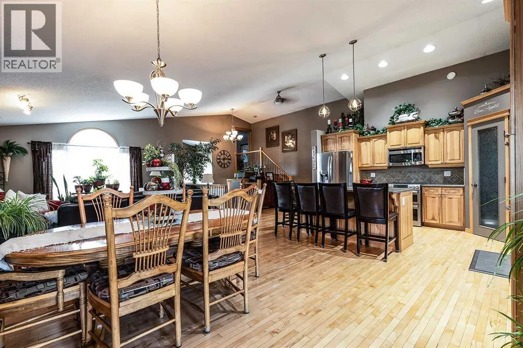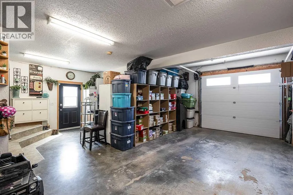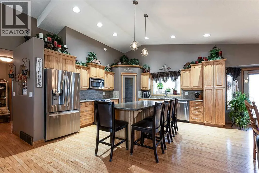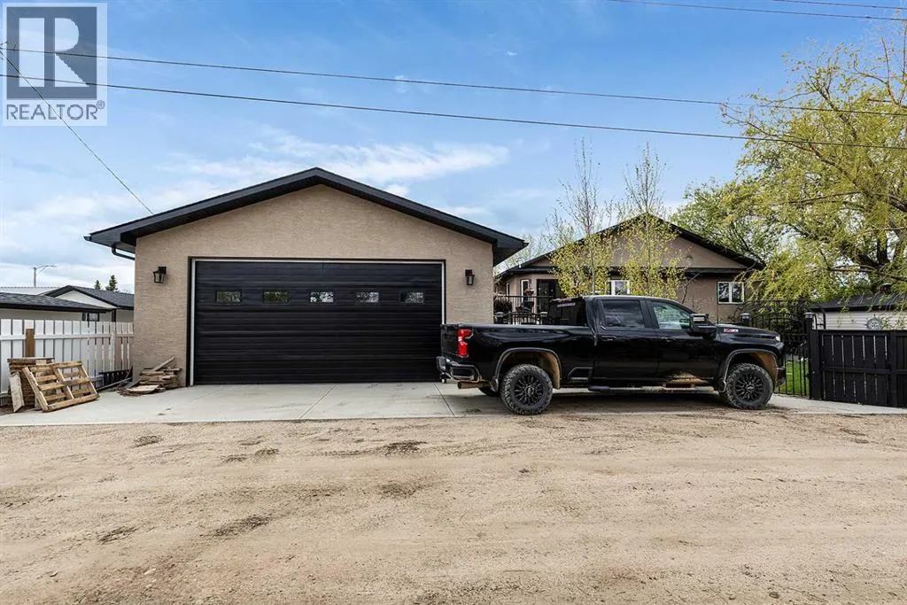 Discover luxury living in this exquisite 1940 sq ft modified bi-level residence, beautifully positioned on a generous double lot in Oyen, Alberta. Built in 2004 and meticulously maintained by its original owner, this home showcases a stunning stucco exterior complemented by new shingles, windows, and a garage door installed in 2023.Step inside to experience an inviting layout with three bedrooms on the upper level and two additional bedrooms downstairs. The highlight is the master suite above the garage, featuring a spacious walk-in closet and a 4-piece ensuite with a jetted tub and separate shower. The home's elegant interior is enhanced by radiant heated tile flooring with individual climate controls, rich hardwood, and plush carpeting in the bedrooms and lower level.Vaulted ceilings and a warm gas fireplace enrich the main living room, creating a welcoming atmosphere for relaxation and entertainment. The gourmet kitchen awaits with sleek maple cabinets, modern stainless steel appliances, and plumbing in place for a future gas stove, adding to its allure. A ready-to-install gas line for a BBQ just outside is perfect for culinary adventures.Practical amenities include an on-demand hot water system, a new central vacuum, and pre-wiring for a hot tub in the beautifully landscaped outdoor space. The fully fenced yard benefits from an underground sprinkler system, ensuring lush surroundings and easy maintenance.Completing this magnificent property are the garages: a double attached garage and a separate 28x32 detached garage, each fully insulated and heated. The attached garage features radiant floor heating, ideal for Alberta's cooler months. With ample space for vehicles, a workshop, or storage, and additional RV parking with electrical hookup, this home meets all your needs with unmatched style and functionality. (id:27476)