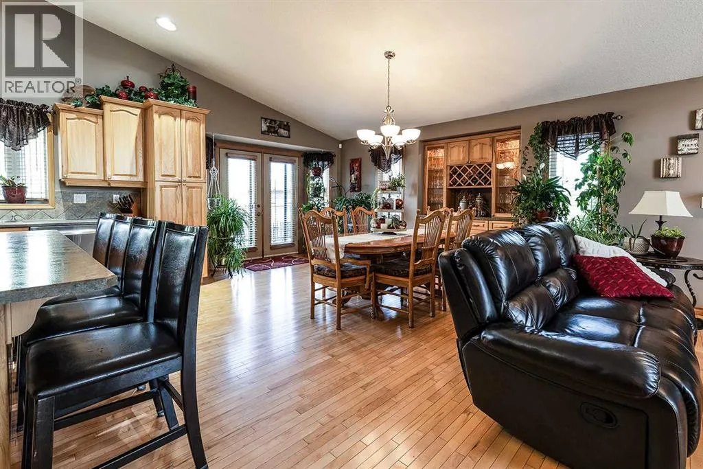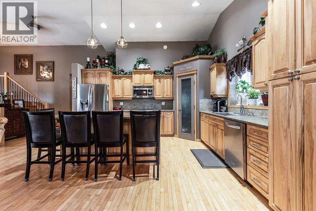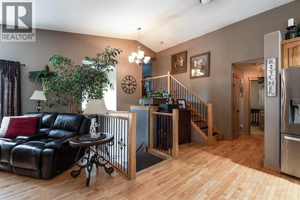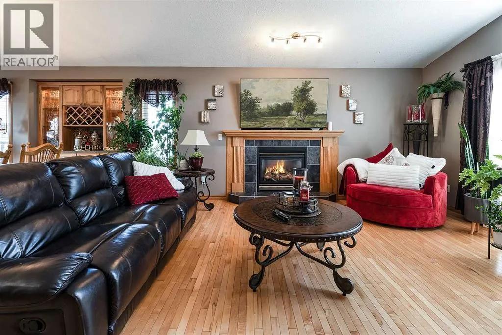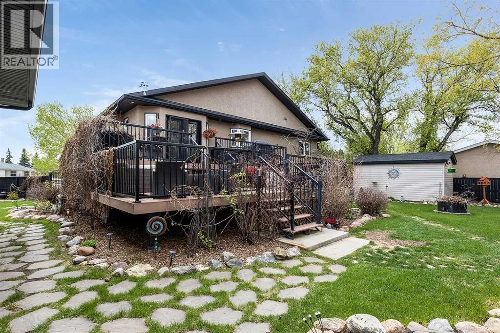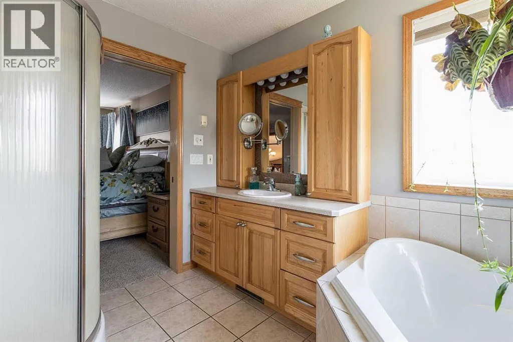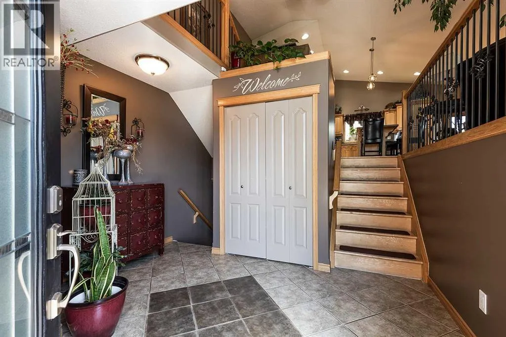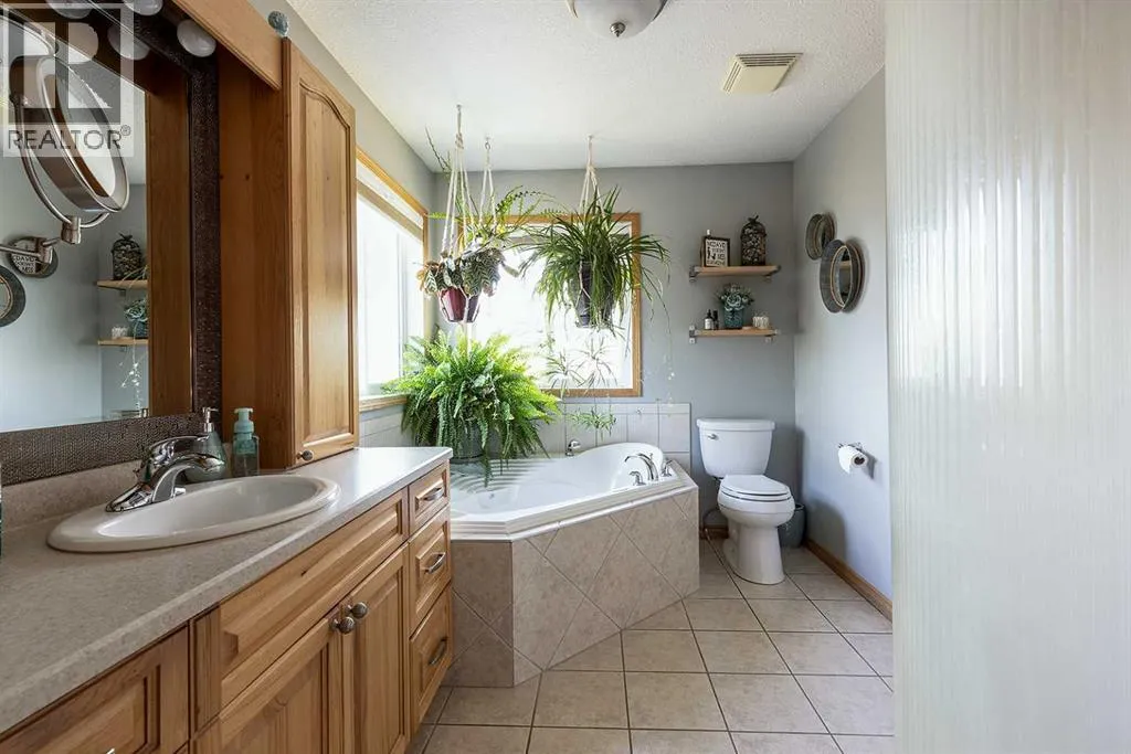 Discover luxury living in this exquisite 1940 sq ft modified bi-level residence, beautifully positioned on a generous double lot in Oyen, Alberta. Built in 2004 and meticulously maintained by its original owner, this home showcases a stunning stucco exterior complemented by new shingles, windows, and a garage door installed in 2023.Step inside to experience an inviting layout with three bedrooms on the upper level and two additional bedrooms downstairs. The highlight is the master suite above the garage, featuring a spacious walk-in closet and a 4-piece ensuite with a jetted tub and separate shower. The home's elegant interior is enhanced by radiant heated tile flooring with individual climate controls, rich hardwood, and plush carpeting in the bedrooms and lower level.Vaulted ceilings and a warm gas fireplace enrich the main living room, creating a welcoming atmosphere for relaxation and entertainment. The gourmet kitchen awaits with sleek maple cabinets, modern stainless steel appliances, and plumbing in place for a future gas stove, adding to its allure. A ready-to-install gas line for a BBQ just outside is perfect for culinary adventures.Practical amenities include an on-demand hot water system, a new central vacuum, and pre-wiring for a hot tub in the beautifully landscaped outdoor space. The fully fenced yard benefits from an underground sprinkler system, ensuring lush surroundings and easy maintenance.Completing this magnificent property are the garages: a double attached garage and a separate 28x32 detached garage, each fully insulated and heated. The attached garage features radiant floor heating, ideal for Alberta's cooler months. With ample space for vehicles, a workshop, or storage, and additional RV parking with electrical hookup, this home meets all your needs with unmatched style and functionality. (id:27476)