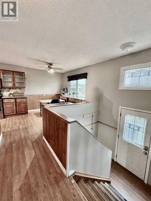 Searching for a new home? Welcome to this inviting home perfectly situated in the heart of the North End. This property is ideally located within walking distance of schools and daycare, and essential family amenities like the arena and pool are just around the corner, making everyday life simple and comfortable. The home offers a cozy kitchen and dining area, featuring a warm stone backsplash complemented by wood cabinetry and new flooring. The dining space includes a large window that overlooks a children's park and play center. Just off the kitchen, you'll find an over-the-garage patio with an updated railing, providing magnificent views of the east hills - an ideal spot for relaxing and barbequing with friends and family. This quiet, private and safe location is truly perfect for raising a family. Recent updates to the home include a new furnace installed in 2024. Some flooring has been updated, along with new siding and fencing. Windows and doors are only 8 years old. Additionally, a second bathroom is currently being installed in the lower level. With its blend of comfort, convenience, and a beautiful setting, this property is a wonderful place to call home. (id:27476)