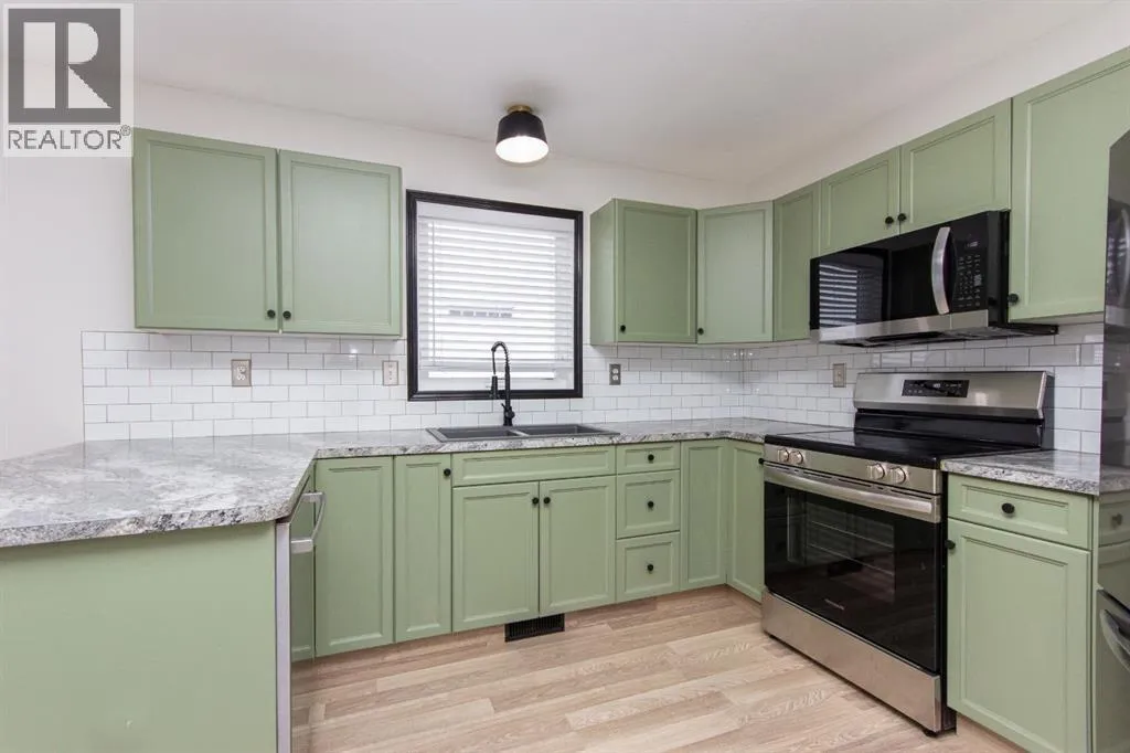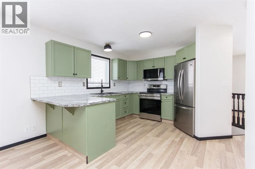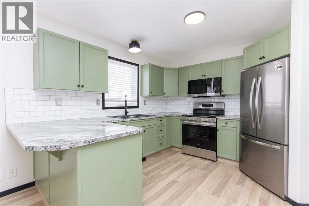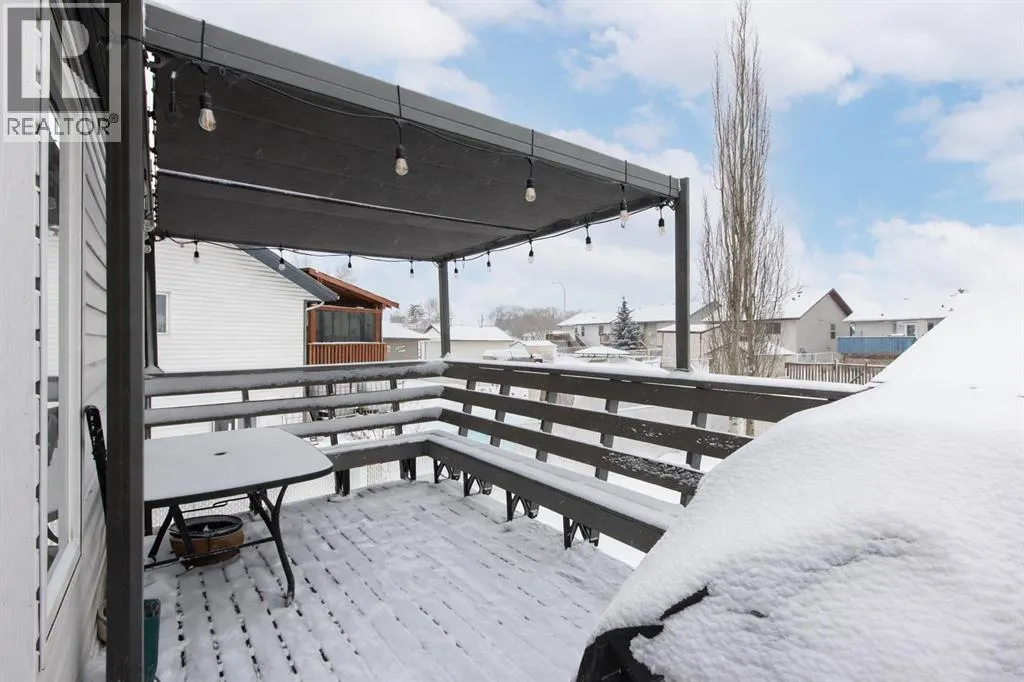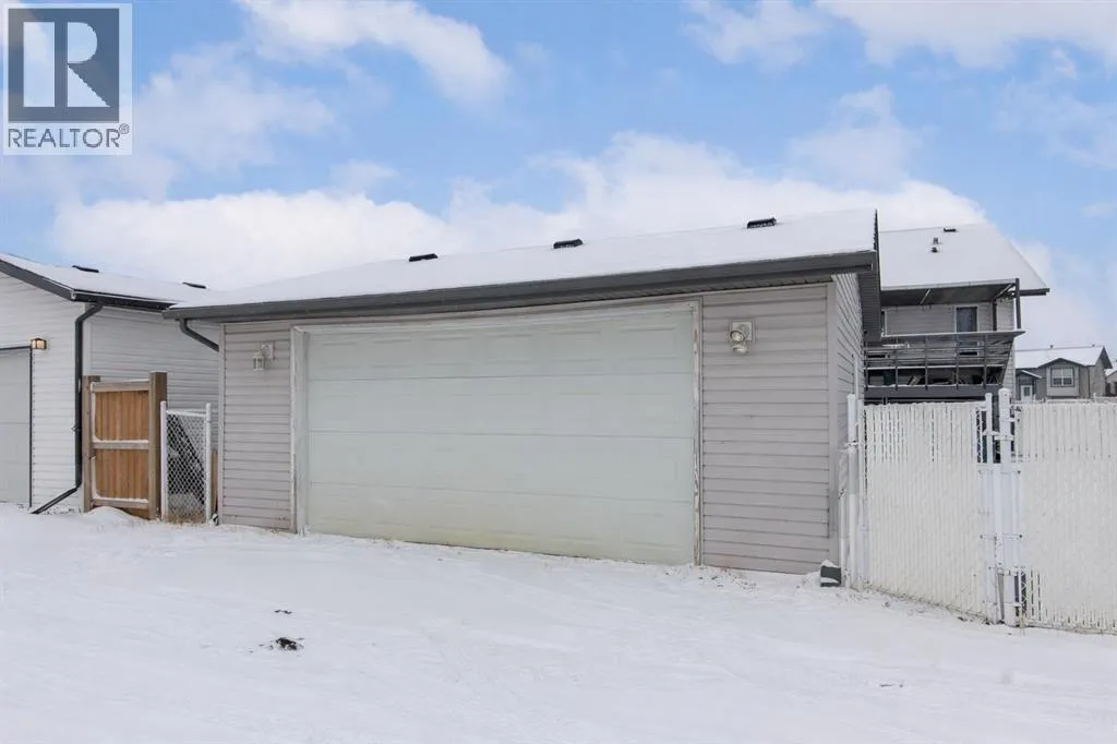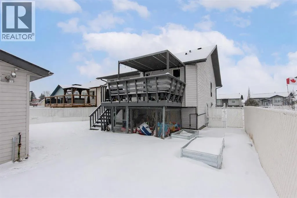 Welcome to this beautifully updated five bedroom, two bathroom bilevel nestled on a quiet close in the charming town of Penhold. From the moment you step inside, youâll notice the care that has gone into this home, featuring new vinyl flooring on the main level, fresh paint throughout, and updated light fixtures.As you head upstairs, the space opens into a bright and inviting living room. Just off the living room, the kitchen is sure to impress with stunning green cabinetry, newer stainless steel appliances, and a breakfast bar perfect for casual dining. A dedicated dining area completes this wonderful space for entertaining.Down the hall youâll find two bedrooms, including a versatile room ideal for a guest bedroom or home office, and a generous master bedroom overlooking the yard, bathed in natural light. The crown jewel of this floor is the stunning renovated bathroom, complete with a spa-like soaker tub, beautiful tile floors, and a new vanity.The main floor also features a large laundry room and mudroom leading out to the backyard, where a covered deck with a built-in bench awaits. Tucked beneath the deck is a fenced storage area, perfect for bikes and outdoor toys.The large heated double garage offers ample parking and two ceiling-mounted storage areas to keep everything organized.Downstairs, the basement provides a spacious TV room, three additional bedrooms, and a three-piece bathroom, offering plenty of room for the whole family.Additional updates include a newer hot water tank, A/C and shingles replaced around 2020, giving you peace of mind for years to come. This home is truly move-in ready. (id:27476)