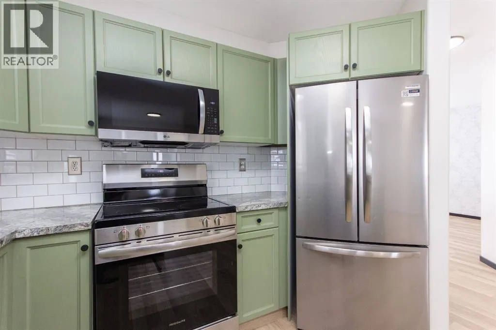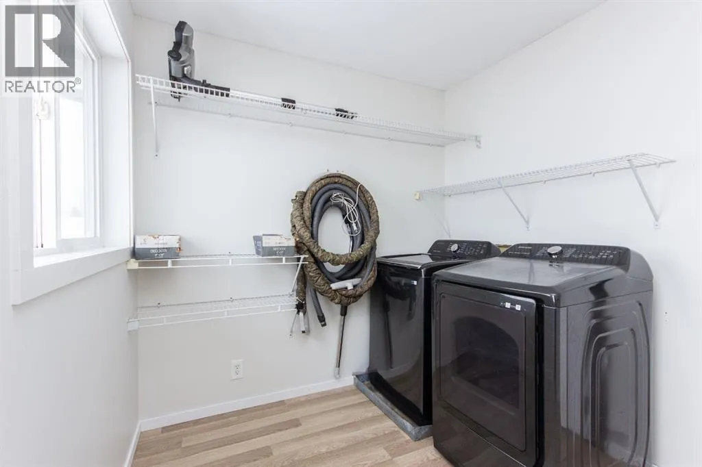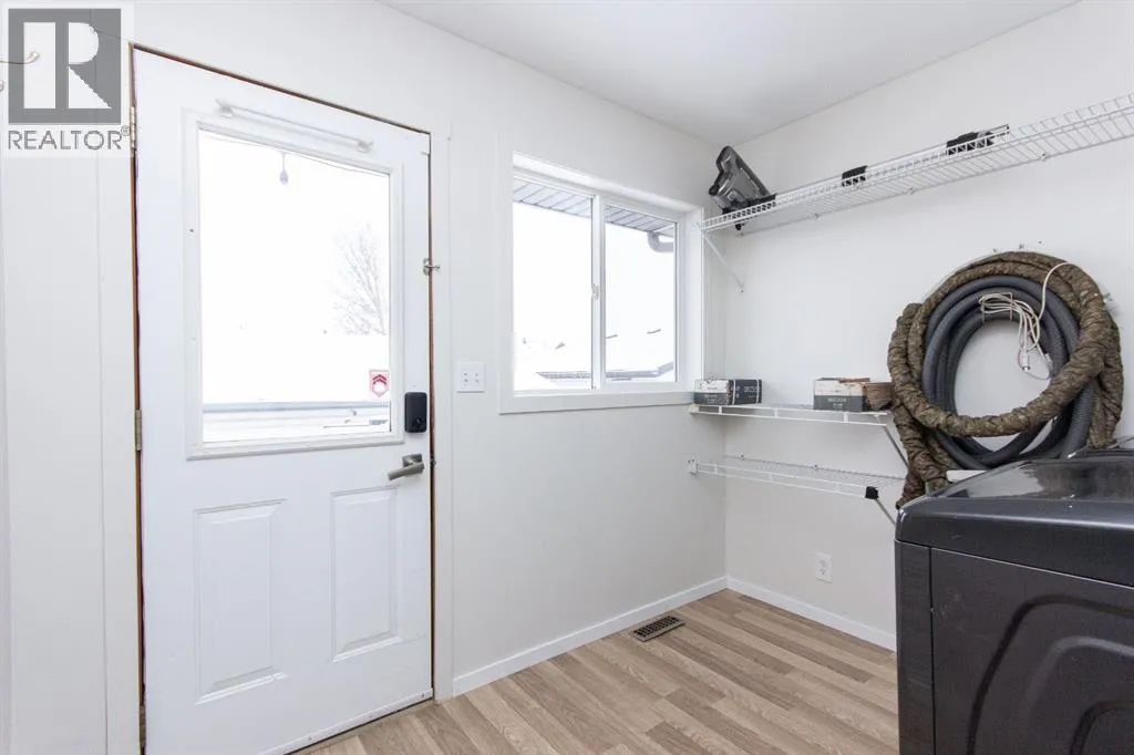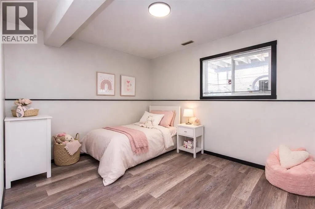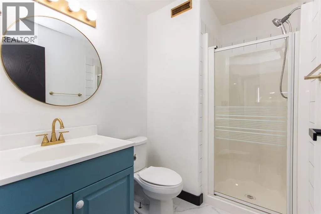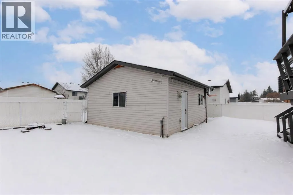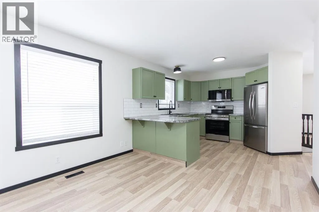 Welcome to this beautifully updated five bedroom, two bathroom bilevel nestled on a quiet close in the charming town of Penhold. From the moment you step inside, youâll notice the care that has gone into this home, featuring new vinyl flooring on the main level, fresh paint throughout, and updated light fixtures.As you head upstairs, the space opens into a bright and inviting living room. Just off the living room, the kitchen is sure to impress with stunning green cabinetry, newer stainless steel appliances, and a breakfast bar perfect for casual dining. A dedicated dining area completes this wonderful space for entertaining.Down the hall youâll find two bedrooms, including a versatile room ideal for a guest bedroom or home office, and a generous master bedroom overlooking the yard, bathed in natural light. The crown jewel of this floor is the stunning renovated bathroom, complete with a spa-like soaker tub, beautiful tile floors, and a new vanity.The main floor also features a large laundry room and mudroom leading out to the backyard, where a covered deck with a built-in bench awaits. Tucked beneath the deck is a fenced storage area, perfect for bikes and outdoor toys.The large heated double garage offers ample parking and two ceiling-mounted storage areas to keep everything organized.Downstairs, the basement provides a spacious TV room, three additional bedrooms, and a three-piece bathroom, offering plenty of room for the whole family.Additional updates include a newer hot water tank, A/C and shingles replaced around 2020, giving you peace of mind for years to come. This home is truly move-in ready. (id:27476)