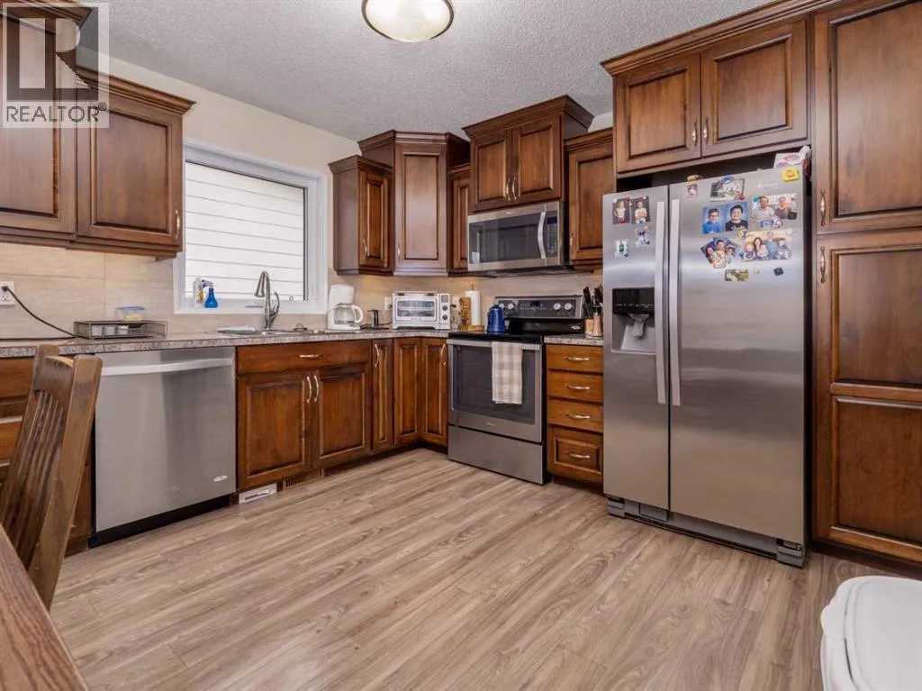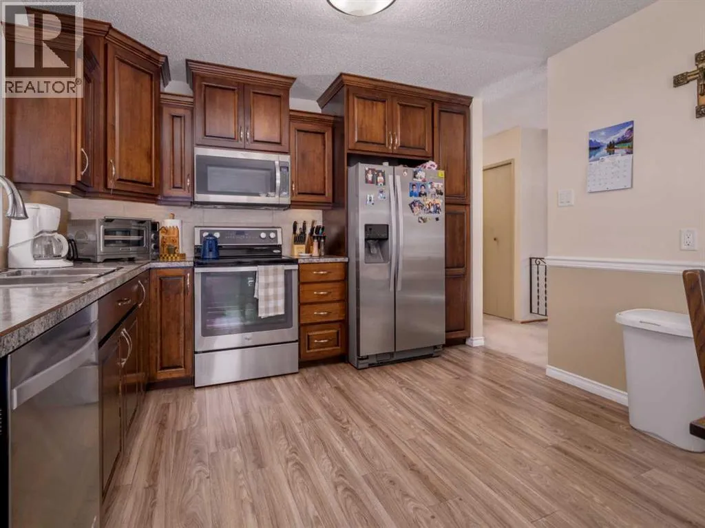 Beautiful fully developed bi-level offering over 1,100 sq ft of stylish, functional living space. This home features a stunning updated kitchen with stainless steel appliances and plenty of room to gather and entertain. With 3 bedrooms up and 2 down, thereâs space for the whole family.Extensive upgrades provide peace of mind, including newer windows (3 years), Hardie plank siding, roof, furnace, hot water tank, and updated flooring. The fully finished basement boasts a spacious family room with cozy baseboard heating and convenient access to the backyard. Step outside to your private yard complete with lawn space and a stone patioâperfect for relaxing or hosting guests. The detached double garage is a mechanics dream, featuring in-floor heating, and 9â doors. Enjoy the added convenience of a covered carport with durable torch-on roofing for year-round protection. This is a must-see property offering comfort, updates, and incredible garage space! (id:27476)