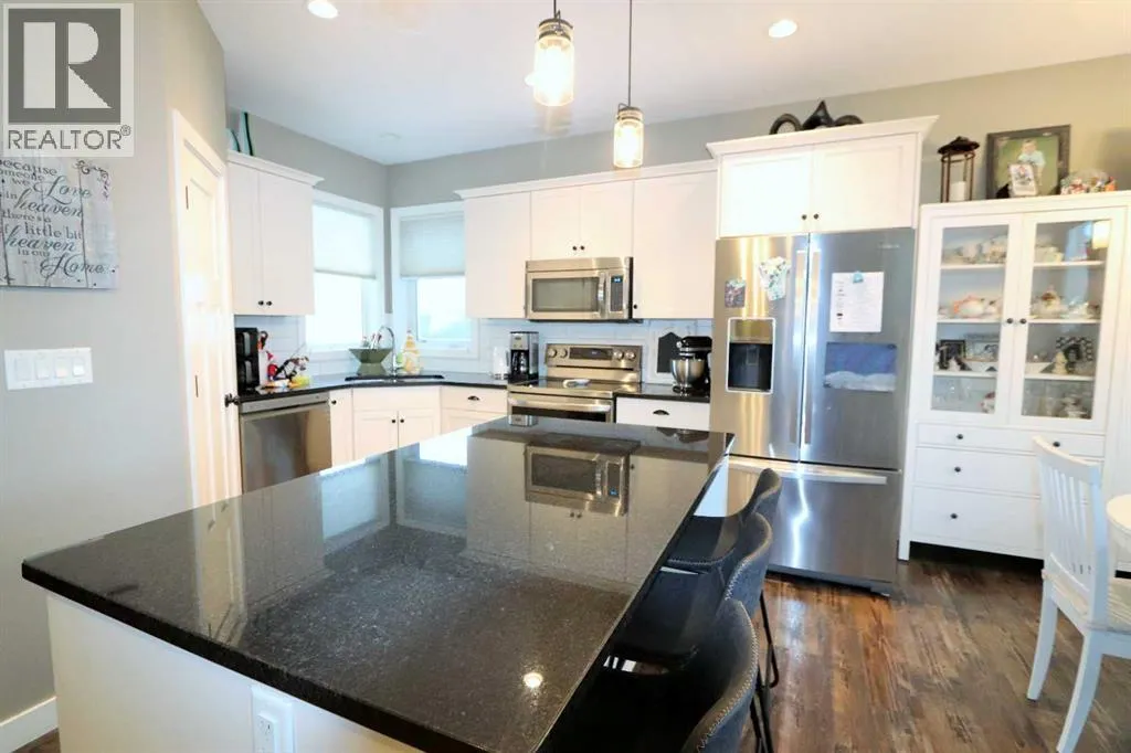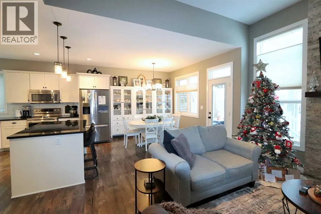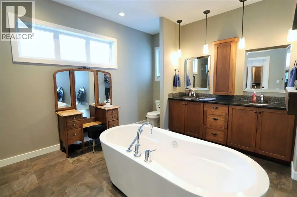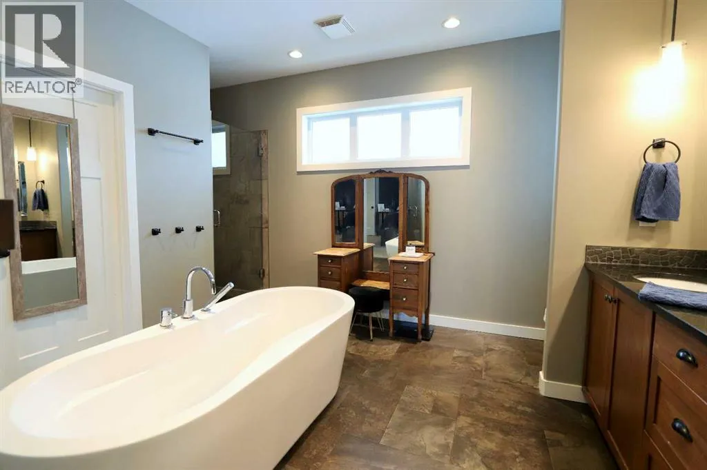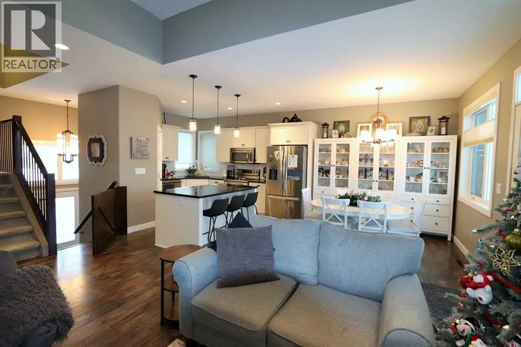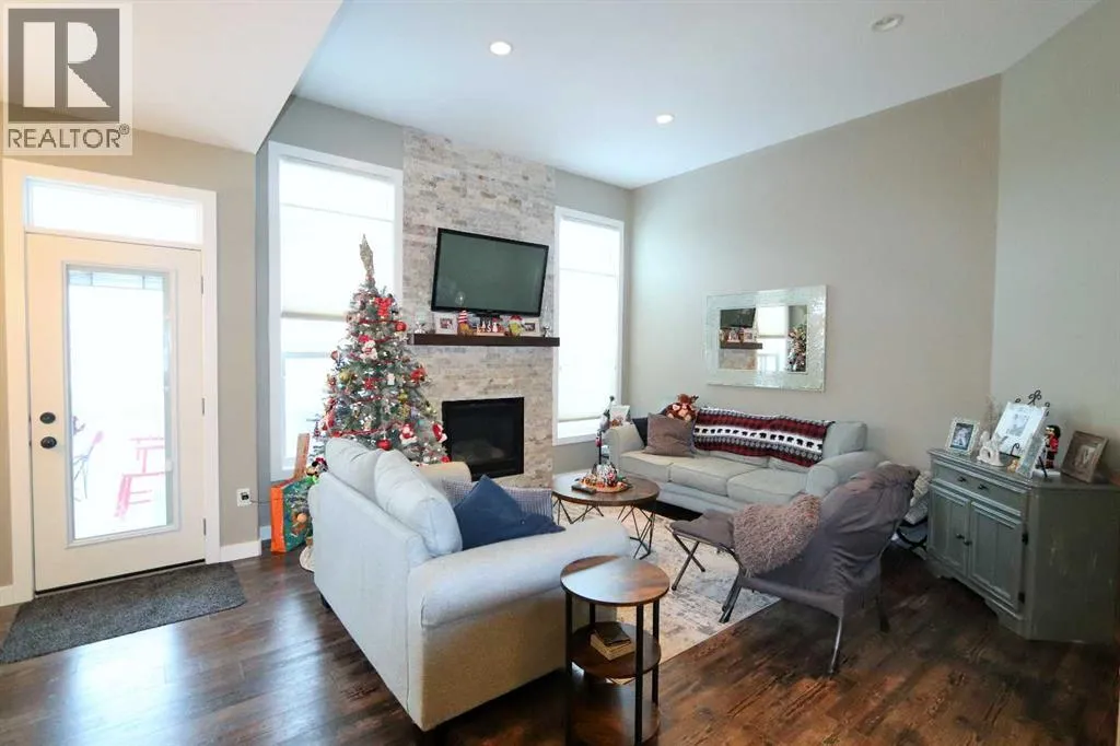 Discover this impressive modified bi-level situated in a highly desirable Riverside location. Designed with comfort and functionality in mind, the open-concept main living area features 9-ft ceilings throughout and a raised ceiling in the living room, adding to the sense of space and showcasing the striking floor-to-ceiling stone fireplace. The kitchen offers an ideal layout for everyday living and entertaining, complete with a large island, quality granite countertops, pantry and stainless steel appliances. The main floor includes two well-appointed bedrooms and a full bathroom, while the stunning primary suite is set just a few steps up for added privacy. This retreat features barn-style tracked doors, a spacious walk-in shower, large vanity, walk-in closet, and a beautiful freestanding tub positioned as the focal point of the spacious ensuite. The fully finished basement with in-floor heat expands the living space with a bright family/rec room, thanks to generous windows that fill the area with natural light. In-floor heat adds welcome comfort and efficiency. A fourth bedroom and an additional full bathroom complete the lower level. Enjoy the back yard with maintenance-free vinyl fencing, a large play area for kids, and relax or entertain on lower deck or covered deck off the dining area. The 24Ã26 heated attached garage has an epoxy floor coating, other recent upgrades include new shingles and siding in 2023. There's an additional electrical and gas services should you wish to build a second garage. This property combines thoughtful design, modern comfort, and an unbeatable locationâtruly a place to call home. (id:27476)