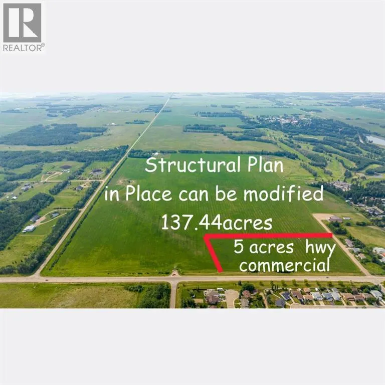 Looking for Prime Land for Farmland / Development / or Investment in Central Alberta just off Highway 2 in-between Calgary in Edmonton, This Is It! Exceptional 137.44-acre Development Parcel located on the South-East corner of Ponoka along Highway 53. This property has been annexed into the Town of Ponoka and includes a Structural Plan of 400 Single-Family Residential Lots, with possibilities for modifications for Multi-Family and Duplex Development and possibility of Senior Complex along side Single-Family Residence subject to Town Approval. 5 acres of land have been Designated Highway Commercial Development. The property offers Beautiful Views overlooking the Battle River Valley, potential Walkout Lots, and is lined with Mature Spruce Trees along the East boundary, creating a stunning Natural Backdrop and adding value for a Future Subdivision. The West side backs onto the Ponoka Golf Course, further enhancing the appeal for Residential Development. Ideally located with Quick Access to Highway 2, providing Convenient Travel to Red Deer, Edmonton, the University of Alberta, and Edmonton International Airport. This property is centrally located for easy access to all major racetracks which is a multi million dollar industry in Alberta. [ Alberta is home to 37% of all horses in Canada ]. Ponoka has Two Local Hospitals, one is a Major Brain Injury Hospital and Mental Health Centre in Alberta, plus this property location has access to a min of 25 hospitals in Central Alberta within an hour drive for anyone in the Medical Profession looking for Local Employment Opportunities or Development. And let us not forget the annual Tourist Attraction, “The Ponoka Stampede”; the second largest Pro Rodeo and World Professional Chuckwagon Races in Canada!! Recent expansion of the Local Airport makes it a Vibrant and Growing Community in Central Alberta (which is a CBSA Canpass airport which means if you apply to be part of the Canpass and if are accepted into the program you can cl ear customs in Ponoka). The land is currently producing hay (approx. 598 bales annually), and the seller is willing to rent back the farmland until development begins, offering Interim Income Potential. An additional 5.4-acre acreage (MLS A2290624) with a High-End Two-Storey home, double attached garage, covered veranda, and Quonset is available for purchase separately or together with the bare land making this an Outstanding Package of land to own or create your own Yellowstone Ranch. Municipal water and sewer services are located at the Northwest corner of the property, supporting Future Development. A Rare Opportunity to secure a Large-Scale Development parcel in one of Central Alberta’s most Desirable and Strategically Located communities. (id:27476)