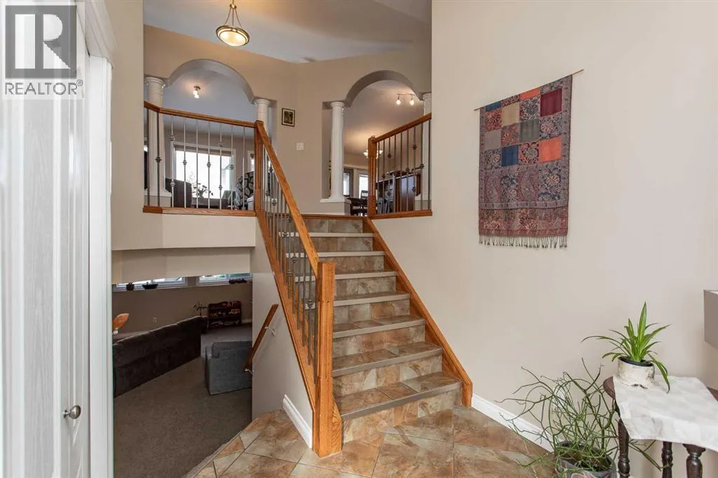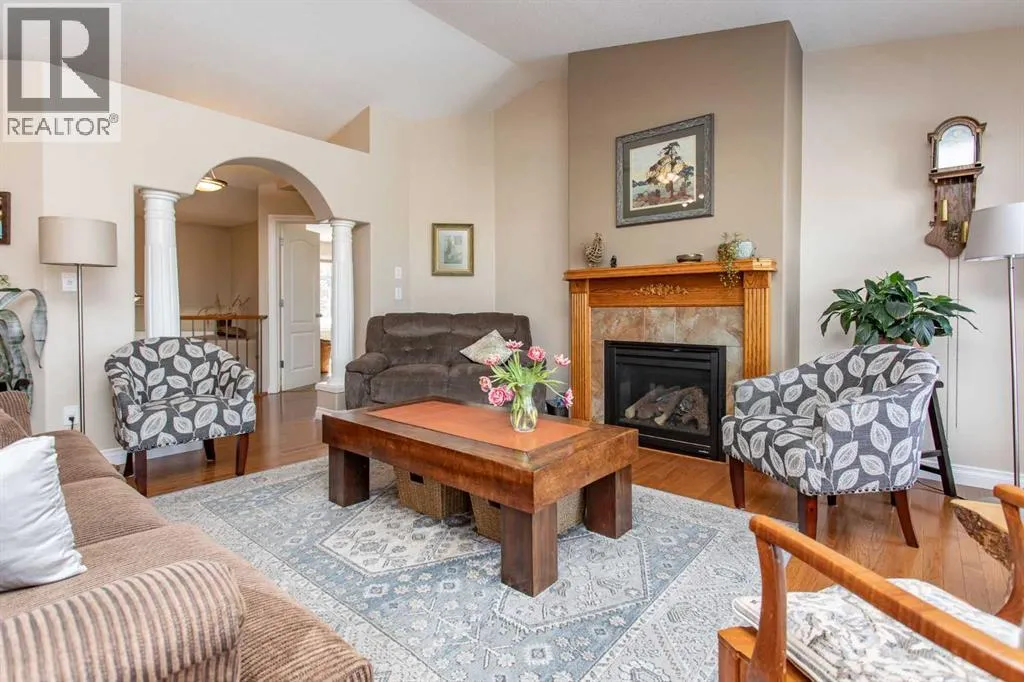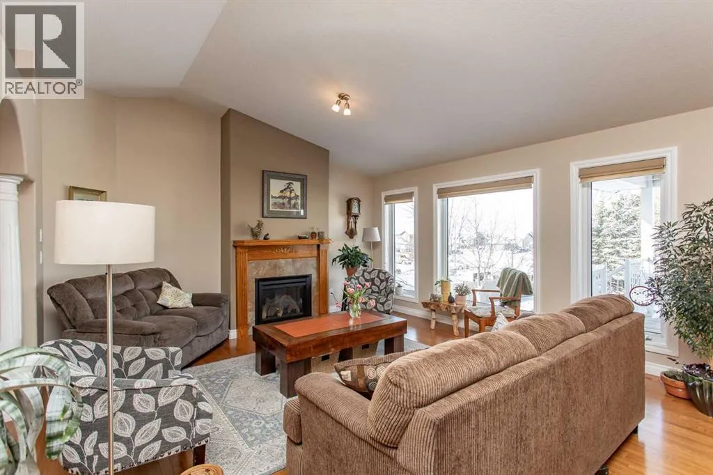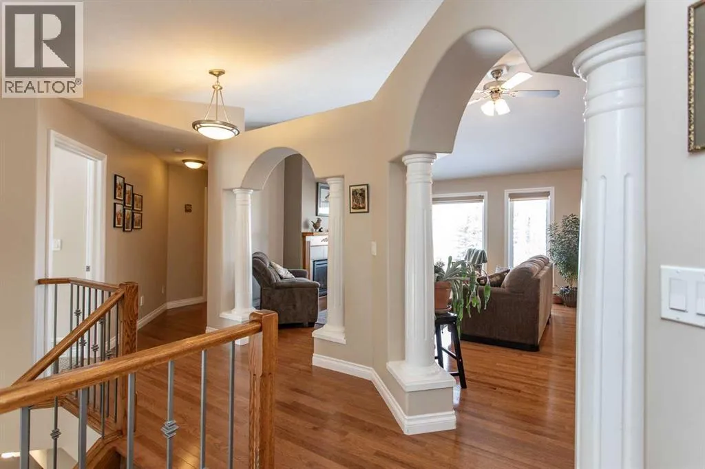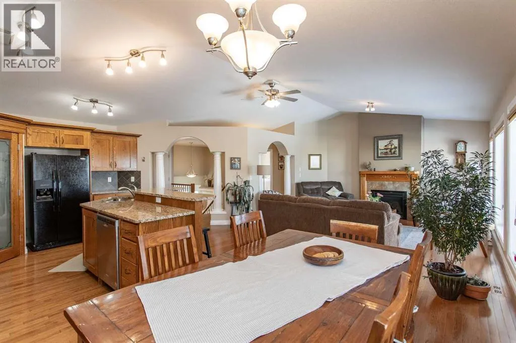 This well-maintained home in Ponokaâs Riverside area sits on a quiet cul de sac. It features quality craftsmanship, a spacious tiled entry, and inviting arches leading to the open-concept kitchen, dining, and living areas. The kitchen offers plenty of cabinets, granite countertops, and a corner pantryâideal for entertaining. Upstairs includes a primary bedroom with walk-in closet and ensuite, two additional bedrooms, and a four-piece bathroom. The finished basement has a family room with gas fireplace, two more bedrooms, another full bath, laundry, and in-floor heat. Additional highlights are underground sprinklers, gas BBQ hookup, landscaped yard with mature trees, and a firepitâperfect for summer evenings. This home is ready for its next family. (id:27476)