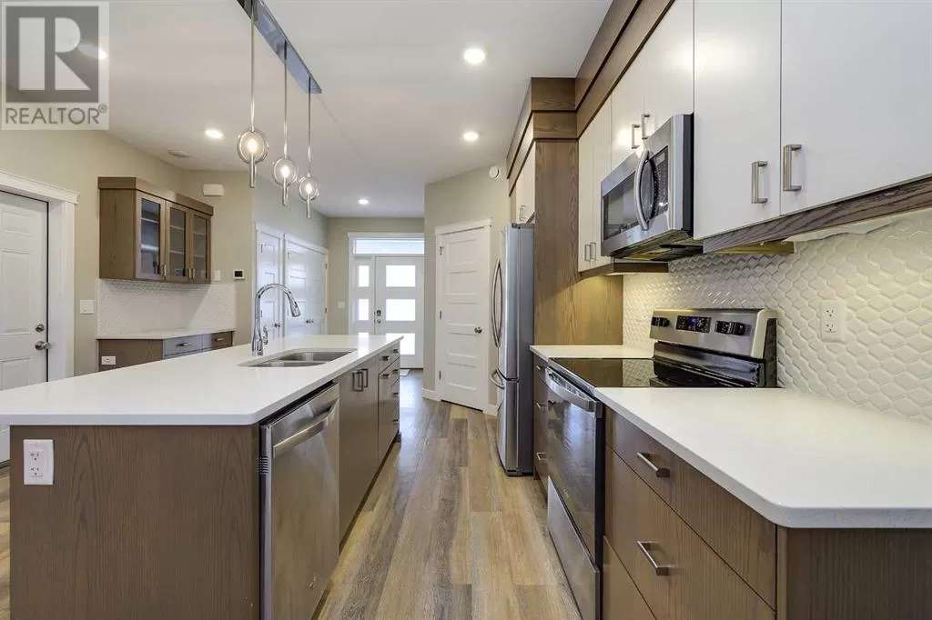 Welcome to your dream propertyâa fabulous lifestyle Carriage home that effortlessly blends modern comfort with a separate residence! This property is thoughtfully designed to cater to both family living and smart potential investing. A unique opportunity to invest in both luxurious living and intelligent financial planning. Comprising of an additional full-sized 1-bedroom residence situated above a spacious, detached double car garage, which backs onto a paved alley! Suitable for multigenerational families, small businesses, or rental purposes.Step inside the primary residence from the welcoming front covered porch and discover a bright, open-concept main floor. The living, dining, and kitchen areas flow seamlessly together, creating an inviting space for everyday living. At the heart of the home, a generously sized quartz island anchors the kitchenâideal for meal prep, casual dining, and entertaining guests.Upstairs, discover three spacious bedrooms, including the master suite, complete with a private 5-piece ensuite, ensuring a peaceful retreat at the end of the day. A well-appointed main bathroom complements the additional 2 bedrooms for family and visitors.The separate charming one-bedroom unit features its own kitchen and living room. It is currently leased. This independent space offers an ideal opportunity to generate rental income or serve as a perfect setting for a small business.Whether you're looking to expand your investment portfolio or create an older children's separate living arrangement, the possibilities are endless with this well-designed unit.The property includes a detached double garage( would make an awesome man cave!), a single attached garage, and a paved parking pad, offering ample off-street parking.Situated in a great neighborhood, you are just steps away from shopping, schools, parks, and recreational facilities. Enjoy the convenience of urban living while residing in a quiet, welcoming area.Don't miss the chance to experi ence this remarkable and unique property that combines elegance, flexibility, and location advantages. (id:27476)