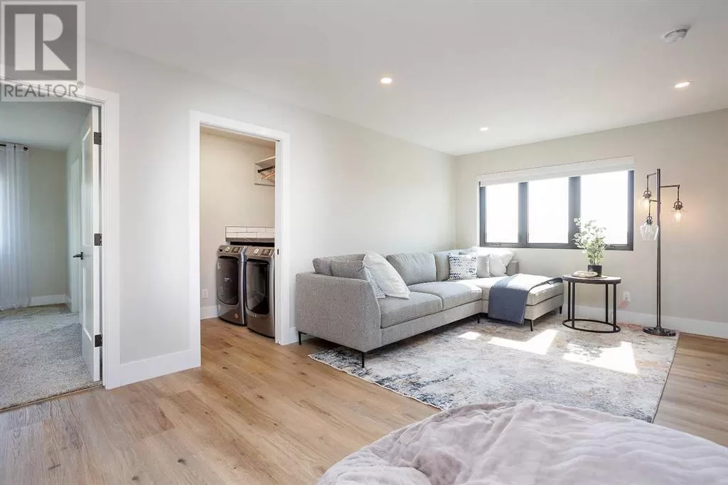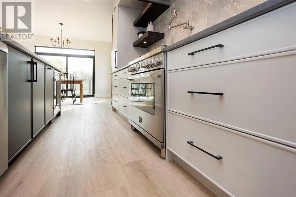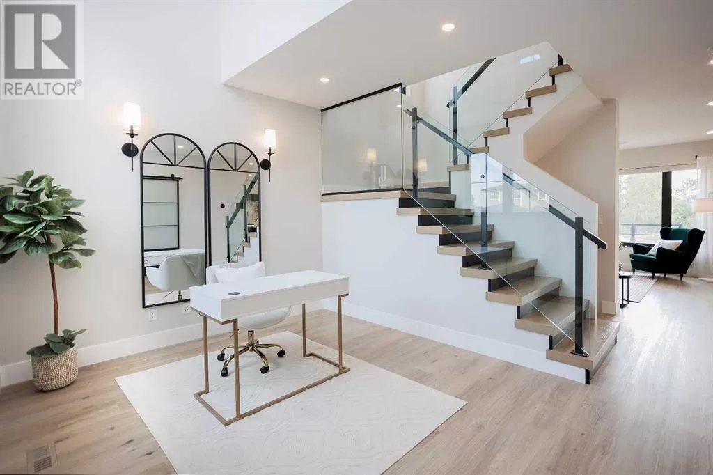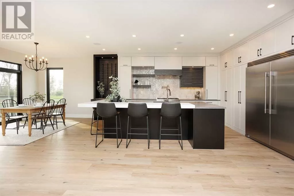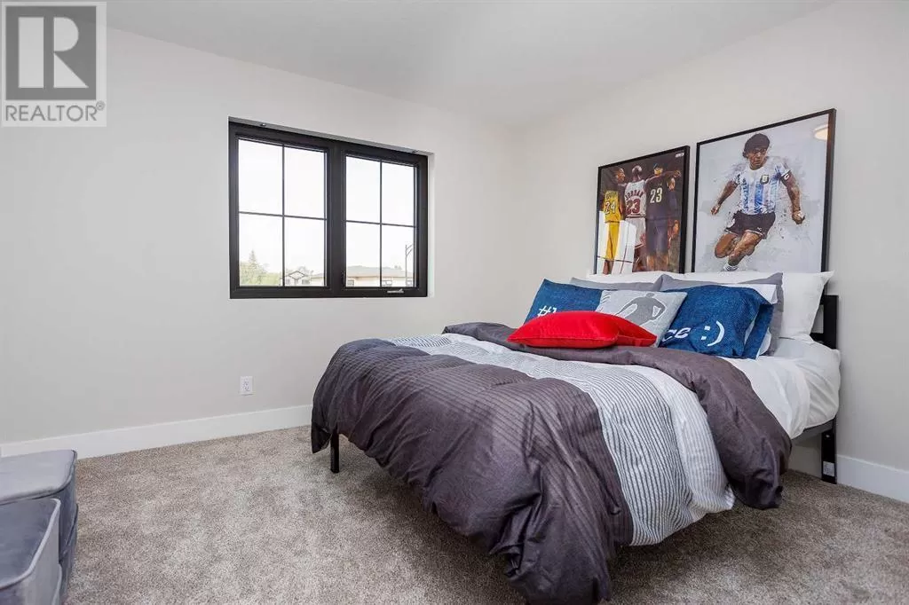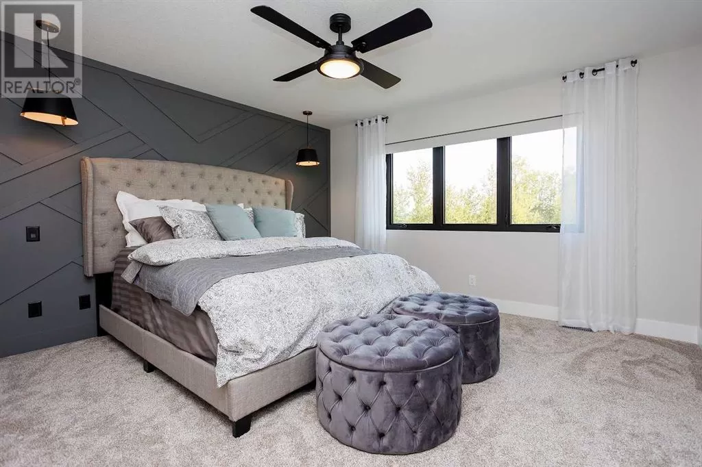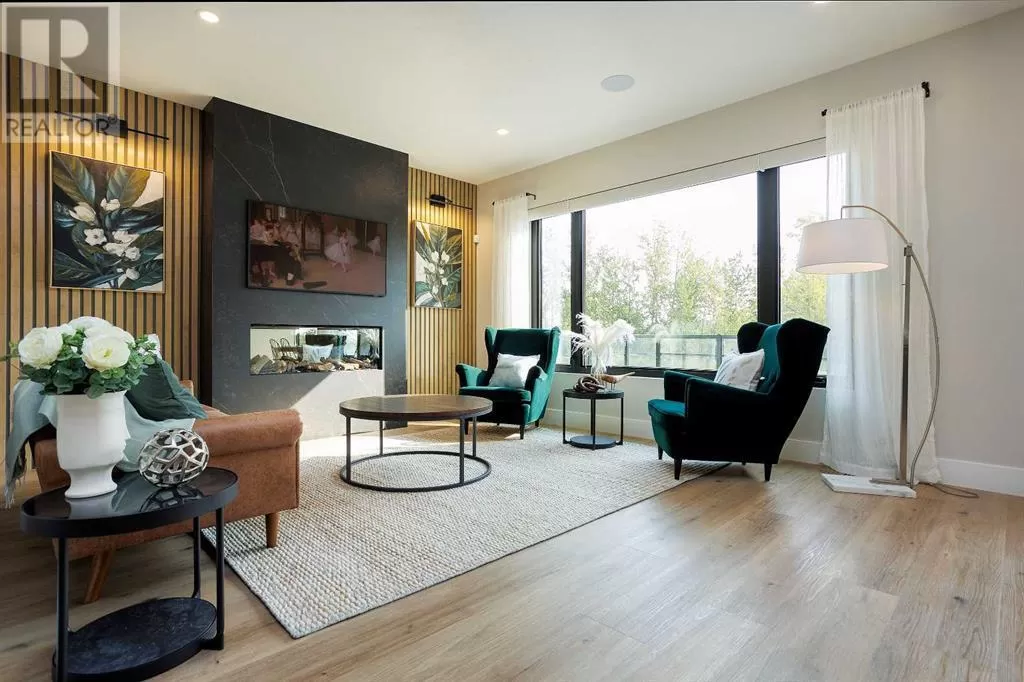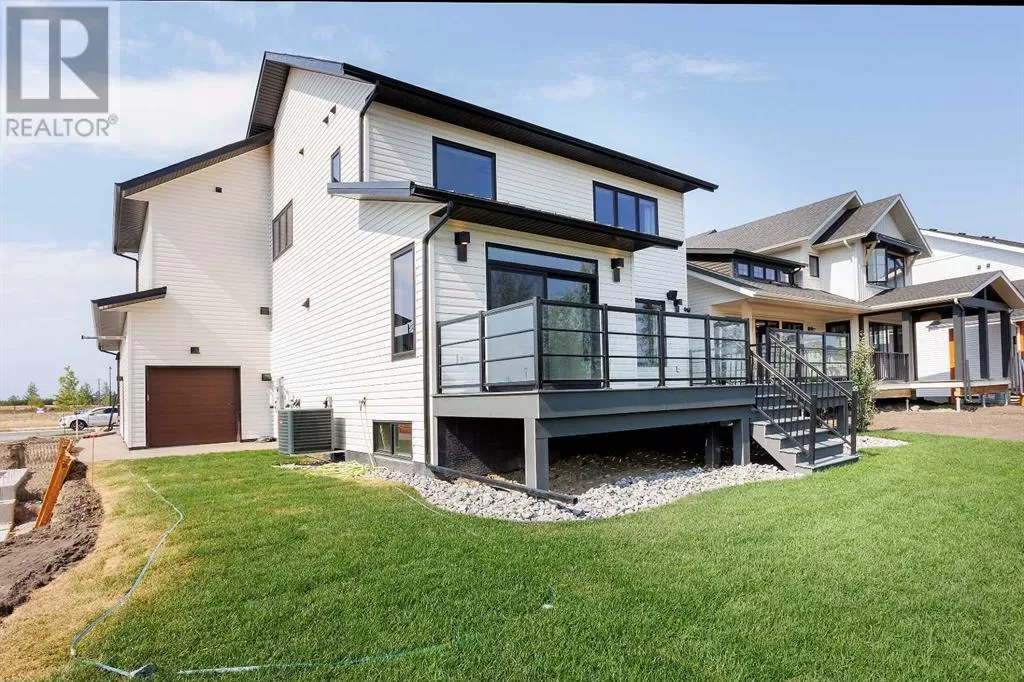 A brand new fully developed Larkaun Homes show home in desirable Evergreen. The curb appeal is accented by the aggregate front driveway & steps, the metal roof accents & vertical board & baton features. The front entryway greets you with towering 18' ceilings in the foyer & main floor office that overlooks the custom staircase with solid wood treads, two tone risers & custom glass guard rails. Ceiling height, soft close kitchen cabinets are accented by a massive island with an eating bar, full chevron tile backsplash, a Franke peak undermount granite bowl sink, a built in fridge/freezer combo, a gas stove with a pot filler, wine storage, a pantry style cabinet with pullouts, a custom wood hood fan & quartz countertops. Walk through the butler's pantry with a prep sink & beverage centre to the back entryway that has mirrored sliding closet doors, a bench seat & built in cabinetry for storage. The powder room has decorative wallpaper, a furniture style vanity accented by a hammered stainless steel under mount sink. The eating area has patio doors to the 14'x8' + 16'x14' composite rear deck. Relax in the living room next to the british fires forest 48" electric fireplace featuring matte black quartz slab surround. Follow the stunning custom staircase up to the bonus room that adjoins to the desk stations with a custom welded wall with glass inserts that overlook the main floor. The king sized primary bedroom has a large window that overlooks the back path & trees, a fan, reading lights on each side of the bed & an oversized walk in custom closet. The gorgeous 5 piece ensuite features heated tiled floors, a 60"x36" curbless walk in tile shower with a built in storage niche, dual heads including a rain head & a sliding hand shower, a freestanding tub below the picture window, double sinks, a makeup counter with an LED mirror, and a water closet with a window. There are two additional bedrooms, a 4 piece bathroom & a laundry room (smart drain under the washing machine) wi th builtins including baskets & a folding counter. The fully finished basement has operational in floor heat with a family room featuring a sports bar (includes a built-in ice maker & beverage centre), a 4th bedroom, an exercise room with full glass wall and a 4 pc bathroom. The fully landscaped yard backs onto a walking path & treed area. The oversized garage has premium flake epoxy floors, a gas heater, floor drains, a smart car plug in & a rear garage shed with backyard access through the 7'x7' overhead door. Features of the home include: Central air conditioning, basement & ensuite has in floor heat, window blinds, luxury vinyl plank flooring, high quality carpet with an 8lb underlay, solar panel ready, Lutron smart home system connects to the power blinds, pot lights and Sonos system, video doorbell and security cameras, Sonos speaker in the kitchen, living room and sun deck, central vac with floor sweeps & more! Evergreen is an HOA and the fees are $100/year at this time. (id:27476)