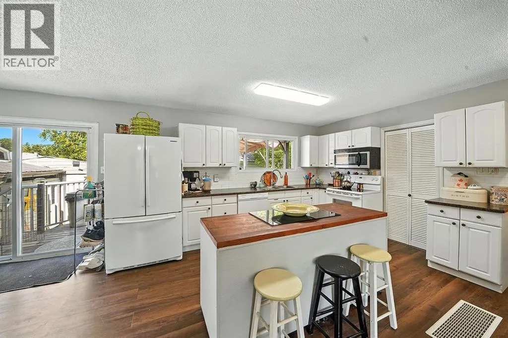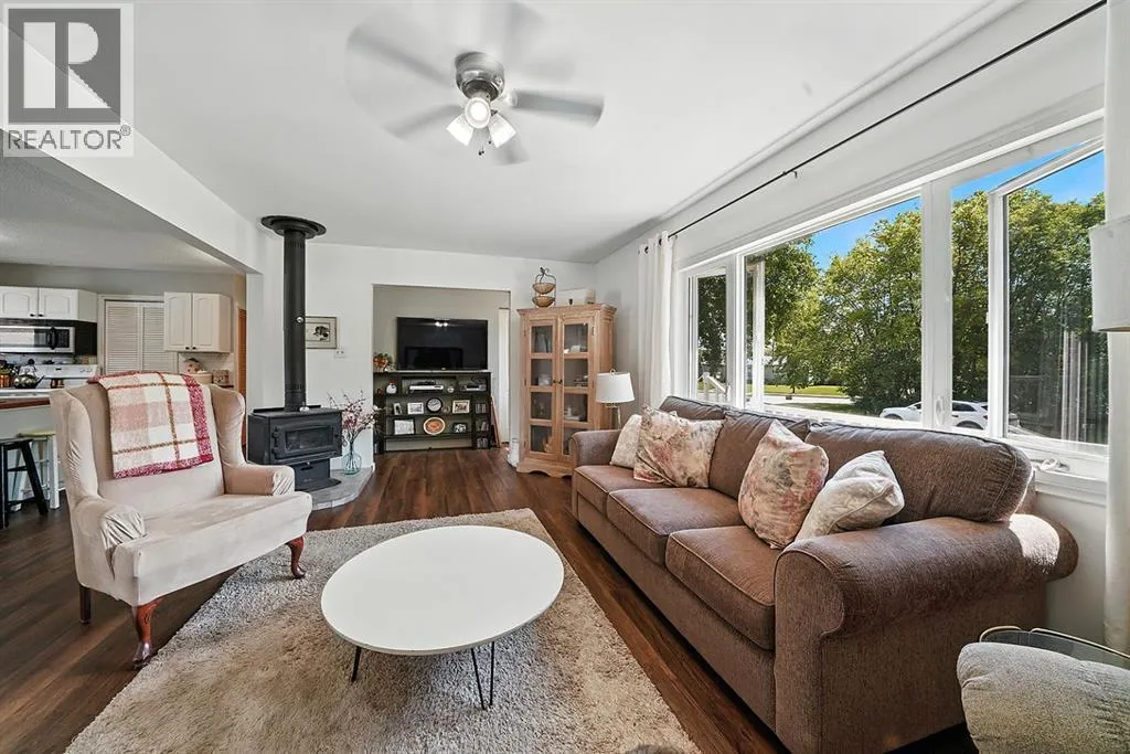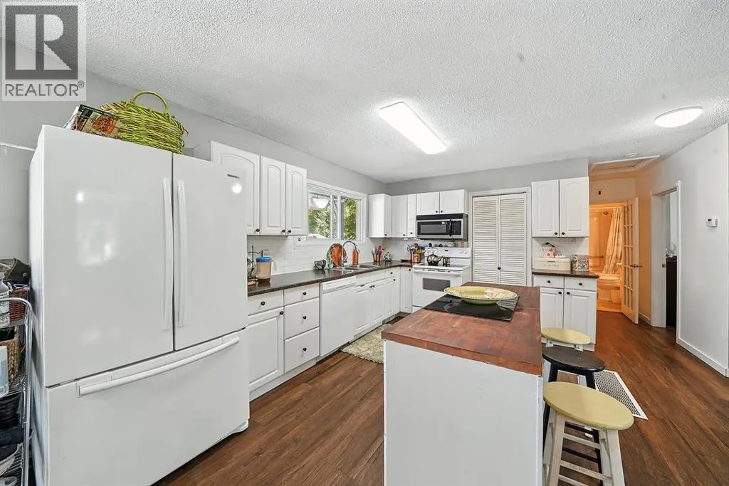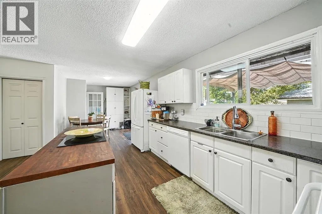 Jam-packed with value! This charming bungalow sits on a mature lot and features a massive double detached garage. Step inside to a spacious open-concept main floor with durable vinyl plank flooring throughout. The large living room offers warmth and character with a cozy wood stove, while the kitchen boasts a center island, ample counter and cupboard space, and a large pantry. Enjoy your meals in the bright eat-in dining area overlooking the beautiful mature gardens. The tranquil primary bedroom and a well-appointed 4-piece bathroom complete the main level.Downstairs features an upgraded bathroom, laundry area, rec space, kitchen, and two additional bedrooms. Notable updates include a high-efficiency furnace, central air conditioning, shingles, and the garage (2018). Ideally situated across from a green space and close to parks, schools, Red Deerâs vibrant downtown, and the stunning walking trails at Bower Ponds. (id:27476)