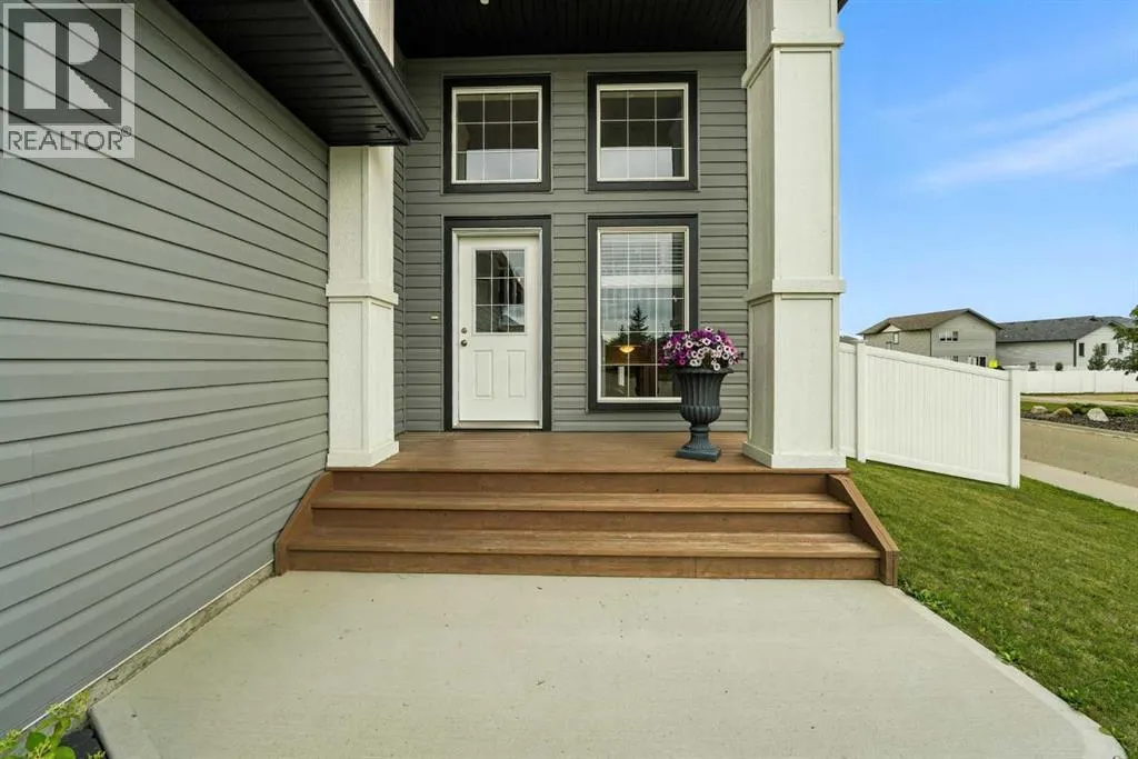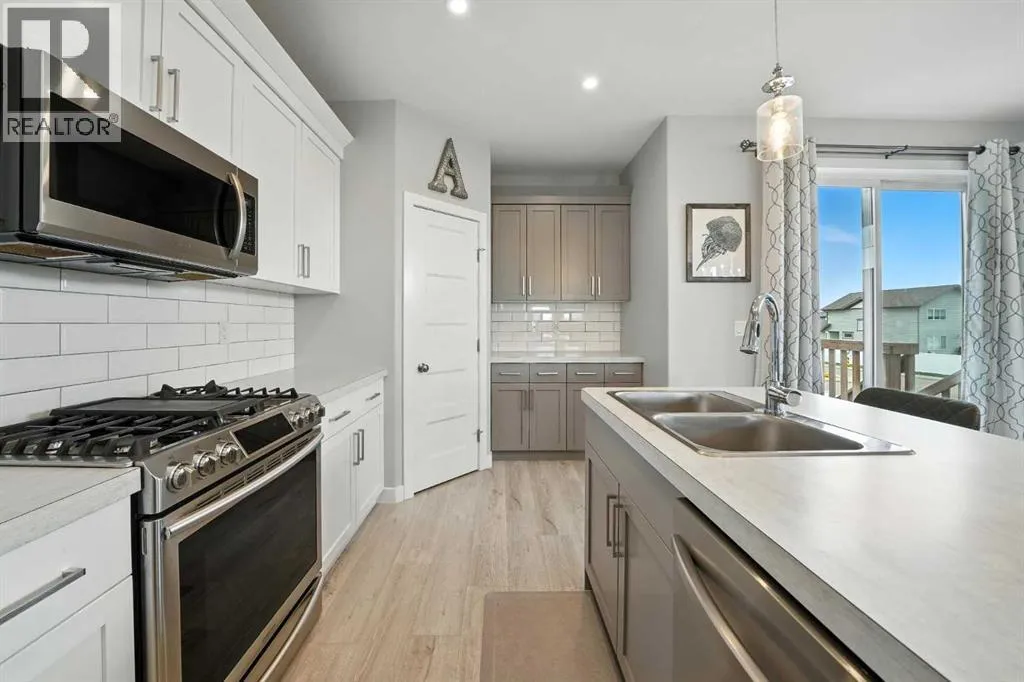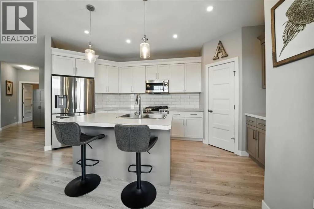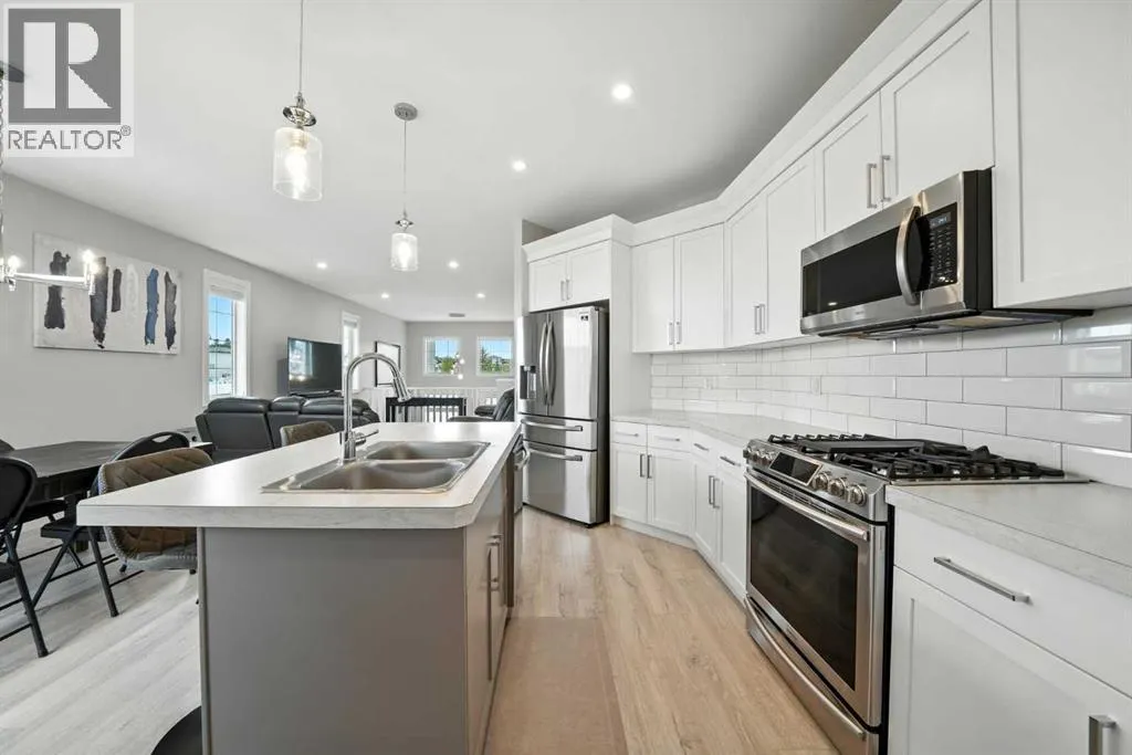 A fully developed walkout on a close! The curb appeal is accented by the front attached garage and covered front veranda. The front entryway greets you with natural light that floods in through multiple windows with a view of the trees and park. The living room has double windows, pot lights on a dimmer switch, laminate flooring and the same view as the front entryway, of the trees & park. White kitchen cabinets are complemented by upgraded stainless steel appliances including an ice maker and a gas stove, crown moldings, full tile decorative backsplash, a grey island with an eating bar and a corner pantry. The eating area has a patio door out to the upper level back deck with a gas line for your bbq. The primary bedroom features a walk in closet and a 4 piece ensuite with a window. There are two additional bedrooms on the main floor and a 4 piece bathroom. The basement was professionally developed by Larkaun Homes in 2024 (except for the one bedroom that was professionally developed in 2021). There is a family room, 2 additional bedrooms (both with dimmer switches) and a 4 piece bathroom with linen storage shelves, a subway tiled tub/shower, all in vinyl plank flooring. The utility room features the washer/dryer and a nice storage space for your convenience. You'll love the walkout from the basement that leads to a large double layer stamped concrete pad that's great for a lounge set and runs under the upper level deck. There is RV parking with the RV gate that matches the vinyl fence (2 gates). A fantastic location across from a park and walking distance to the trail system, school and amenities. The home features AC (2022), a garage de-humidistat & Cat 5/6 in every room. (id:27476)