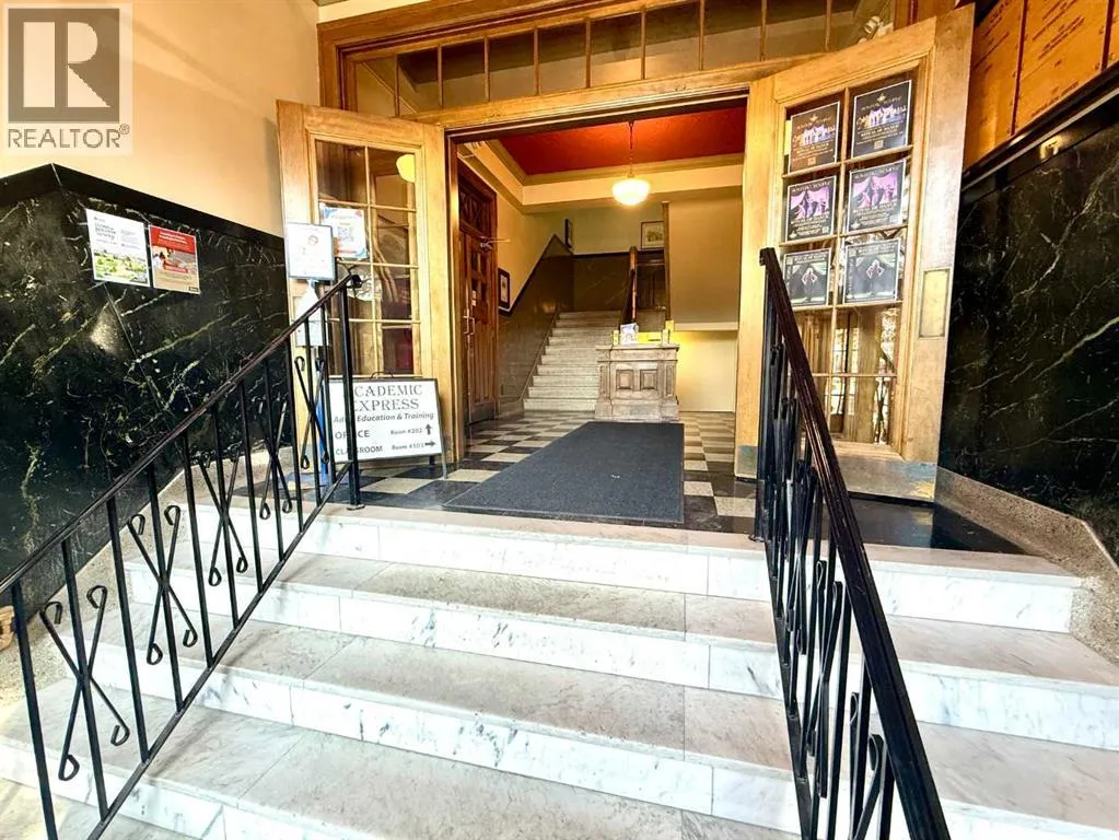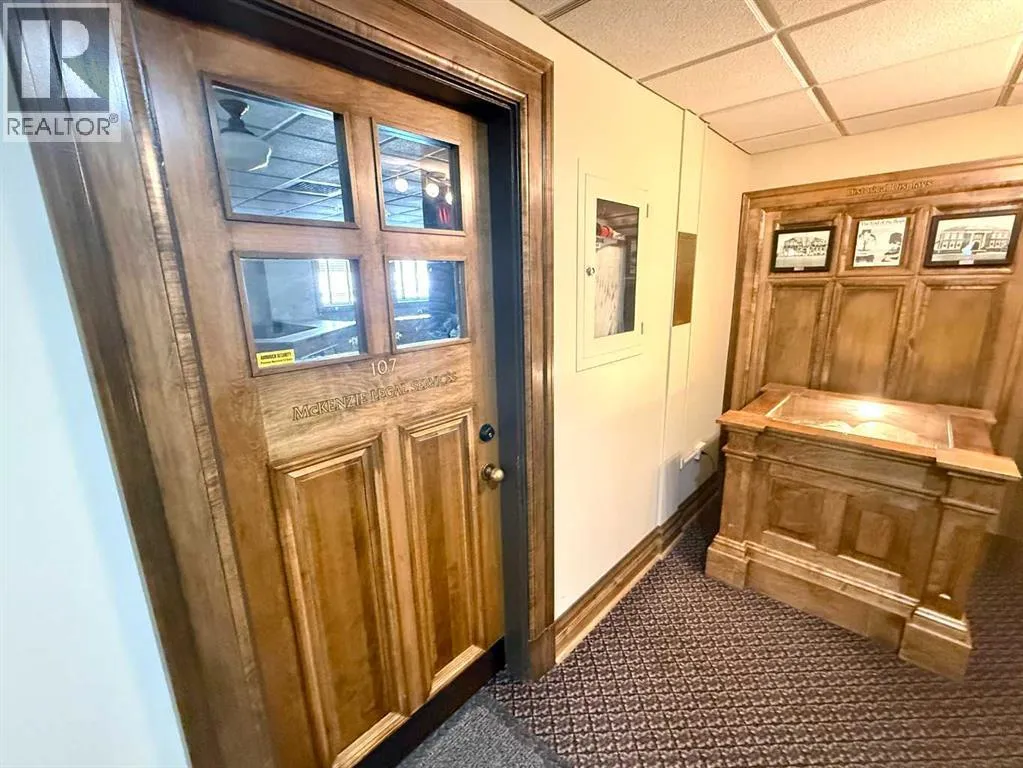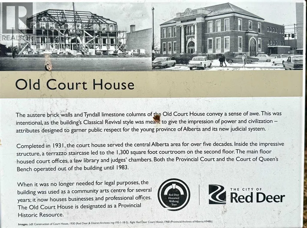 Don't miss this chance on this Unique Ownership Experience in Red Deer's NOSTALGIC ORIGINAL COURTHOUSE.. Built in 1930, dawned with all the ORIGINAL MILLWORK, and HISTORIC MEMORABILIA throughout the Main Floor Lobby ~ Attractive Landscaping all around ~Designated parking space available- High Exposure & Convenient Location on the corner of Ross & Gaetz Ave...The "HEART OF DOWNTOWN RED DEER". Featuring an Open concept professional office work-space, 2-place open reception and sitting area, two offices, file storage area of approximately 117 sq ft , copier/ kitchenette area, boasting 833 SQ FT ,. three common-area bathrooms all configured in historical design and traditional materials in keeping with the style of the building. Brand new boiler heating system, utilities and common area costs ALL INCLUDED! ~ Currently configured, decorated and equipped as a law firm office ~ Original brick walls and hardwood floor ~ Custom Millwork that reflects the original millwork within the building ~ Located one block from the present Red Deer Courthouse. Directly across from the city Hall, park and garden areas with numerous public parking options right out front of the main building. Acquire this previous law practice office space and all the history that goes with it to boot! .All that's missing is a new professional office space tenant. Condo Fees are $900.31 in total condominium fees. Option to lease available as well at $1,950.00/ gross monthly lease (utilities included). see MLS A2261225 (id:27476)
