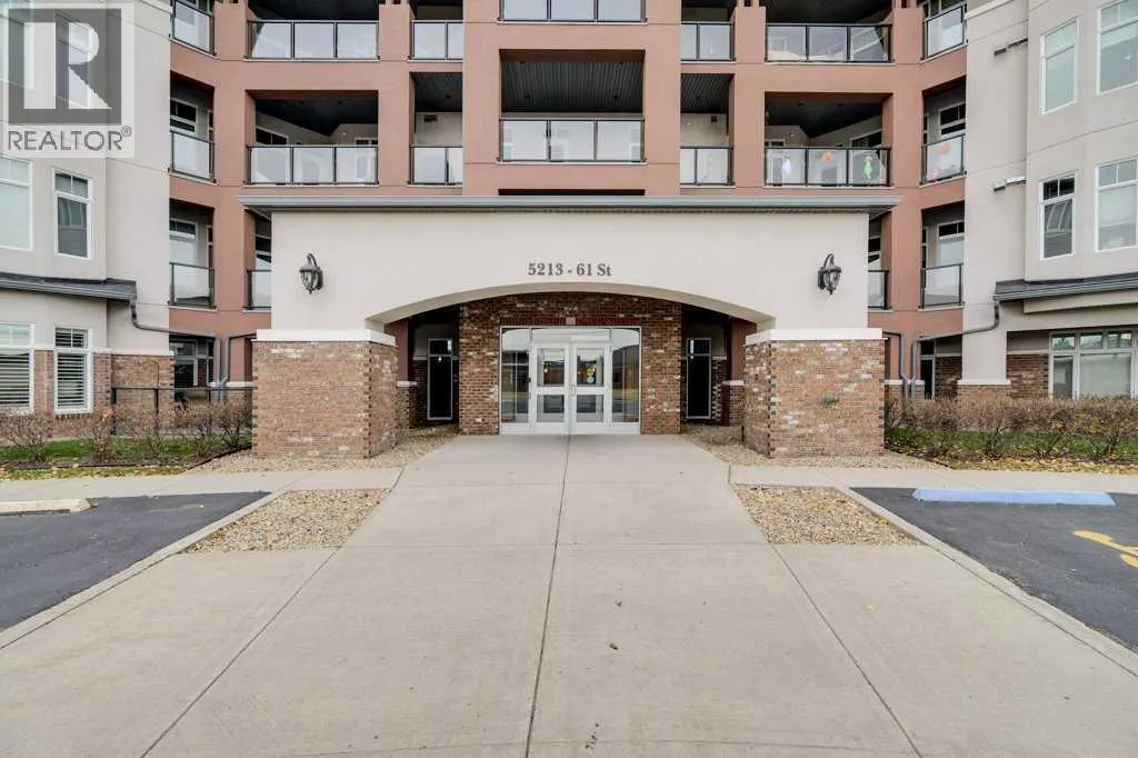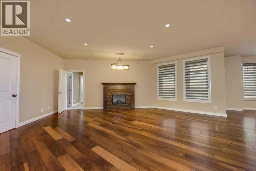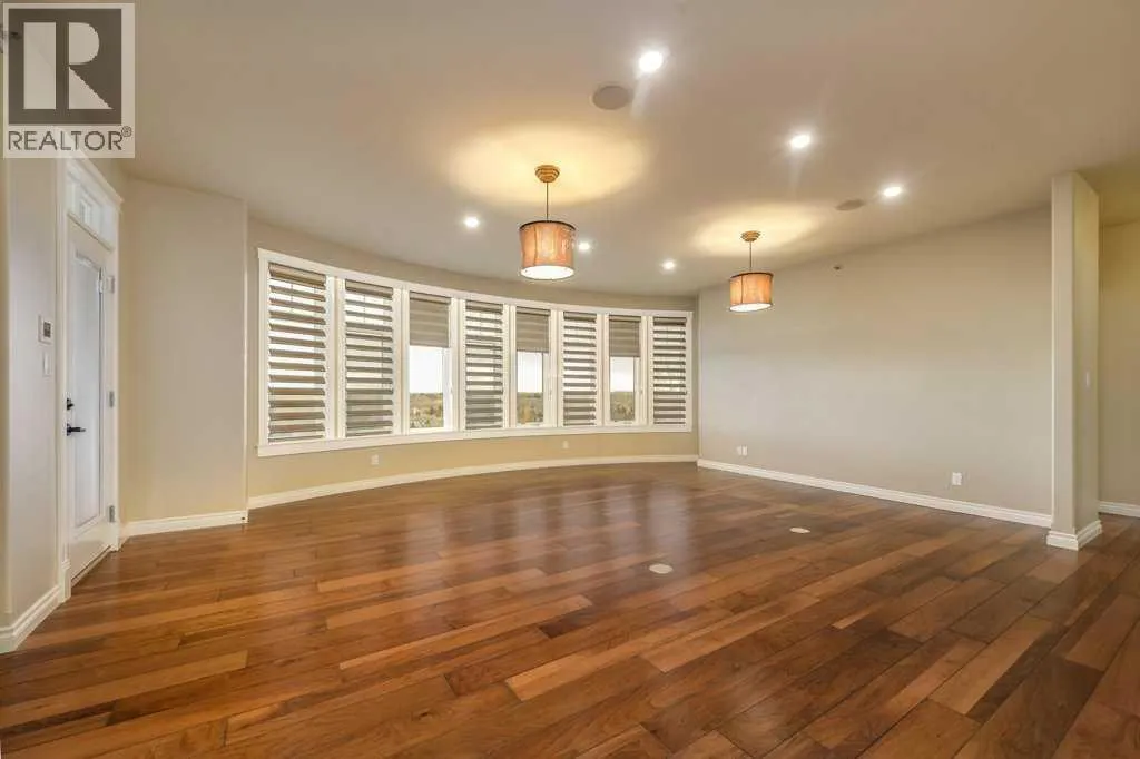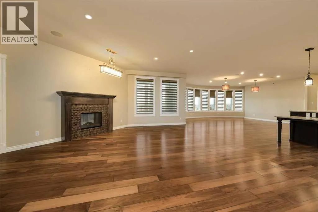 Experience luxurious condo living at its finest in one of Red Deerâs most prestigious buildings. This stunning top-floor unit offers nearly 1,950 sq ft of meticulously maintained living space, proudly presented by the original owners. Upon entering, youâll be captivated by the expansive open-concept layout, featuring a spacious living room, elegant dining area, and a beautifully upgraded kitchenâall enhanced by gleaming hardwood floors. The chef-inspired kitchen boasts a massive island, granite countertops, custom cabinetry, a full tile backsplash, and a convenient corner pantry. The living room is bright and inviting, bathed in natural light from the large south-facing windows, and offers plenty of space for entertaining or relaxing. The primary suite is a true retreat, complete with a two-sided fireplace, walk-in closet, and a luxurious 4-piece ensuite. Youâll also find a second generous bedroom, a separate den with custom built-in desk and cabinetry, and another well-appointed 4-piece bathroom. A spacious laundry room located just off the primary bedroom adds to the homeâs thoughtful design and convenience. Step out onto the large southwest-facing balcony and take in the incredible views, perfect for enjoying morning coffee or evening sunsets. This exceptional unit includes two titled underground parking stalls and access to superb building amenities such as a fitness centre and a multi-use party room. Offering a rare combination of size, style, and location, this immaculate condo truly defines luxury living in Red Deer. (id:27476)