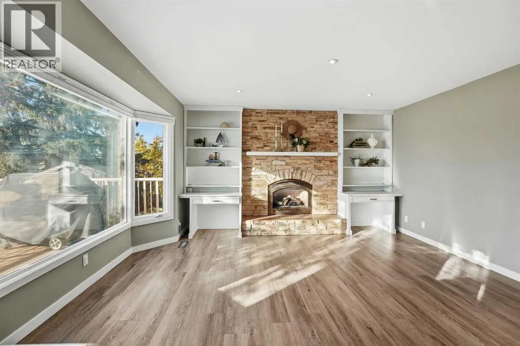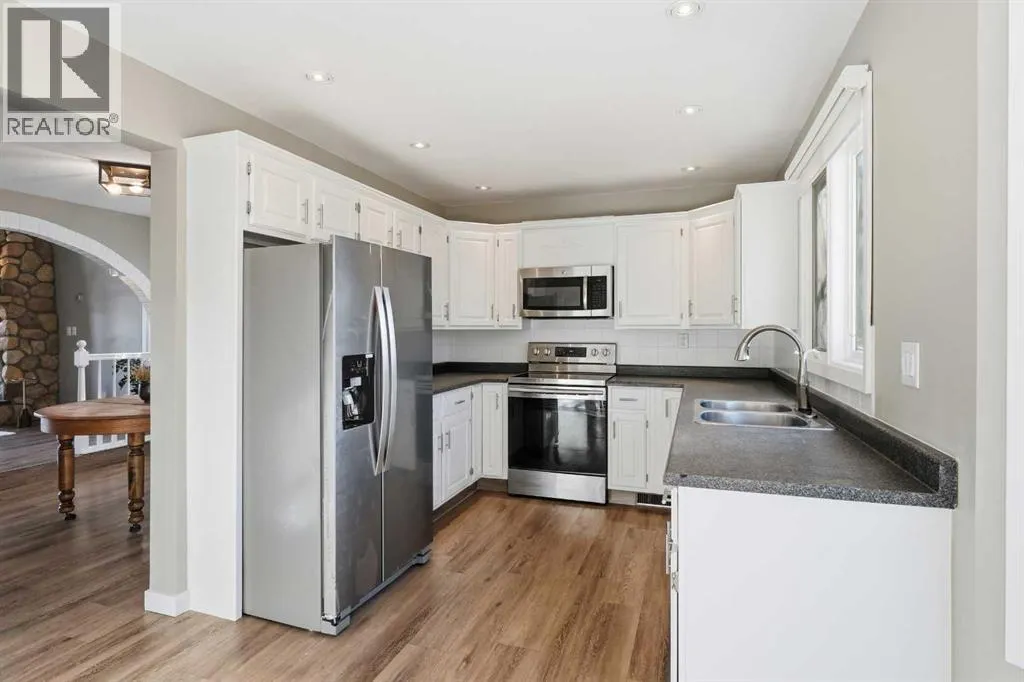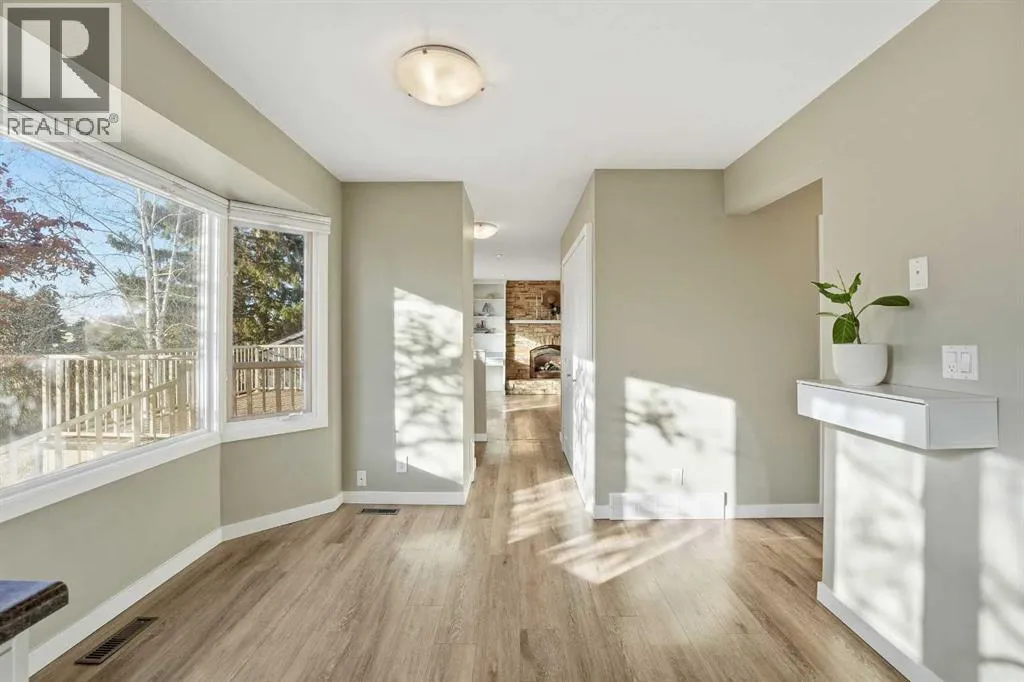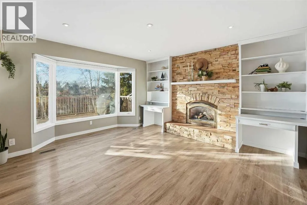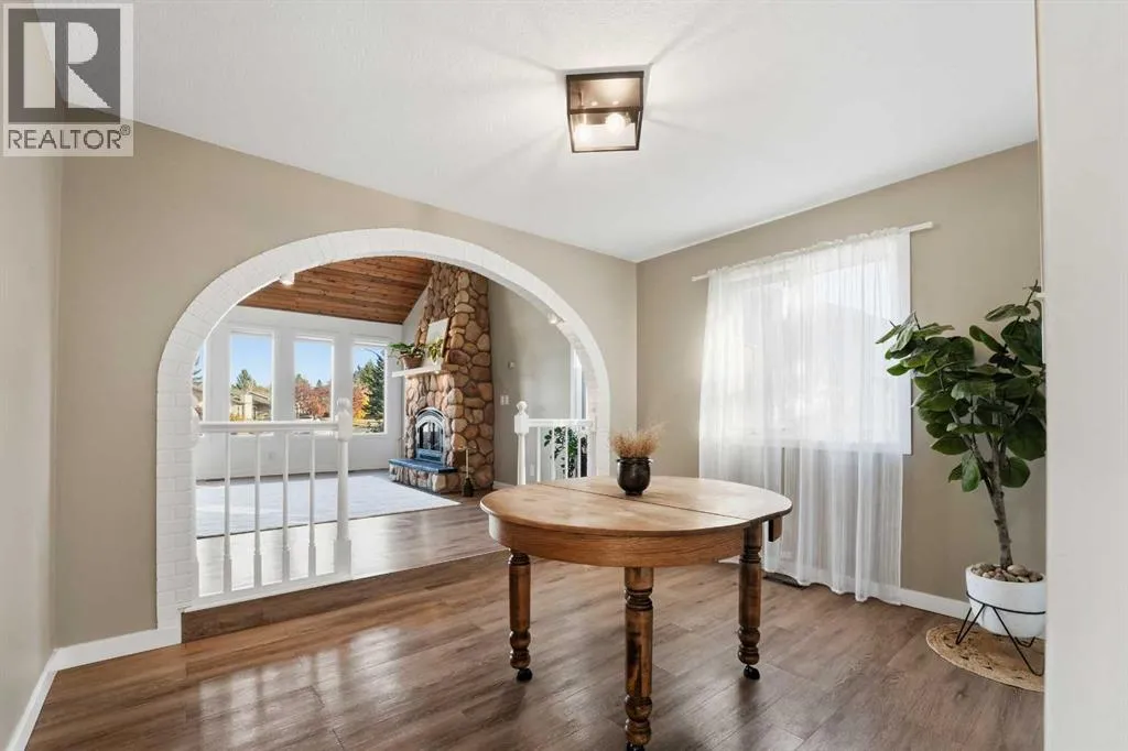 Immaculate Fully Developed 2 Storey with Attached Double Garage on a Quiet Close in desirable Clearview Meadows! Step inside and youâre greeted by the vaulted wood accented ceiling, a floor-to-ceiling stone masonry mantle that surrounds a natural gas-fireplace in the front living room, plus a beautifully updated staircase with white railing & wood paneling accenting the stairs. From the bright east facing living room is access to the formal dining room and kitchen. The kitchen is complete with stainless appliances, tile backsplash, and a breakfast nook. Off of the kitchen you will find the main floor laundry, access to the backyard, and an additional family room with built-in shelves and gas fireplace. The main floor is complete access to front attached double garage and a 2-pc washroom. Upstairs you will find the oversized primary bedroom, complete with double closets, built-in vanity, and 3-pc ensuite. There are 2 additional bedrooms and a 4-pc bathroom that complete the 2nd floor. The basement boasts a large rec room complete with a built-in Murphy Bed, Projector & Screen. There is a 4th bedroom and plenty of storage space in the utility room, plumbing roughed in for a bathroom, and under the stairs. The west facing backyard oasis is fully fenced and landscaped. This pie-shaped lot backs onto a greenspace / park. Enjoy the mature, private backyard from your maintenance free Trex deck with additional stone patio. The yard is complete with are raised garden boxes, fruit trees, shed, playhouse & swing set. Recent Updates: Fridge (2025), Dishwasher (2024), Light Fixtures, Vinyl Plank Flooring, Paint, Baseboards, & NEW Shingles (November 2025) (id:27476)