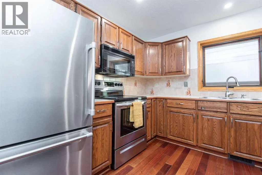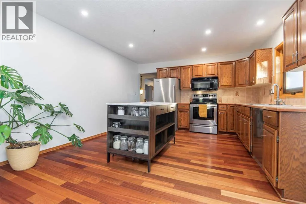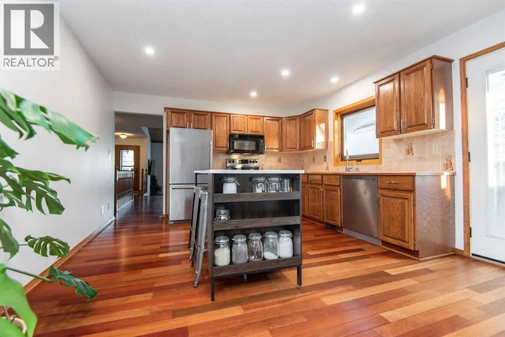 ACROSS FROM THE PARK!If youâve been searching for a mature, quiet location on a large private lot, this is the one youâve been waiting for! Ideally situated across from an expansive park, community hall, playground, ball diamond, and outdoor gym, this home offers both convenience and tranquility. With over 1,570 sq ft on the main level and an inviting, functional floor plan, itâs perfectly suited for entertaining and meeting all your familyâs needs. Enjoy cozy evenings in the sunken family room, highlighted by a beautiful bay window, rich Brazilian hardwood flooring, and a warm cedar sloped ceiling that adds character and charm. The kitchen features updated appliances and convenient outdoor access, while the formal great room just off the kitchen boasts a gas fireplace and garden doors leading to the large private vinyl deck. An ideal space for relaxing or hosting guests. The main floor includes three generous bedrooms and two bathrooms, including a primary suite complete with a walk-in closet, ensuite, and private access to the back deck. The partially developed basement adds even more potential, featuring a modern 3-piece bathroom with a tiled shower, fourth bedroom, and additional space ready for future development. Notable upgrades include composite decking, all main floor Pella windows and doors, including the garage window, and shingles installed in 2015. The garage overhead door has been replaced from the original, and the basement offers Durabuilt vinyl windows along with a renovated rec room and bathroom completed in 2010. Additional improvements include a 2018 hot water tank, an upgraded furnace, and updated electrical wiring and panel. This meticulously maintained home offers comfort, privacy, and an unbeatable location. An opportunity you wonât want to miss! (id:27476)