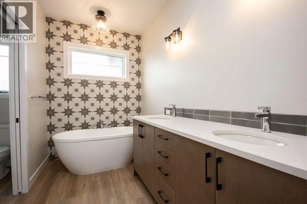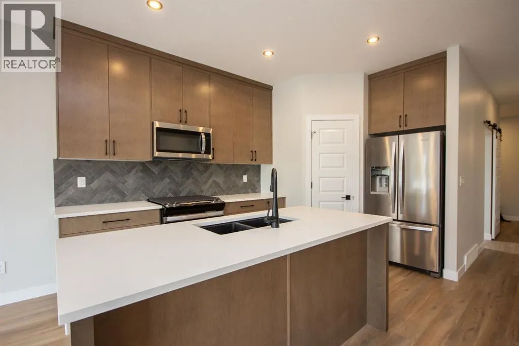 Executive living in one of Red Deer's best communities! The Timbers is a maintenance free community (lawn and snow removal completely looked after!) offering fully fenced and landscaped single family homes with no restrictions on age or pets, so you can bring the dog, the kids, and the grand kids if desired! The Tamarack is a beautiful fully finished bungalow offering a wide open plan with 9' ceilings and large windows that fill the space with natural light. The kitchen features raised two tone cabinetry, quartz counter tops, upgraded stainless steel appliances including an induction range, and a convenient corner pantry. The dining room enjoys views of the yard through sliding patio doors, and you'll love relaxing in the large living room space. The primary suite enjoys a spa like ensuite with a freestanding tub, oversized shower, dual sinks, private water closet, and dual walk in closets. The main floor office provides a place to work or read, and main floor laundry is an added convenience. The basement is fully finished with a massive family room and rec room area with plenty of space for a pool table and home theatre. Two bedrooms share a 4 pce bath and in-floor heat is roughed in for future use. Condo fees of $192.81/mo cover mowing and landscape maintenance, street cleaning, driveway snow shovelling and street clearing in winter, and maintenance of common property and trails. Allowances can be provided for blinds, and a washer and dryer through the builders suppliers to make this a completely move-in ready package. GST is already included in the purchase price, and 1 year builder warranty and 10 year Alberta New Home Warranty are included. Taxes have yet to be assessed. This home has an estimated completion date of February 2026. (id:27476)