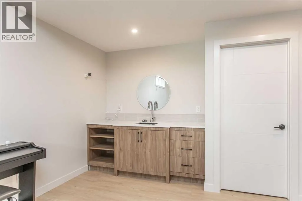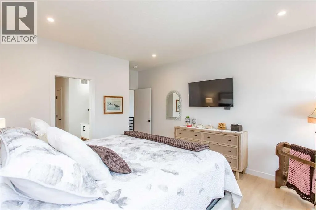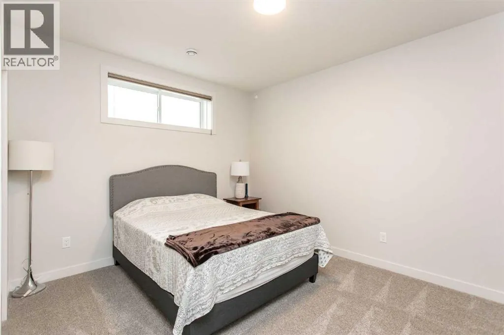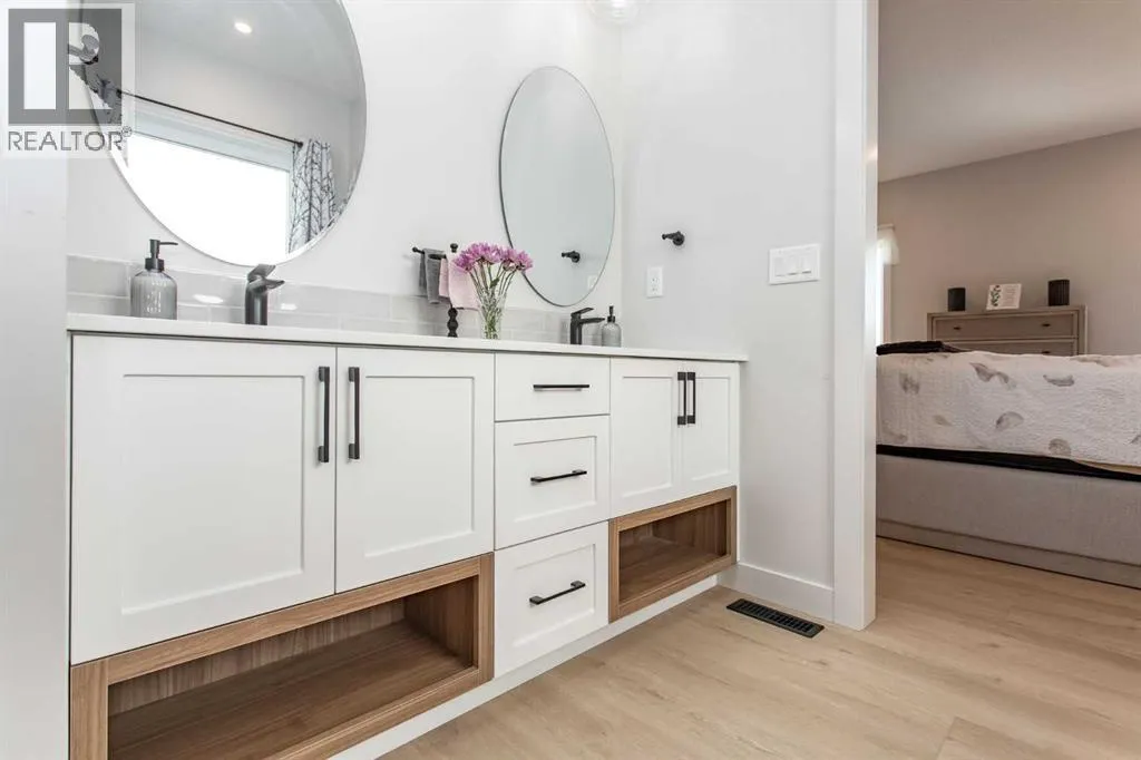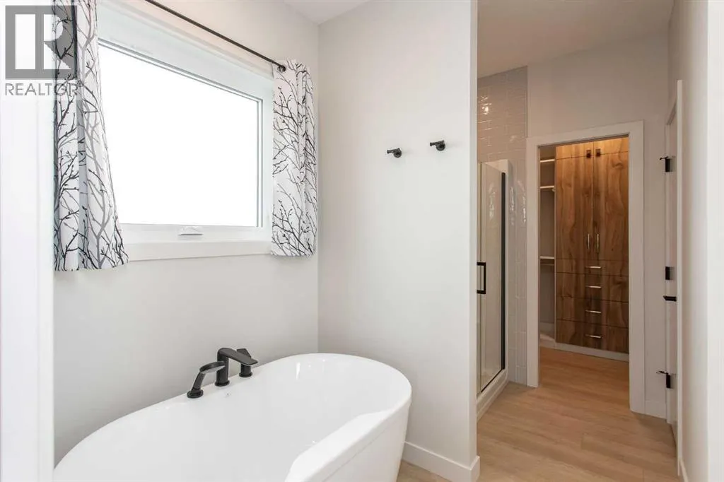 Explore this exquisite and spacious executive bungalow, featuring a three-car garage crafted by True-Line Homes. This residence showcases a unique layout that the builder has designed for the first time. Situated in the picturesque Evergreen neighborhood, this beautiful home presents an expansive open floor plan with soaring 11-foot ceilings and an abundance of south-facing windows, flooding the interior with natural light.As you step through the front door into the generous foyer, you'll immediately notice its convenient dual access with the entrance to the garage. This intelligently designed space includes a large foyer, a spacious closet, and custom shelving.The modern chef's kitchen is a culinary delight, boasting high-end appliances, ample cabinet and countertop space, and an impressive 8.5-foot island. Luxurious finishes include Quartz countertops, a Franke peak undermount granite double bowl sink, and a walk-in pantry with custom shelving for abundant storage. Attention to detail shines through with a custom wood range hood stained to match the island and stylish glass cabinet shelving.On the main floor, there's a versatile den currently utilized as an office, which could easily serve as a fourth bedroom. The spacious primary suite features a five-piece ensuite and a generously sized custom walk-in closet, expertly designed by Canadian Closet. An additional highlight is the expansive laundry room equipped with custom cabinetry and countertops, along with a pass-through window from the walk-in closet. This laundry space houses the LG 6.0 cu. ft. mega capacity Wi-Fi enabled front-load washer with the LG Sidekick mini washer in the pedestal along with a matching 9.0 cu. ft. dryer. Lastly, a two-piece powder room completes the main level.Descend the extra-wide stairs to the cozy family room, equipped with in-floor heating, ideal for movie nights or family game sessions. This level also includes two spacious bedrooms and a full four-piece bathroom, all enjoying the comfort of in-floor heating. The large storage area features durable painted floors, offering potential for an additional bedroom.This home boasts numerous upgrades, including a low-maintenance front verandah and a 10' x 18' back deck, central air conditioning, a water softener system, SunStop Low E argon-filled windows, and a fully finished heated triple garage with an epoxy-coated floor and two dry sumps. Custom Hunter Douglas blinds are fitted throughout, with motorized options in the living room, office, and primary bedroom.The professionally landscaped front and back yards feature stone elements and raised flower beds, enhancing the home's curb appeal. The Evergreen neighborhood offers extensive multi-use trails connecting to Red Deerâs extensive trail system, as well as two ponds with unique bridges and large playground and park facilities. Come and discover the elegance and comfort this remarkable property has to offer! (id:27476)