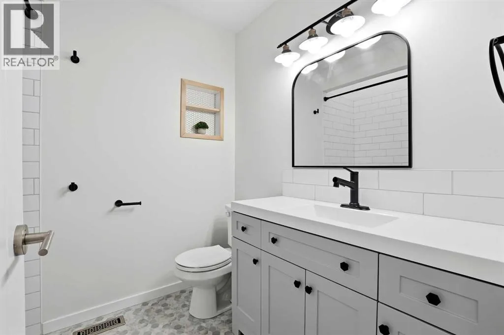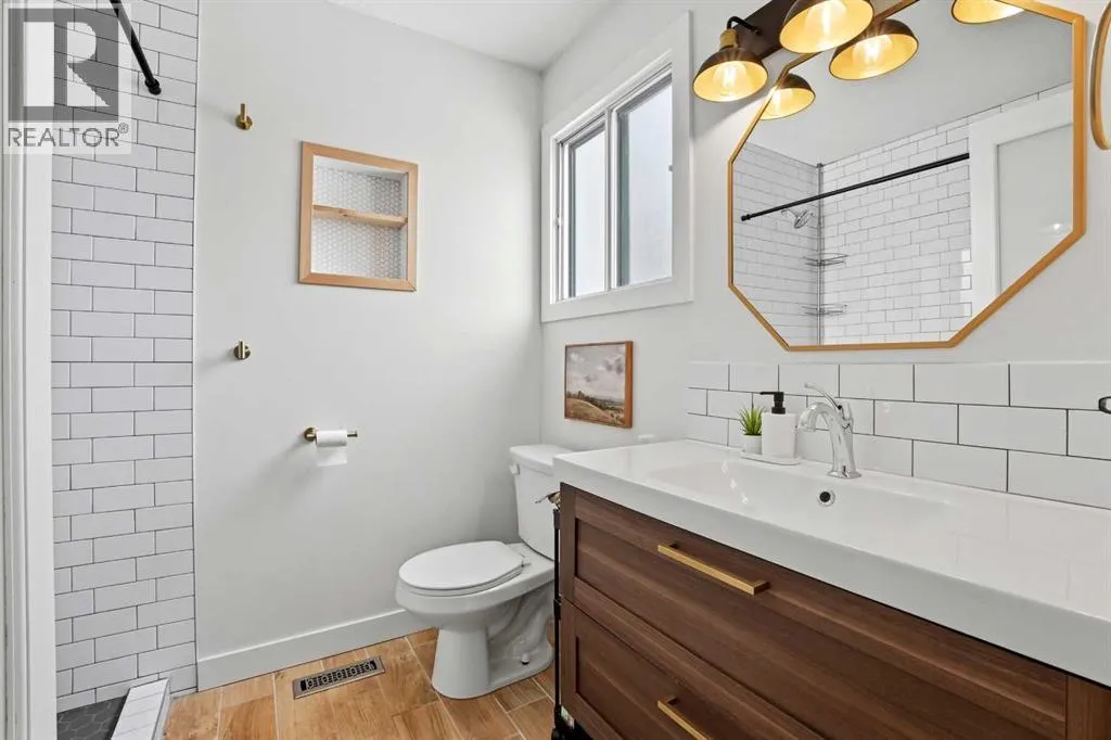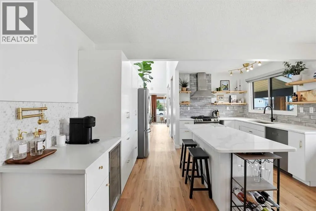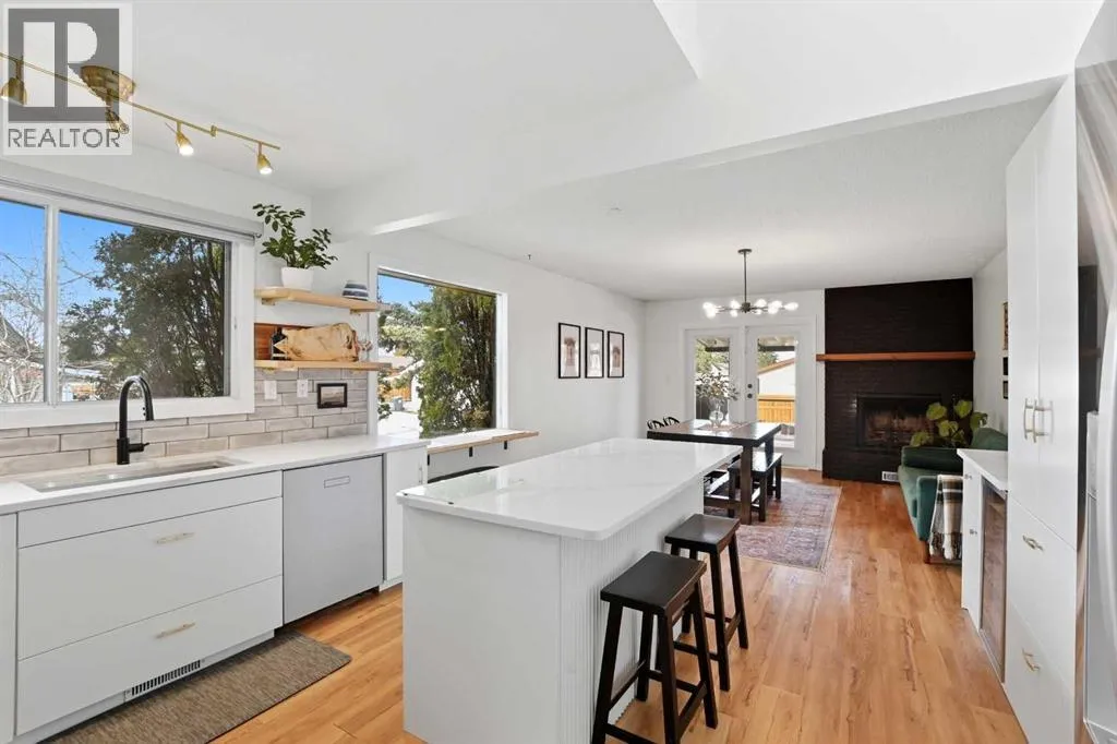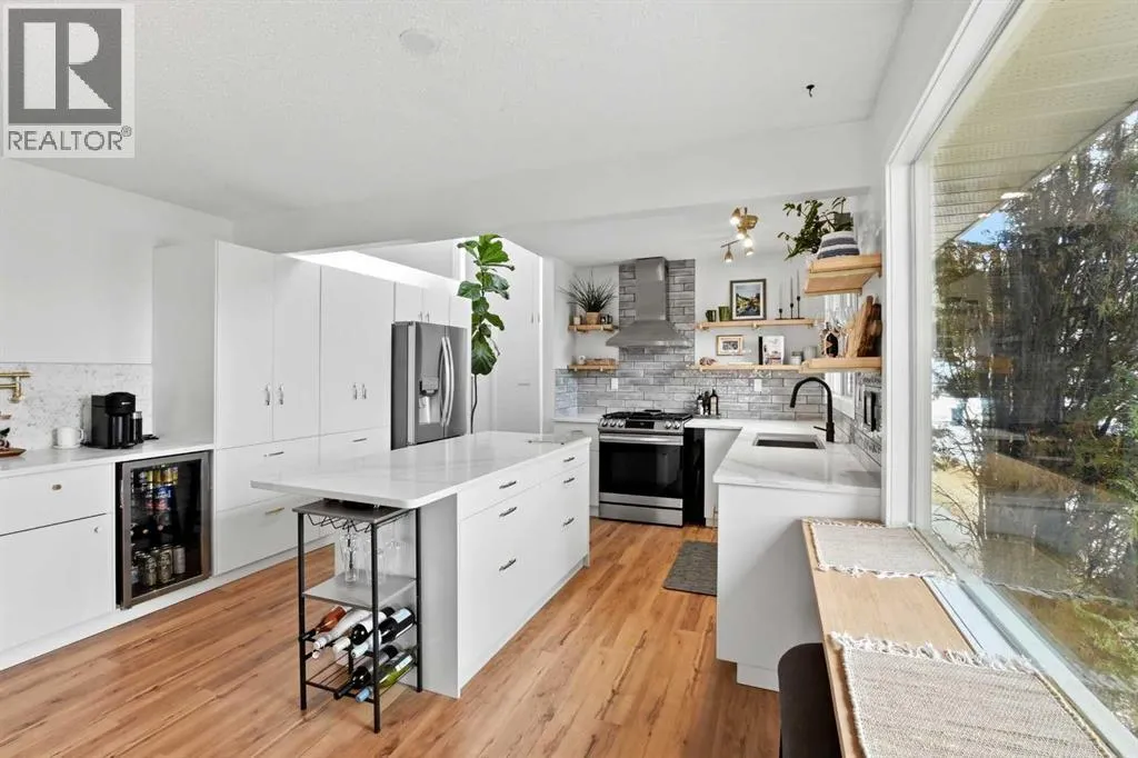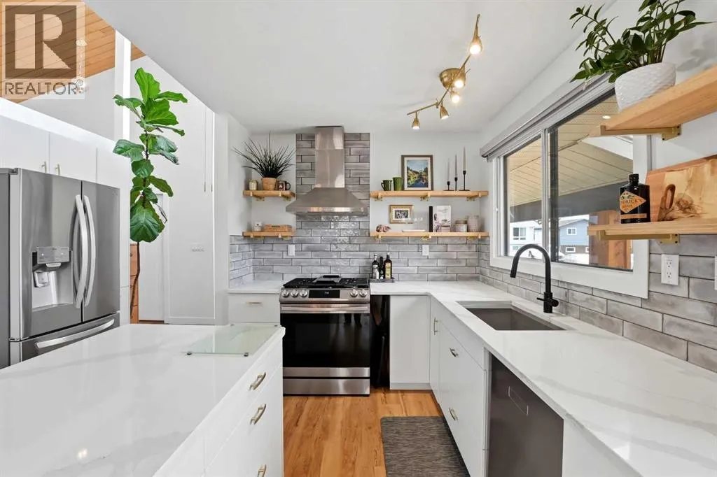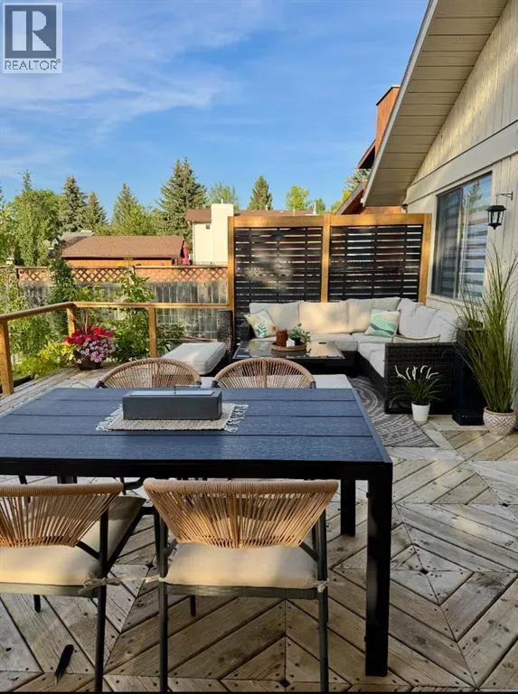 Welcome to 5 Crawford Street situated on a corner lot of a close, this home is a uniquely designed and beautifully renovated bungalow in the desirable community of Clearview Meadows, showcasing stunning mid-century modern styling. Wood-panelled vaulted ceilings and high windows fill the home with natural light and feature convenient automatic blinds. The main floor offers a sunken living room and an updated modern kitchen complete with quartz countertops, stainless steel appliances, gas range, tile backsplash, ample storage, and a centre island with seating. A stylish coffee bar includes a built-in beverage fridge and a dedicated water filler faucet perfect for topping up your favourite brewing machine! Open to the kitchen, the dining room features a cozy wood-burning fireplace and french doors leading to an expansive 2-tiered deck complete with a softtub spa, ideal for entertaining or relaxing outdoors. Vinyl plank flooring runs throughout the main level, past the convenient main floor laundry to the three bedrooms. The spacious king sized primary suite includes a walk-in closet and an updated ensuite with an oversized, low-barrier tile shower. Two nice sized bedrooms and a modern 4 piece bathroom finish off the main area. The lower level offers a large family room, 2 large bedrooms, 3 piece bathroom, plenty of storage space and an office area with built in desk. There is an attached 21â x 23â heated double garage for convenience, air conditioning for comfort, main floor living for accessibility, renovated for style, and a mature neighbourhood â this house has it all. (id:27476)