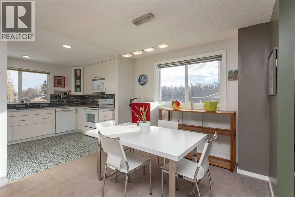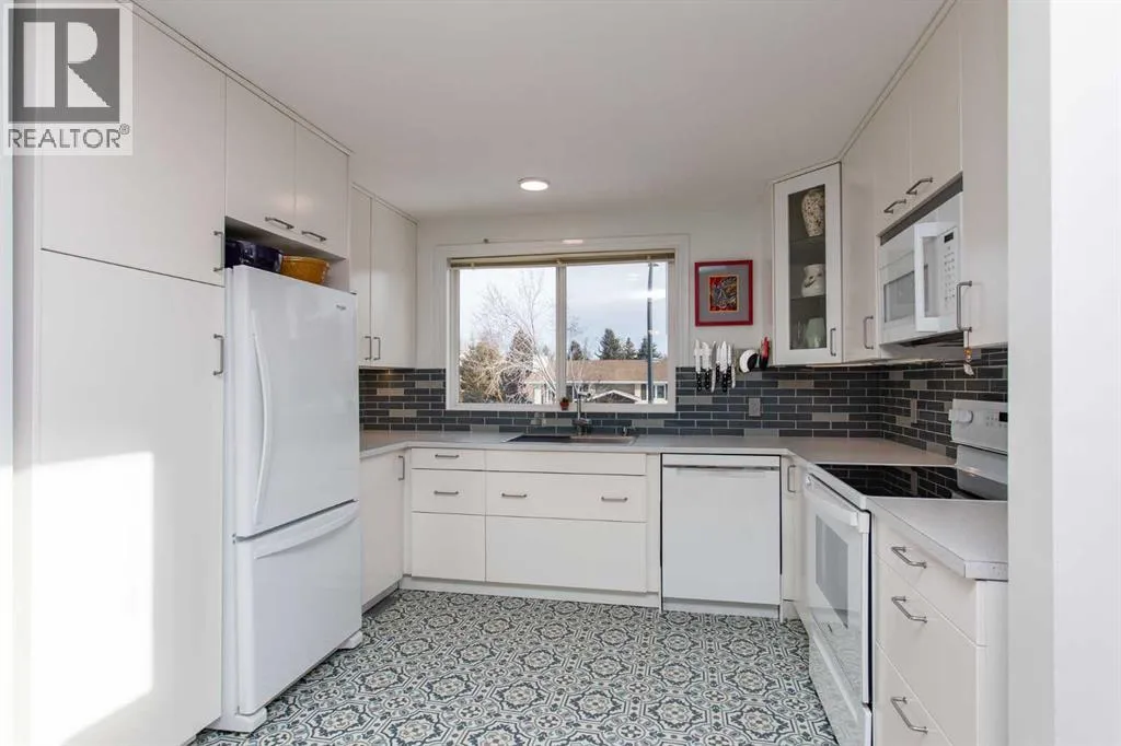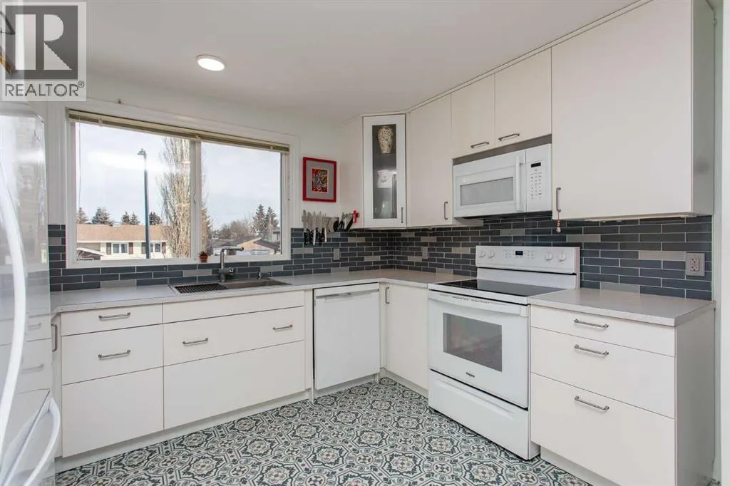 Nestled among mature trees and scenic walking paths this inviting townhouse blends modern updates with a peaceful natural back drop. A thoughtfully renovated interior featuring stylish finishes, a bright and open layout, and a warm welcoming atmosphere. Not your average townhouse, this one is perfect for the discerning buyer seeking a home that reflects their unique personality and style. The fully renovated kitchen is a true show case offering all new cabinets with sliding pull outs, new counters, stunning decorative tile back splash which compliments the new flooring, plenty of storage drawers, deep stainless steel sink with new faucet, and all upgraded matching white appliances. A sun filled dining area is a pleasure to host family luncheons or an intimate evening dinner. The open living area is nicely blended to not only offer a media space ideal for streaming your favorite series but also a nice conversation section perfect for a social coffee or curling up with your favorite novel. The back addition is tremendous for someone wanting an art studio with plenty of natural light or for remote worker needing an office at home. Adorable two piece bathroom with chic wall paper, floating vanity with wide sink basin and playful gold accents. The lower level offers a spacious Primary bedroom which will stay cool and comfortable in the summer. An updated four piece bath with newer tub surround, fixtures and counter top. The flex space can be used as another family room or games area that flows right into the large back bedroom. Head outside to find a large south facing patio area which is also covered from the elements. An amazing and very customized flower garden which has been lovingly detailed and designed by the seller who is happy to share all that is there. A personal she shed which is an ideal retreat where the outside world feels a little quieter. Inside is a mix of calm and creativity plus it is even wired for power. The single detached garage has a brand new m etal door just installed plus there is additional parking along the back. End unit so the added benefit of no additional neighbor plus unit also sides along large green belt so extra space between houses. The ideal location with immediate access to the City Trail System, large shopping center plus numerous other amenities right in the area. (id:27476)