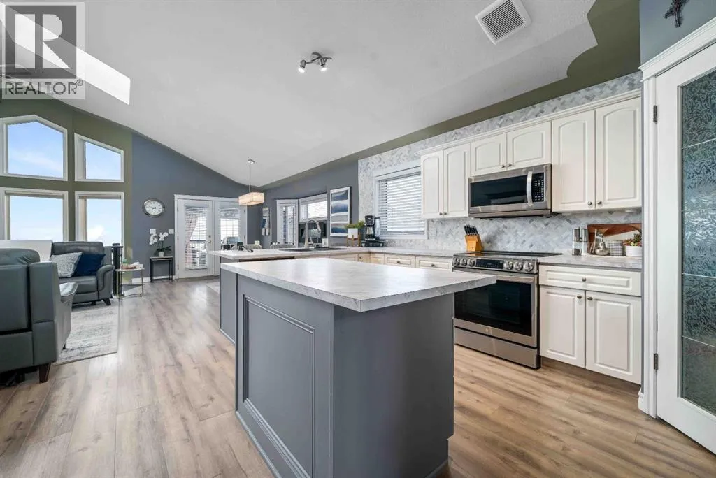 Welcome to 110 Redcliff Way SW, a bright and inviting walkout bungalow just six houses from the edge of the Redcliff Golf & Country Club, and only a one-minute drive to the clubhouse. With vaulted ceilings, skylights, and large windows framing stunning panoramic views of the coulees, this home blends peaceful living with thoughtful functionality. At the front of the home, a flexible room currently used as a butlerâs pantry offers extra prep space, cabinets, and a second fridge â but could also serve as a home office, sitting area, or den. Just off the heated and insulated double garage, you'll find a boot room with closet for storing all your outdoor gear. The main living area opens into a bright, open-concept kitchen/dining/living space. Enjoy crisp white cabinetry, newer laminate countertops, stainless steel appliances, a corner pantry, breakfast bar, and island â perfect for family meals and entertaining. A 2pc guest bathroom is conveniently located just off the kitchen. From the spacious dining area, step out onto your deck with a built-in gazebo, ideal for soaking in the expansive prairie skies and coulee views. Watch summer storms roll in or unwind in the hot tub after a long day. The large backyard includes a sprawling grassed area, paved patio, above ground pool and underground sprinklers for easy lawn maintenance. The primary bedroom retreat features a vaulted ceiling, walk-in closet, plus a 4pc ensuite with a jetted tub, shower, oversized vanity, and large mirror. Downstairs, the fully finished basement boasts 9-foot ceilings, a cozy living area with fireplace, double-door bedroom (currently a music room), two additional large bedrooms, a 4-piece bathroom, and a fifth bedroom currently used as a home gym. A separate laundry room and utility/storage space add even more function. This home checks all the boxes for relaxed living just steps from the golf course, with room for guests, hobbies, and hosting â both indoors and out. 110 Redcliff Way SW â Lifestyle , space, and scenery, all in one. (id:27476)