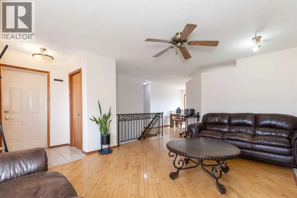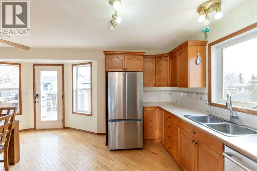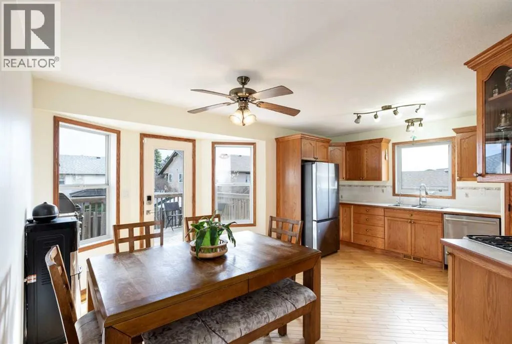 Spacious, bright, and full of characterâthis 5-bedroom, 3-bathroom bungalow in Rimbey, AB is designed for both comfort and family living. The main floor features hardwood floors, a gas fireplace, and large windows that flood the space with natural light. The kitchen is a chefâs dream with a corner pantry, stainless steel appliances including a gas stove, and an open layout flowing into the dining area with easy access to the back deckâperfect for summer BBQs or entertaining friends. The primary bedroom includes a private 4-piece ensuite, while two additional bedrooms share a full bath.Downstairs, a massive recreation room with a wood-burning stove provides a cozy spot for movie nights or game days. Two more bedrooms, another full bath, and a utility room with laundry and storage complete the lower level, offering flexibility for growing families or guests.The property has a spacious attached garage with mezzanine storage, newer hot water tank, newer appliances and the shingles were replaced in 2023. Outside you will find a wonderful yard with landscaped flower bed feature, fire pit area and a doghouse with fenced in dog run for your beloved pets. Located in a friendly neighbourhood with easy access to Hwy 20, this home offers the perfect balance of small-town charm and practical convenience. Rimbey itself is a welcoming community with schools, parks, and local amenities. (id:27476)