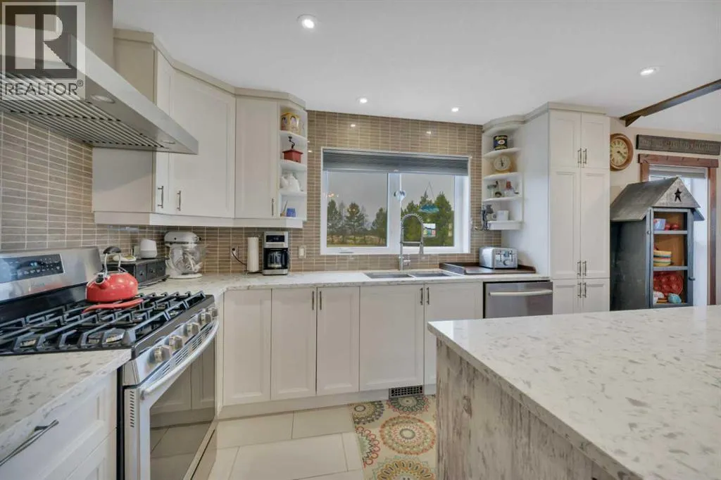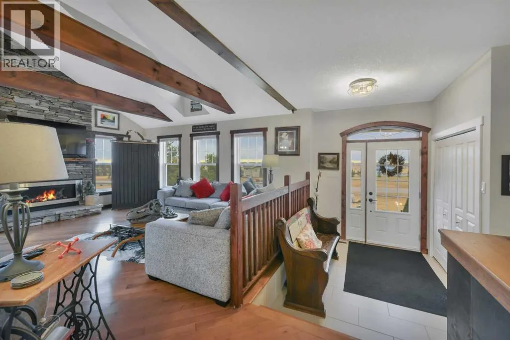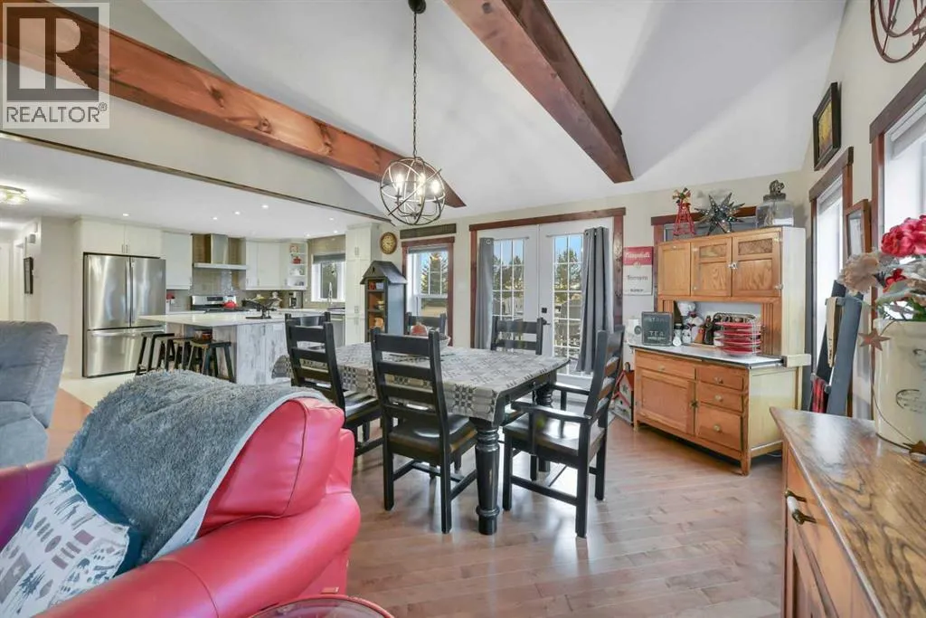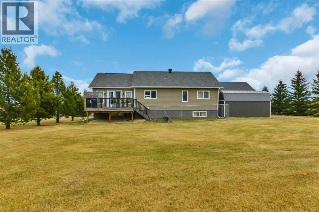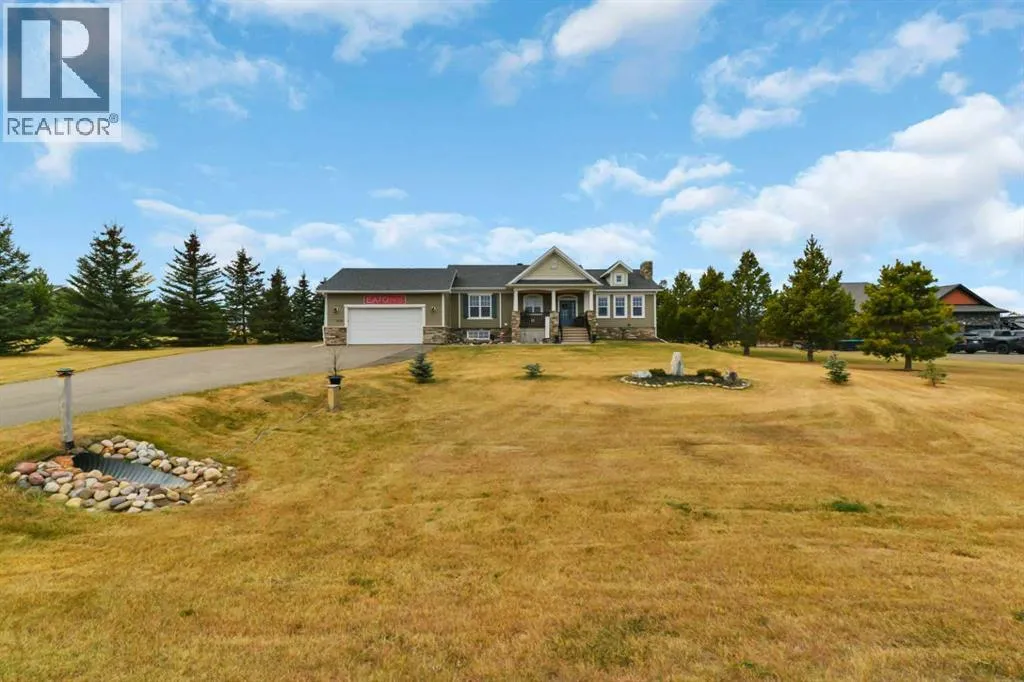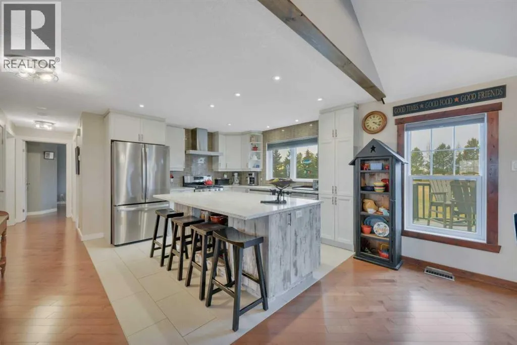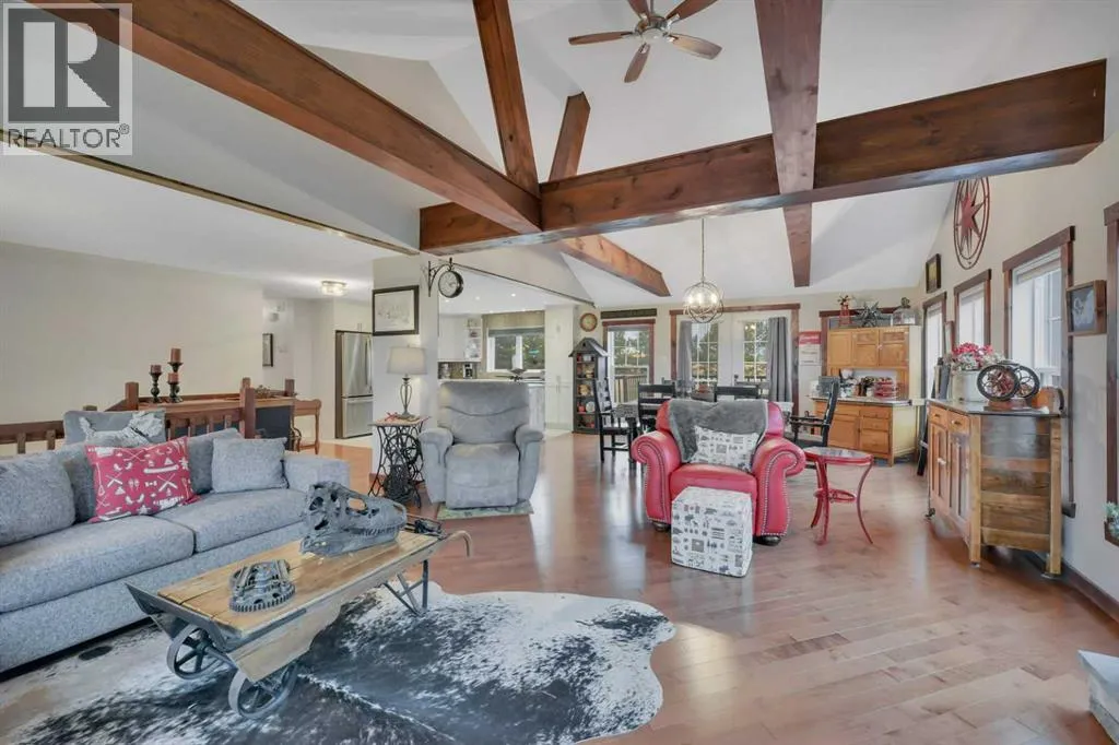Welcome to this stunning 4-bedroom, 3-bath bungalow perfectly set on 0.99 acres of peaceful countryside just minutes from Rimbey. Combining high-end craftsmanship with warm rustic touches, this home is ideal for anyone seeking both comfort and function, with room to build your dream shop on the gravel prepped pad in back.Step inside and youâre greeted by vaulted ceilings with exposed wood beams and a floor to ceiling stone gas fireplace that anchors the bright, open-concept living space. The premium kitchen features Quartz countertops throughout, a large island, full-height cabinetry, stainless steel appliances, gas stove, and a spacious dining area that opens to the beautiful red cedar deck, perfect for entertaining or enjoying tranquil prairie sunsets.The main level includes two large bedrooms, highlighted by a primary suite with walk-in closet and spa inspired ensuite, featuring a frameless glass and tile shower. A second full bathroom also boasts custom tile finishes and a relaxing soaker tub.Downstairs, discover a fully developed lower level with in-floor heating, a generous family room, second full kitchen, two additional bedrooms, a full bath, and laundry, perfect for extended family, guests. Additional highlights include: Hydronic forced air system plus in-floor heating for year round comfort, Air conditioning and heated attached garage, Gravel base ready for shop or RV parking, Country setting with town amenities minutes awaySurrounded by trees and open skies, this property blends modern luxury with rural charm, offering exceptional value and versatility on nearly an acre of land. RImbey is a prime location for those wanting a more rural lifestyle with the amenities of city life, one of the only small towns with Hospital. (id:27476)