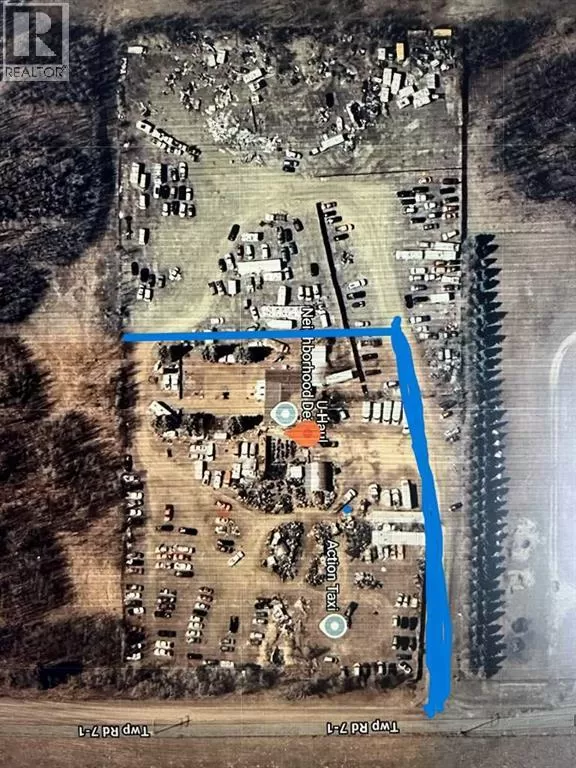Industrial Land in Rocky Mountain House on the historical drive-in move theatre location. The business has been operating for 30+ years as an auto-wrecker, towing & taxi business. There is 7 acres of industrial land on 2 separate titles. The current building is set-up as an office and a retail space; the quonset on location is unfinished and is 30X32 with a 16 ft high door (both hold little value). One parcel is 3.01 acres and is the east half-front with the buildings. The west side is 3.98 bare acres. This property is not zoned for residential use. It is for business use only, with Town approval only. There will need to be a clean-up and there has not been any environmental studies completed to date. (id:27476)