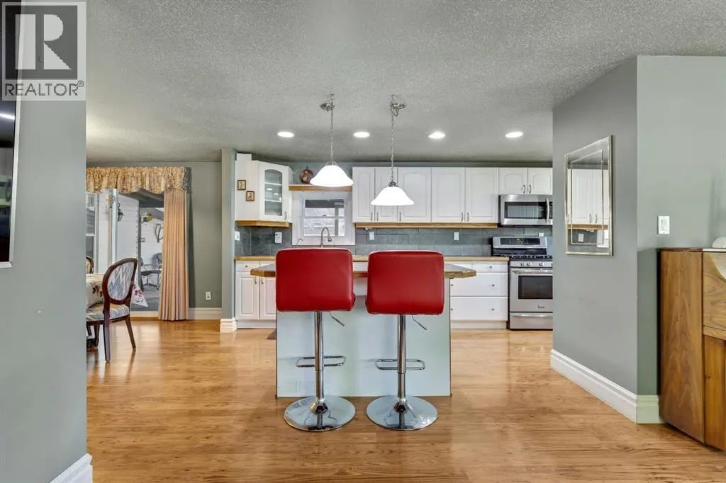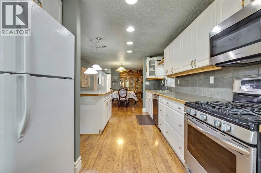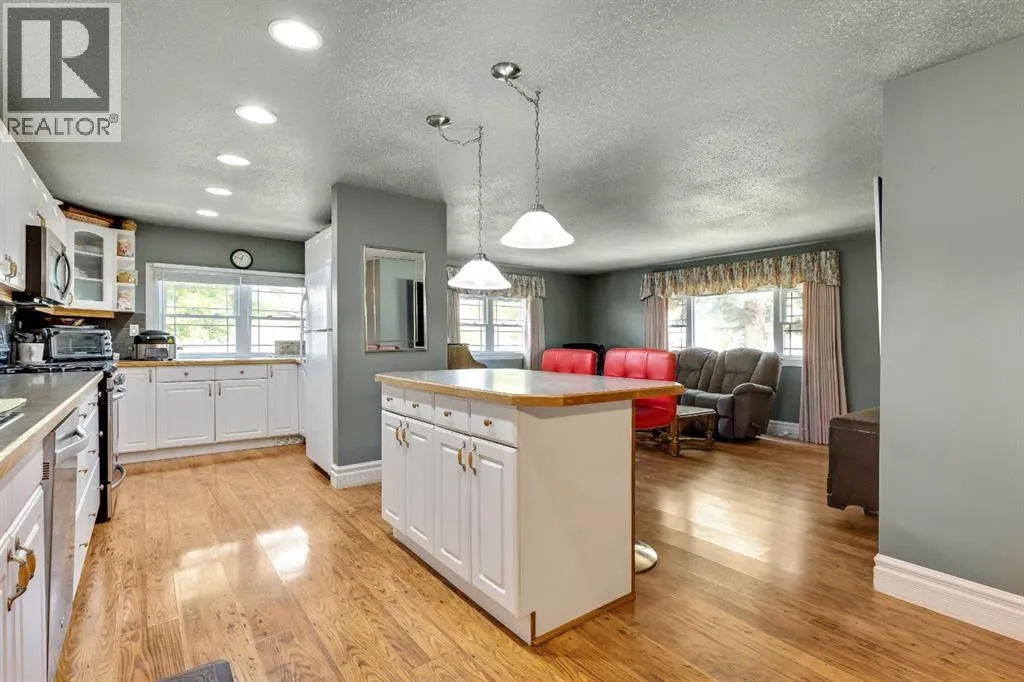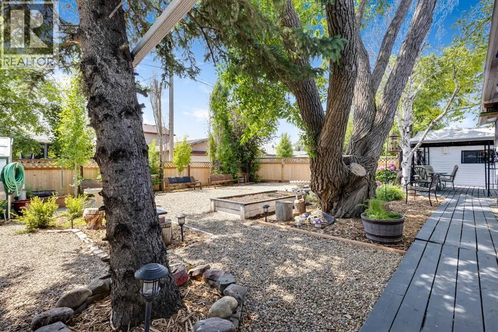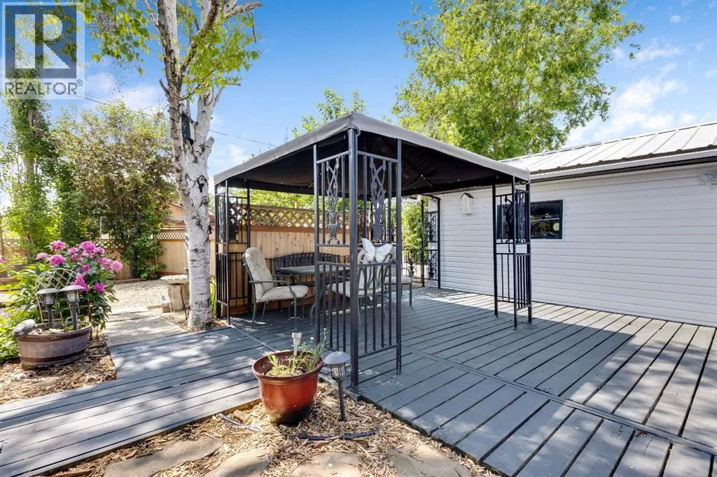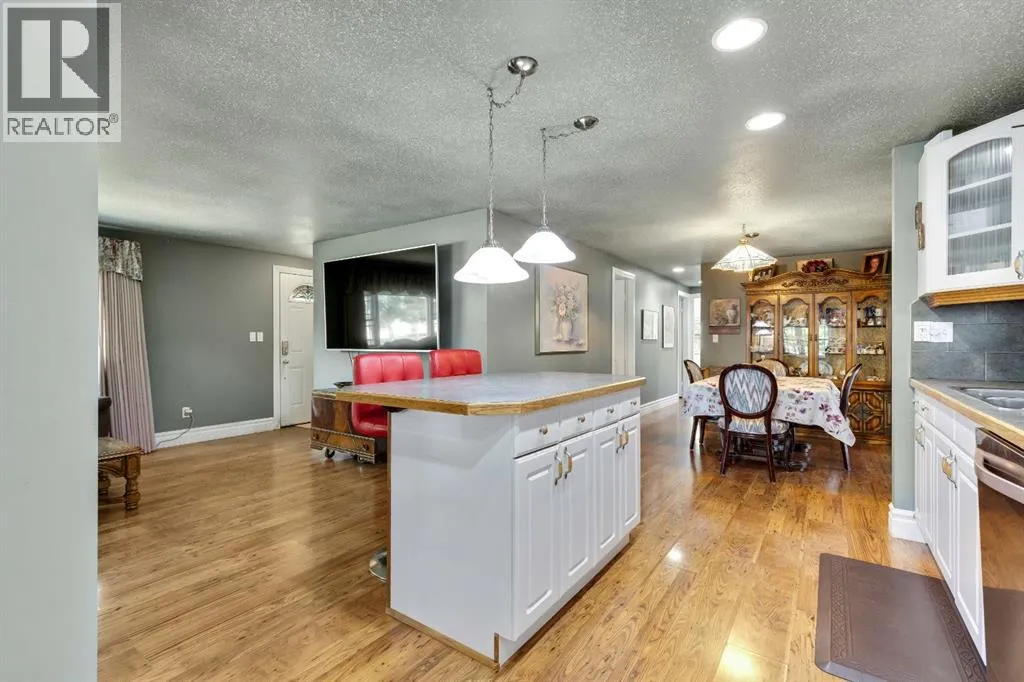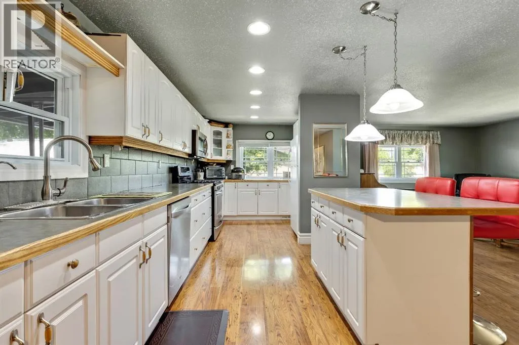 Welcome to your new home in the heart of Rockyford! This updated 3-bedroom, 2-bathroom residence offers comfort, style, and space â perfect for families or anyone seeking small-town charm with modern amenities. The 3 spacious bedrooms are perfect for families with 2 updated bathrooms, the ensuite includes a walk-in shower/tub. The renovated galley kitchen provides tonâs of cupboards and an island to enjoy with a great sized dining room to have everyone over for family dinners. The living room has a gas stove to keep you cozy in the winter months. The laundry room is a great size and includes a den area, off this is a storage/pantry area. The property has newer siding ,upgraded windows (they open both ways!), electrical panel, hot water tank and a new durable metal roof(2023) for worry-free living. Donât worry about the heat in the summer months as this home has CENTRAL AIR. NEW FURNACE INSTALLED SEPT 2025The Oversized single garage with attached workshop/storage area is perfect to tinker in. The front driveway boasts tonâs of parking and has been conveniently repaved. The back parking also fits 2-3 vehicles, RV Parking allow you to store all your toys on your own property.Step out onto the covered deck and outside to your private backyard oasis, complete with mature trees, blooming flowers, a tranquil pond, and a brand-new fence. Whether you're hosting summer BBQs or enjoying a quiet morning coffee this property has it all. Call your favourite Realtor today to book your private viewing. (id:27476)