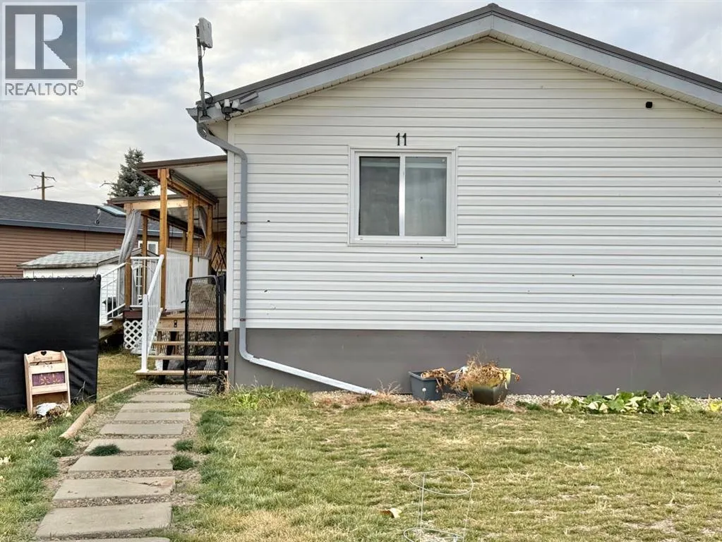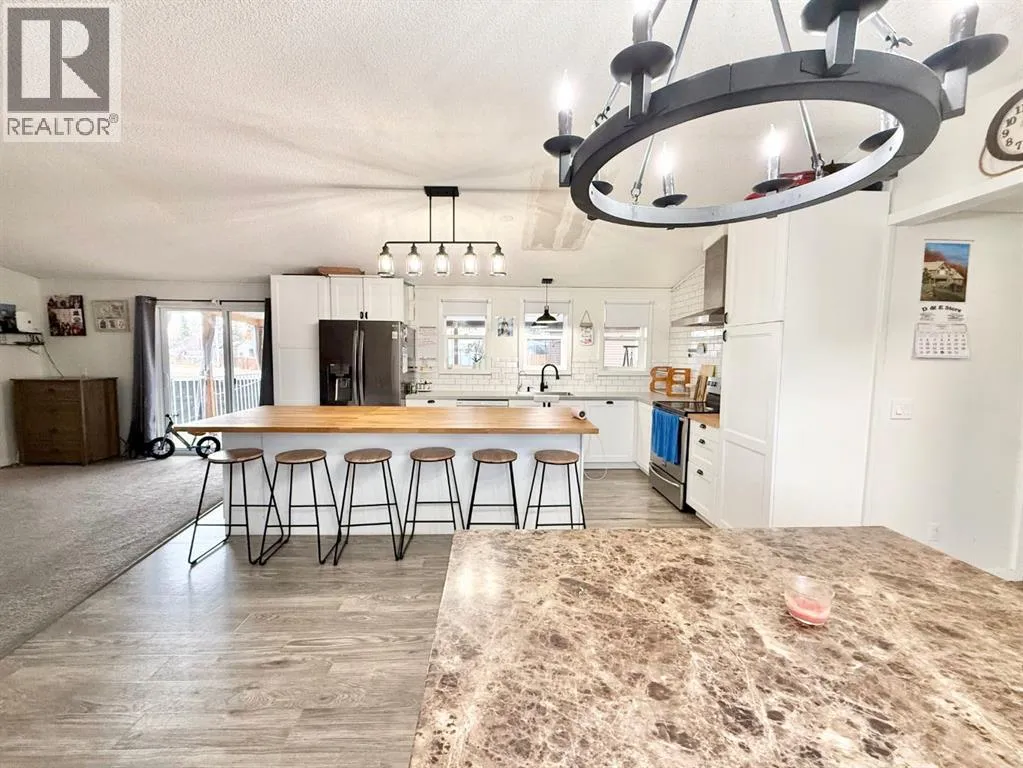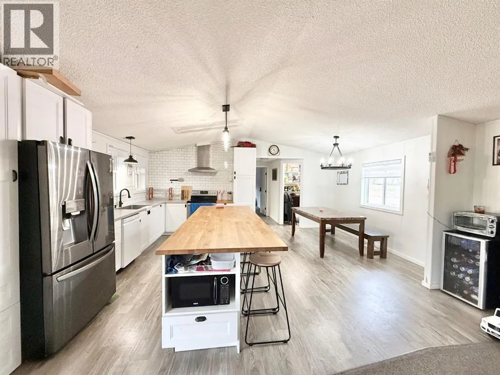 Welcome to this bright and beautiful mobile home in the friendly community of Rosemary, Alberta! Situated on owned land in a bare land condo-operated mobile home park, this property offers the benefits of ownership with the affordable condo fees that cover common area maintenance, community gardens and park management. This 3 bedroom, 2 bathroom home is the perfect blend of comfort, style and functionality. The spacious open-concept layout features a DREAM kitchen with a large island topped with butcher block countertop, an abundance of crisp white cabinetry, large dining area and a convenient walk in pantry - ideal for anyone who loves to cook or entertain. The front entry includes built in cubbies to keep everything tidy, and the laundry room adds extra practicality with a handy wash sink. The living area is bright and welcoming, filled with natural light and designed for easy modern living. At the back of the home, the large primary bedroom provides a king sized private retreat with a walk in closet and 4 piece ensuite. Another 4 piece bathroom and 2 additional bedrooms are located at the front of the home - one with its own walk-in closet! Outside, enjoy a fully fenced yard with handsome black chainlink fencing, a new fully permitted covered deck and plenty of space for relaxing or entertaining. Additional highlights include metal roof, insulated skirting, wall A/C unit and a water filtration system. This bright and inviting home is ready for its new owner - offering affordable living, small town charm and the pride of ownership in a great community! (id:27476)