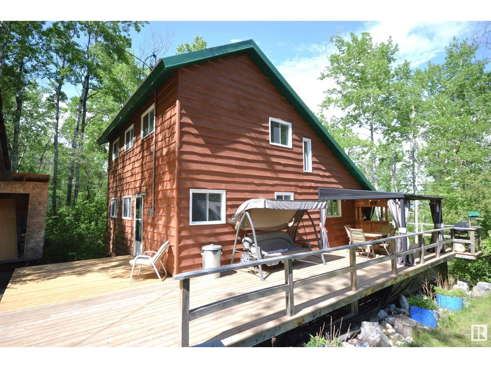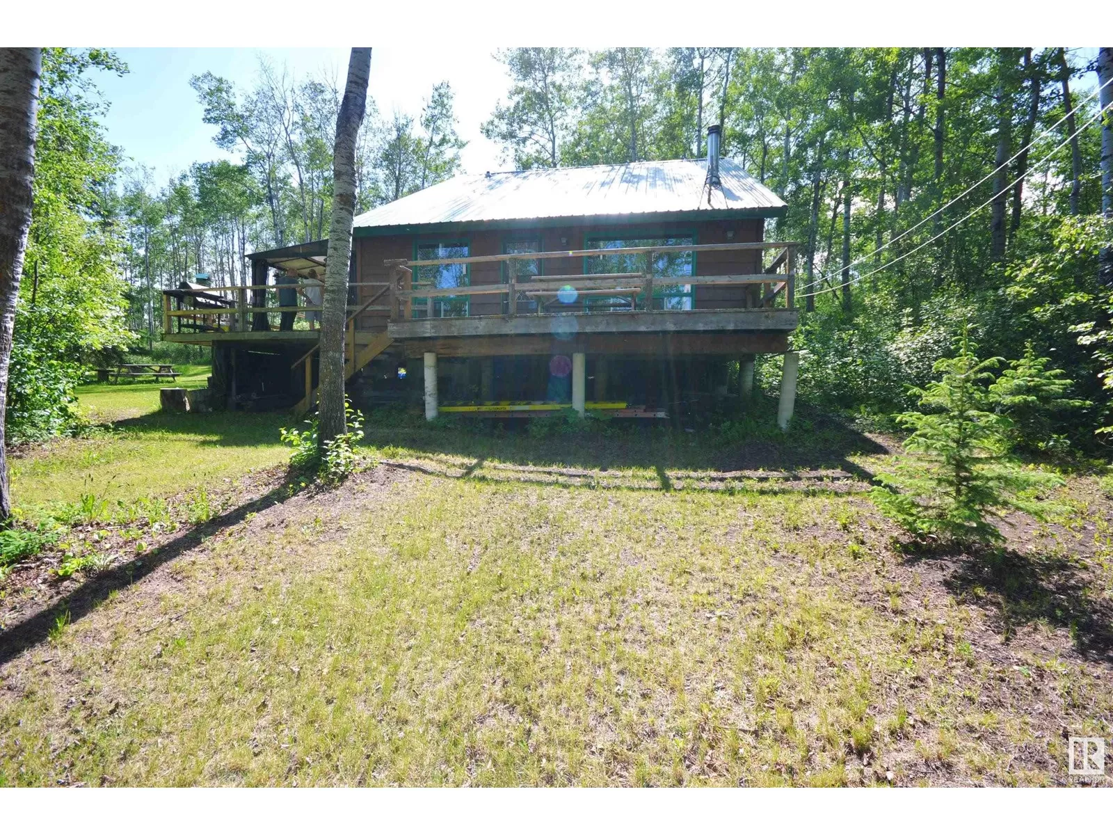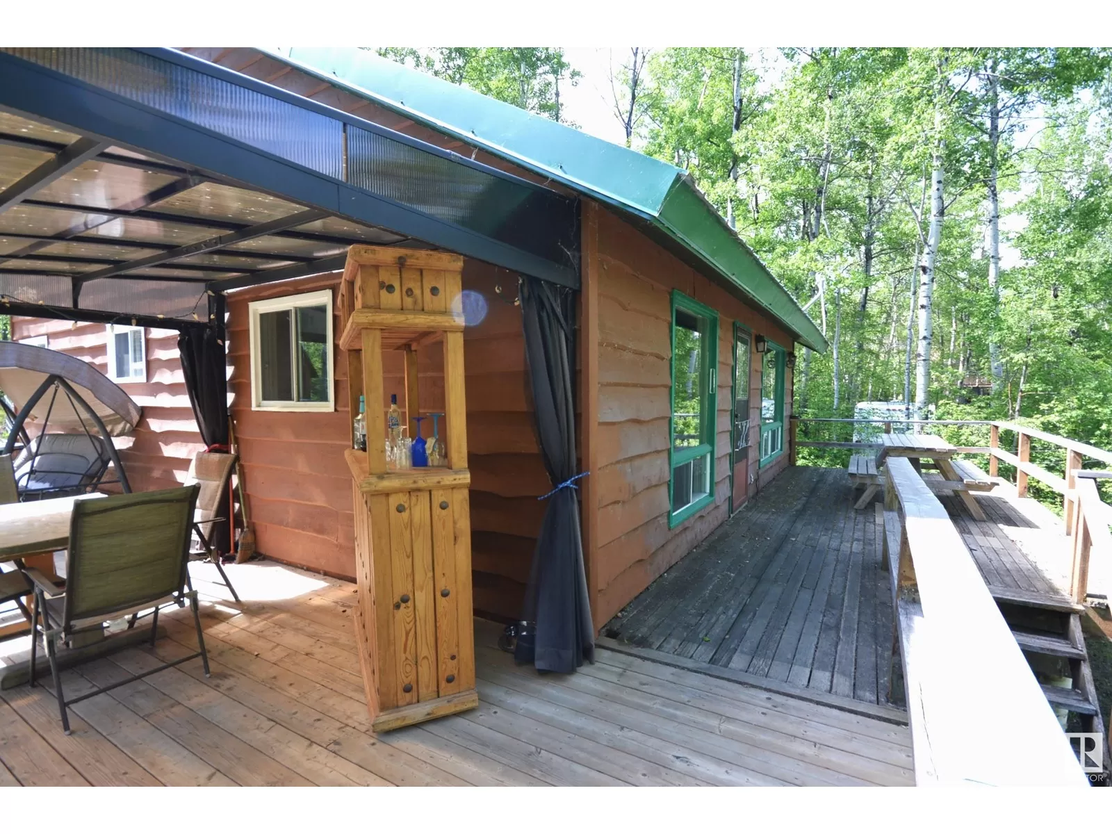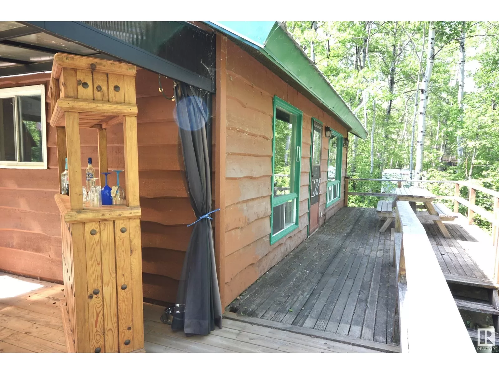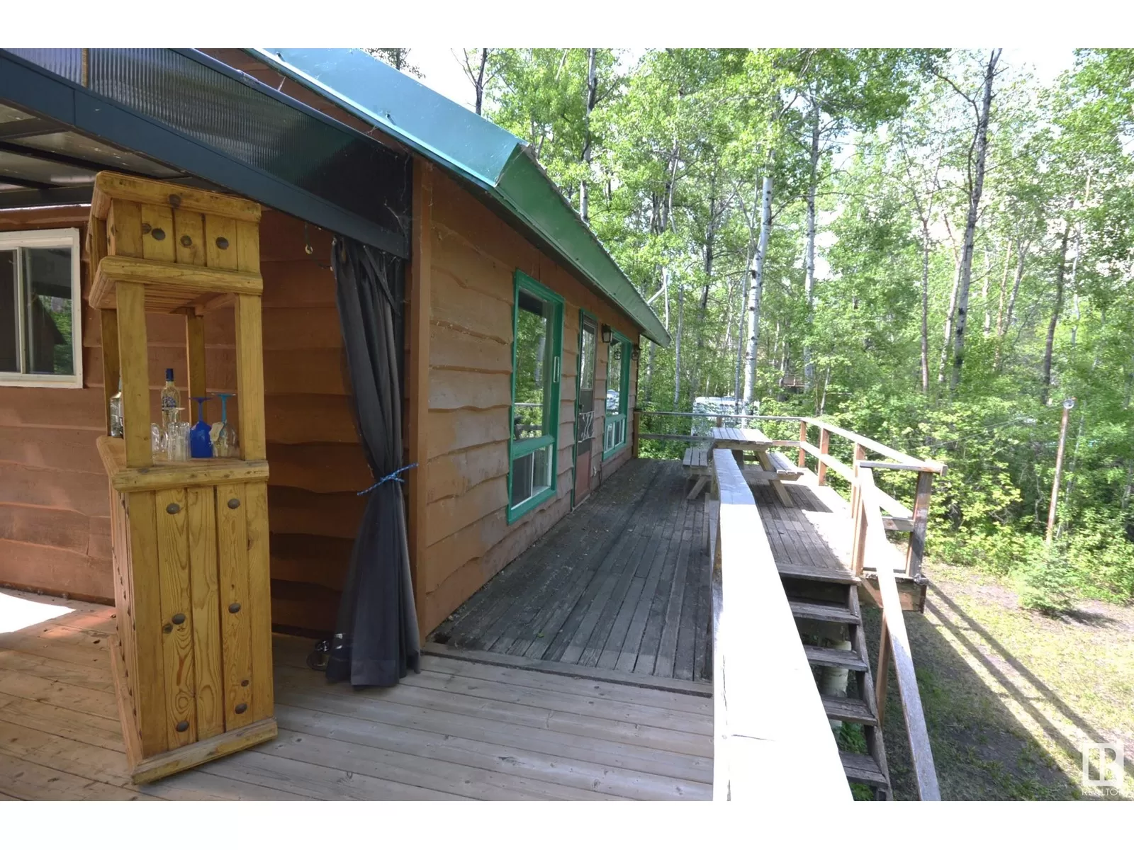 Recreational Cabin Retreat. ALL ITEMS STAY. Escape to nature, this charming 1.5-storey cabin, nestled on a private treed half-acre lot on the south side of Muriel Lake, just 2.5 hours NE Edmonton & 25 minutes south of Bonnyville. Built in 1980, offers rustic charm with modern comforts including power, a cistern water system, holding septic tank, and outhouse. Heated with the wood stove or electric space heaters. Inside you'll find a open concept full kitchen-family room, 1 main floor bedroom, bathroom, 2 upper-level bedrooms, all set under a vaulted cedar-shiplap ceiling that enhances the cabin's cozy atmosphere. Enjoy the expansive deck, tiki bar & table, with views of lake & treeD enclosed yard where there is a fire pit, room for campers/RVs, perfect for hosting family & friends! The lake's waterline has receded over the years, creating a 100-ft beachy area! POTENTIAL! The cabin sits on concrete pilings with easy crawlspace access, making it ideal for future winterization and YEAR ROUND LIVING. (id:27476)
