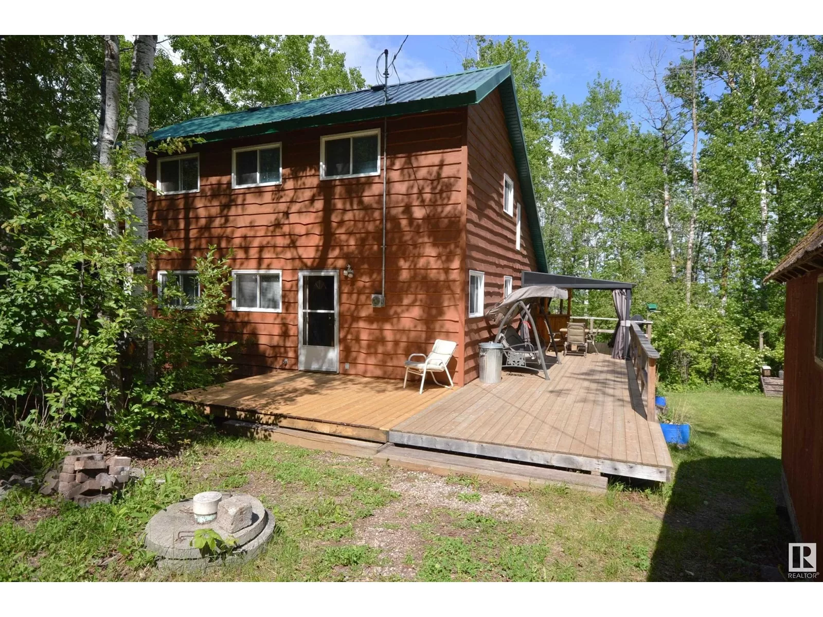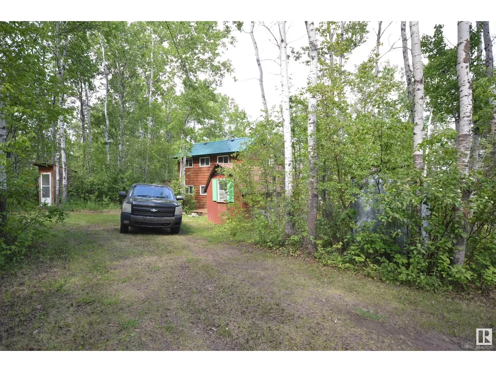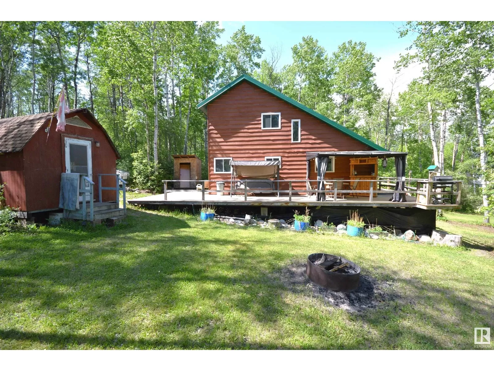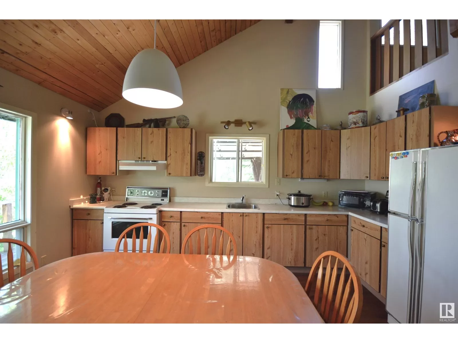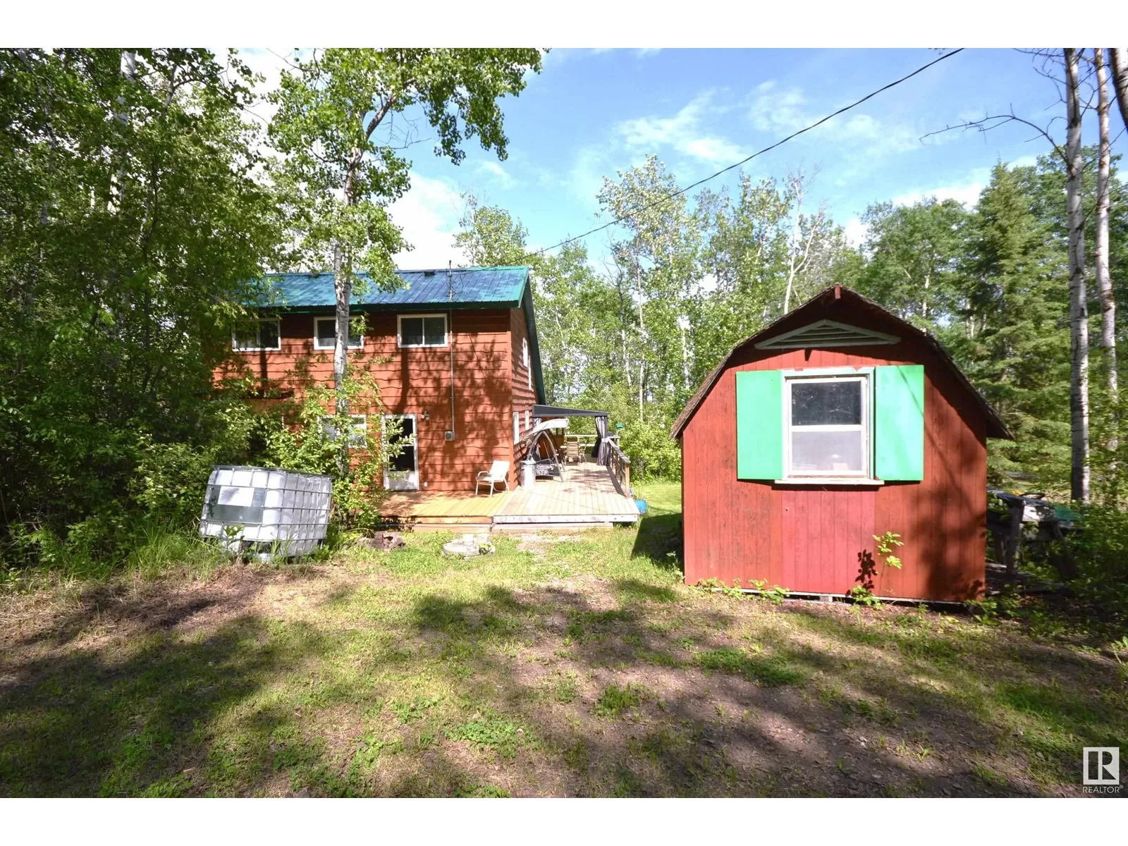 Recreational Cabin Retreat. ALL ITEMS STAY. Escape to nature, this charming 1.5-storey cabin, nestled on a private treed half-acre lot on the south side of Muriel Lake, just 2.5 hours NE Edmonton & 25 minutes south of Bonnyville. Built in 1980, offers rustic charm with modern comforts including power, a cistern water system, holding septic tank, and outhouse. Heated with the wood stove or electric space heaters. Inside you'll find a open concept full kitchen-family room, 1 main floor bedroom, bathroom, 2 upper-level bedrooms, all set under a vaulted cedar-shiplap ceiling that enhances the cabin's cozy atmosphere. Enjoy the expansive deck, tiki bar & table, with views of lake & treeD enclosed yard where there is a fire pit, room for campers/RVs, perfect for hosting family & friends! The lake's waterline has receded over the years, creating a 100-ft beachy area! POTENTIAL! The cabin sits on concrete pilings with easy crawlspace access, making it ideal for future winterization and YEAR ROUND LIVING. (id:27476)